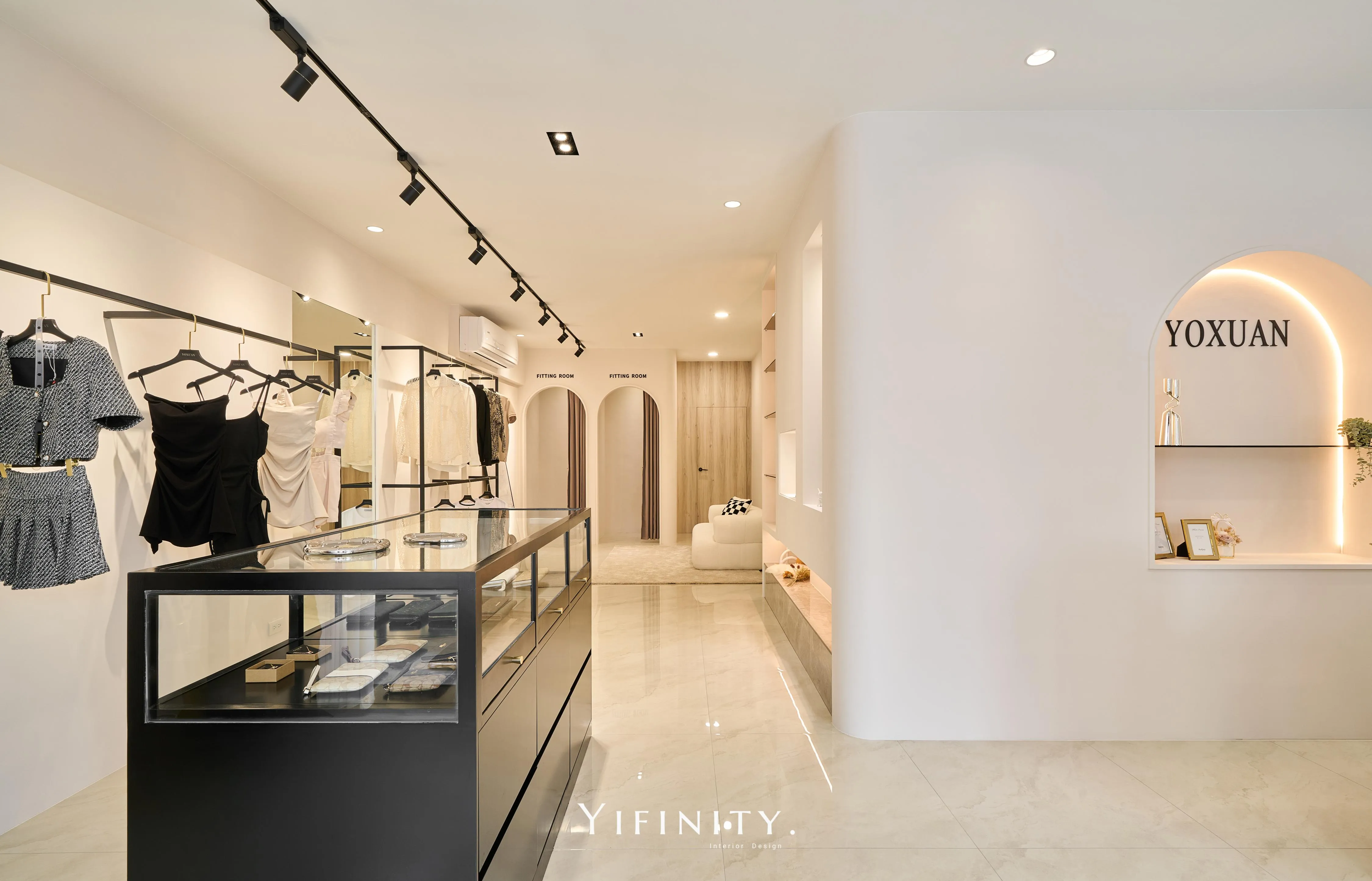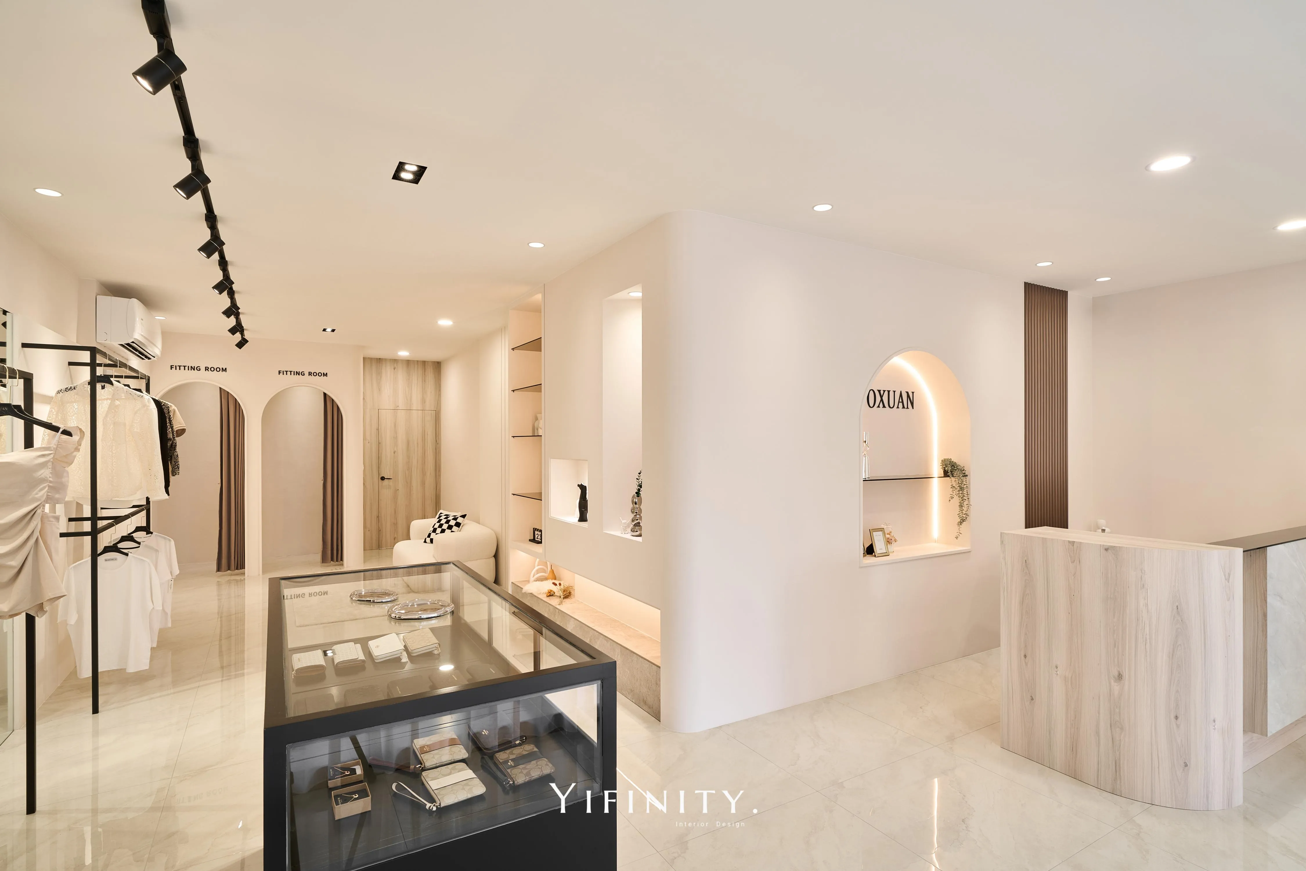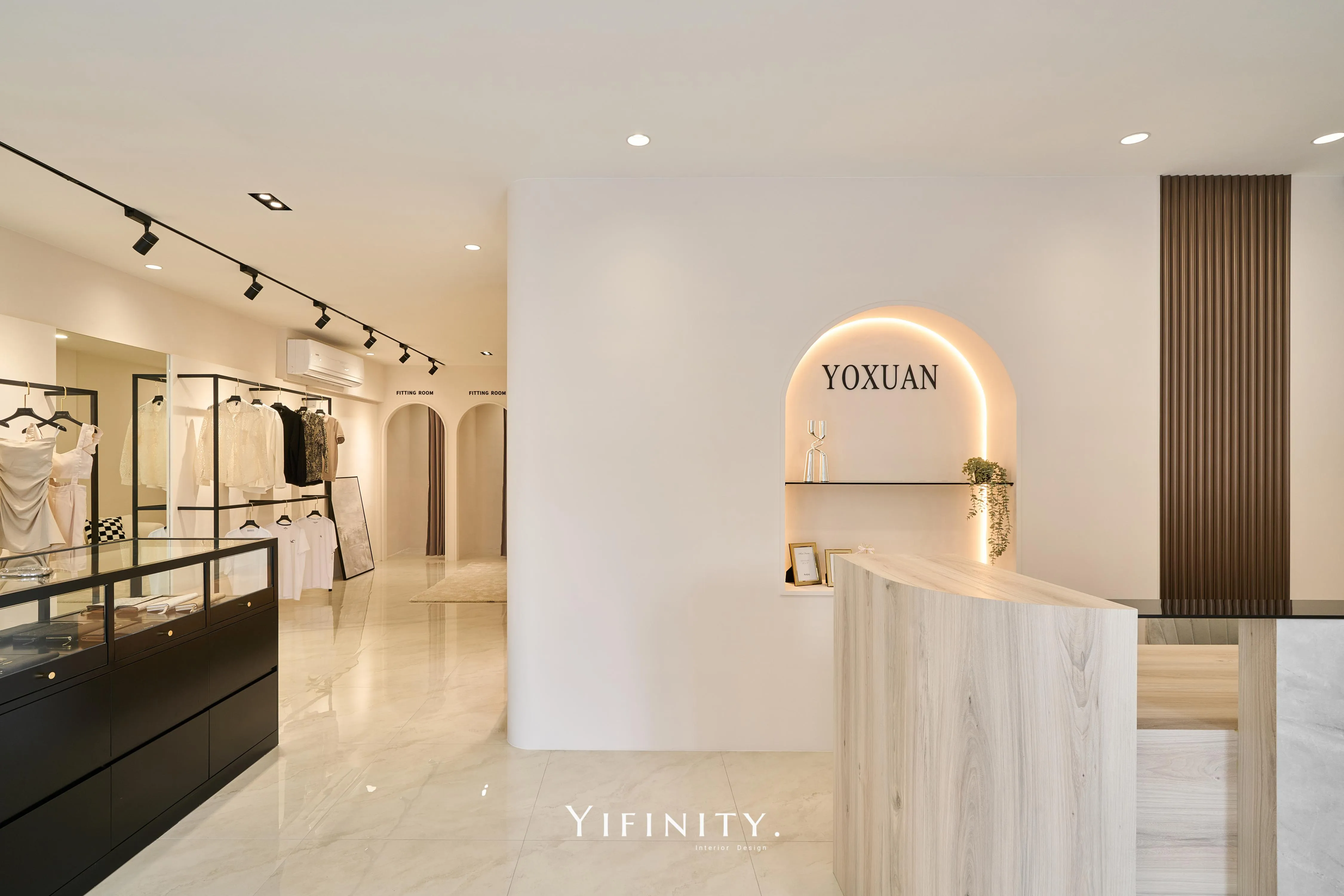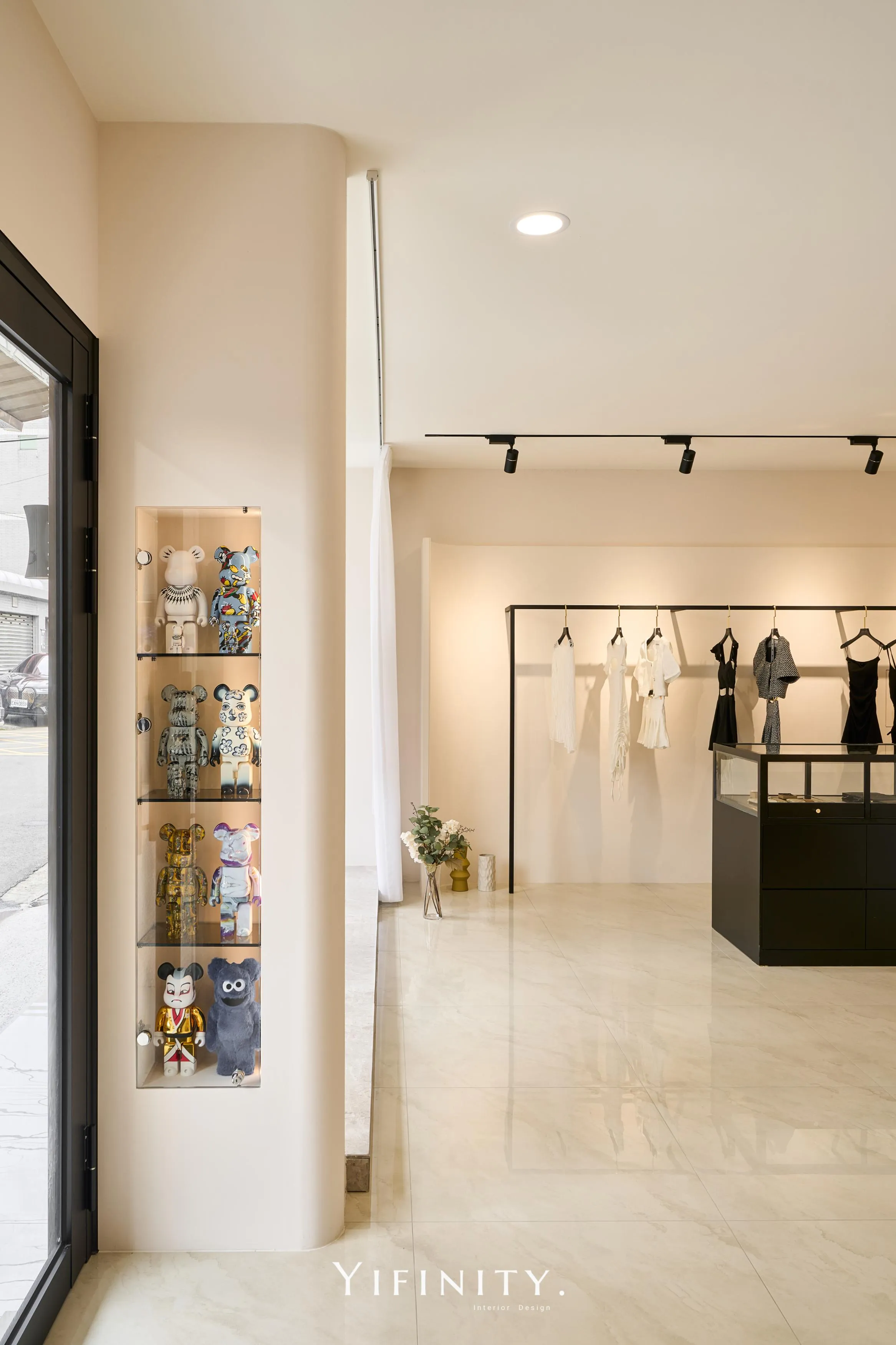 奶白,像一層柔光把街景收進室內。 大面玻璃讓日光走進來,弧形牆面與弧形轉角,把動線變得更溫柔、也更高級。 展示不再只是陳列,而是像專櫃一樣——有節奏、有留白、有被照顧的距離。 石紋地坪映出光感,深色強化玻璃檯面收束視覺;燈條像低調的珠光,讓每一件衣服都被好好看見。 在這裡,購物像走進一個乾淨、安靜、帶點小香氣質的日常儀式。