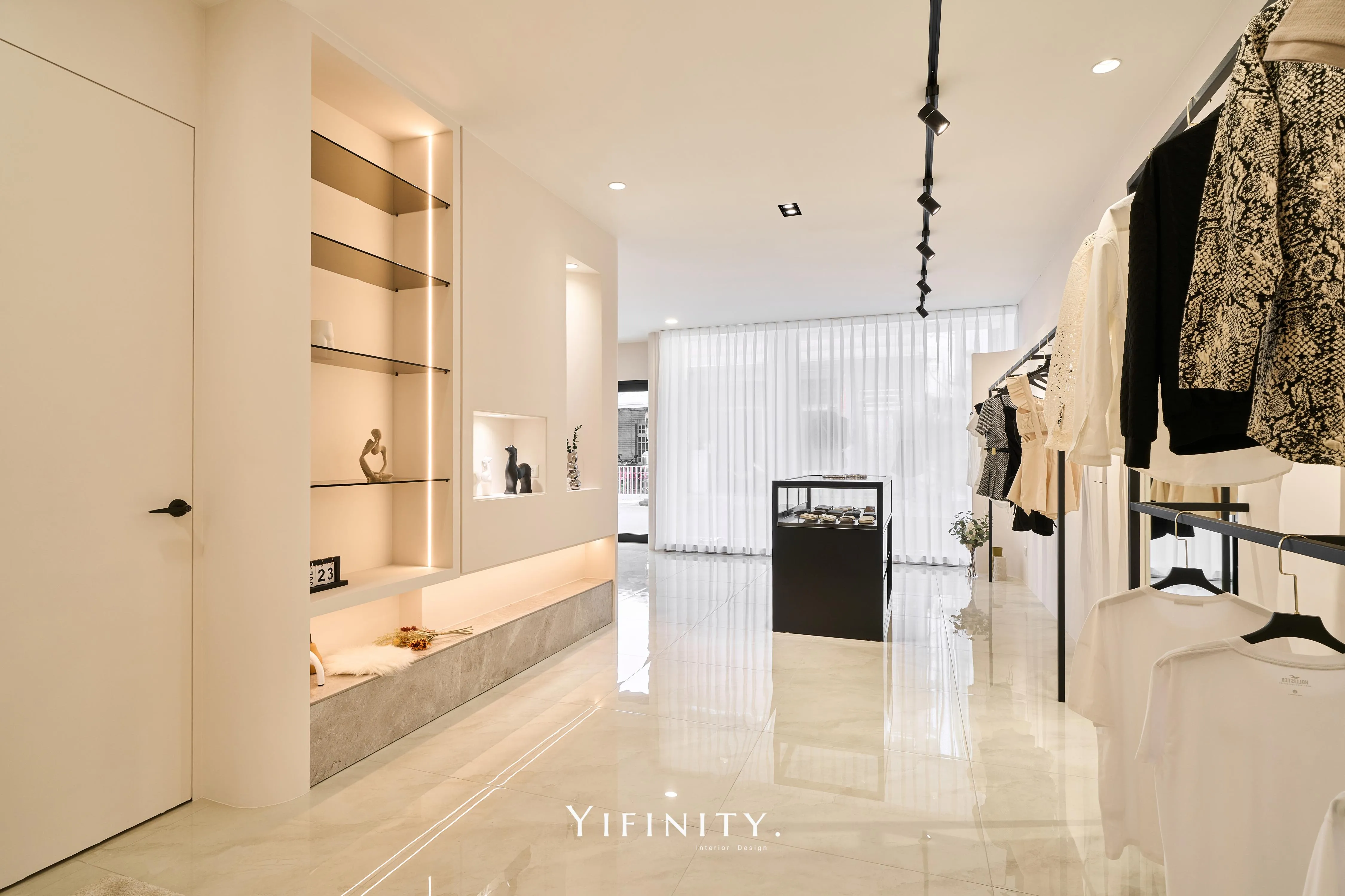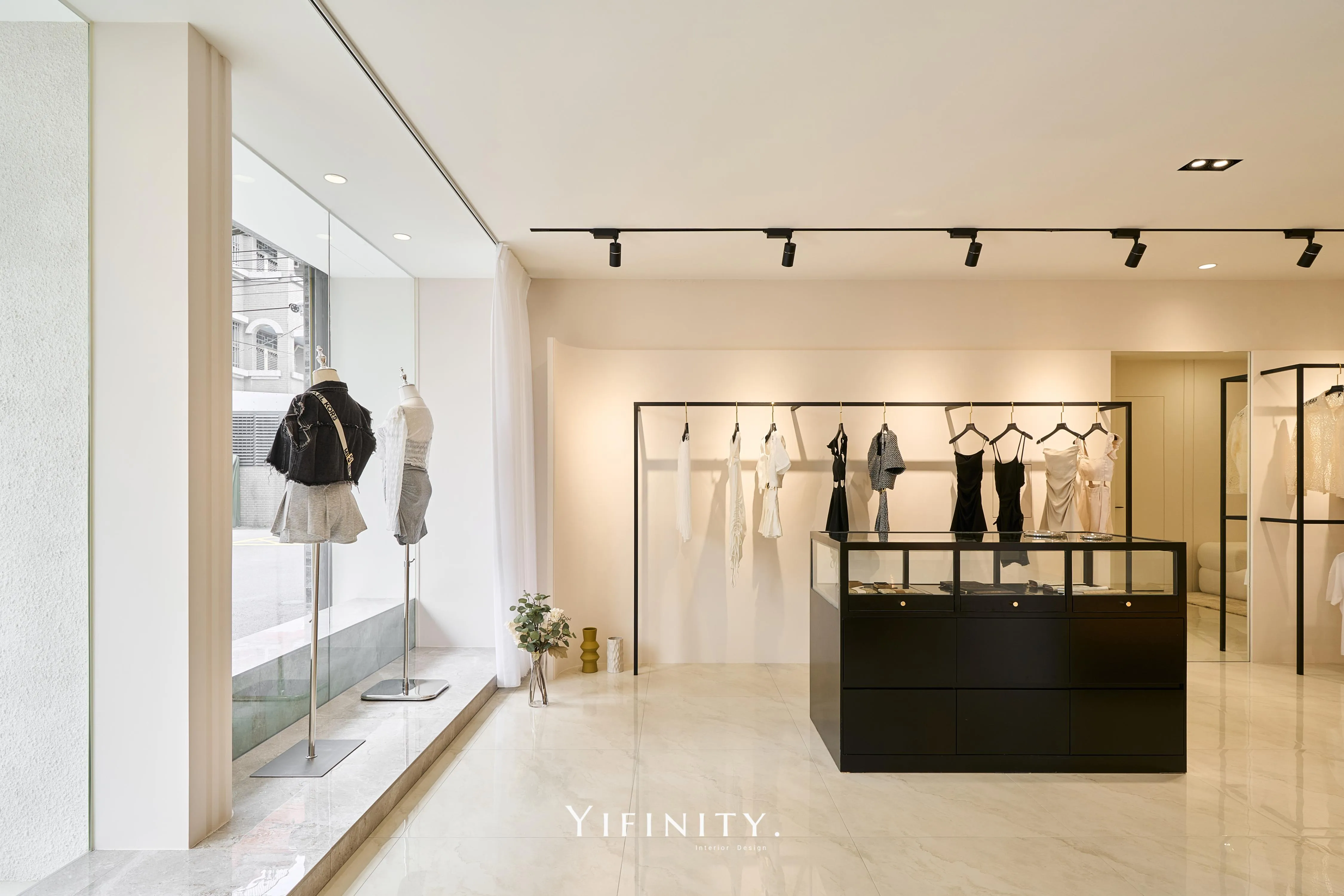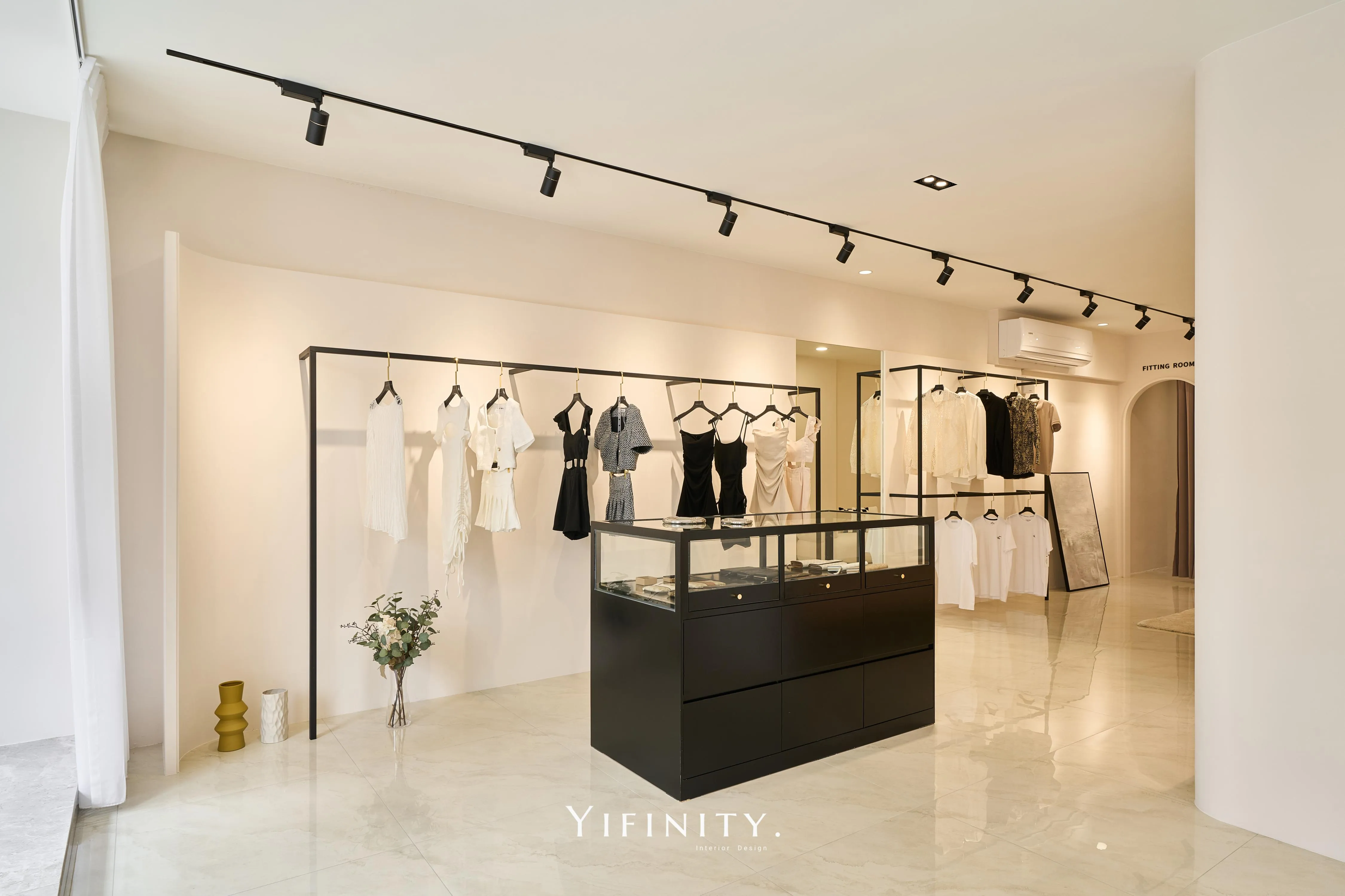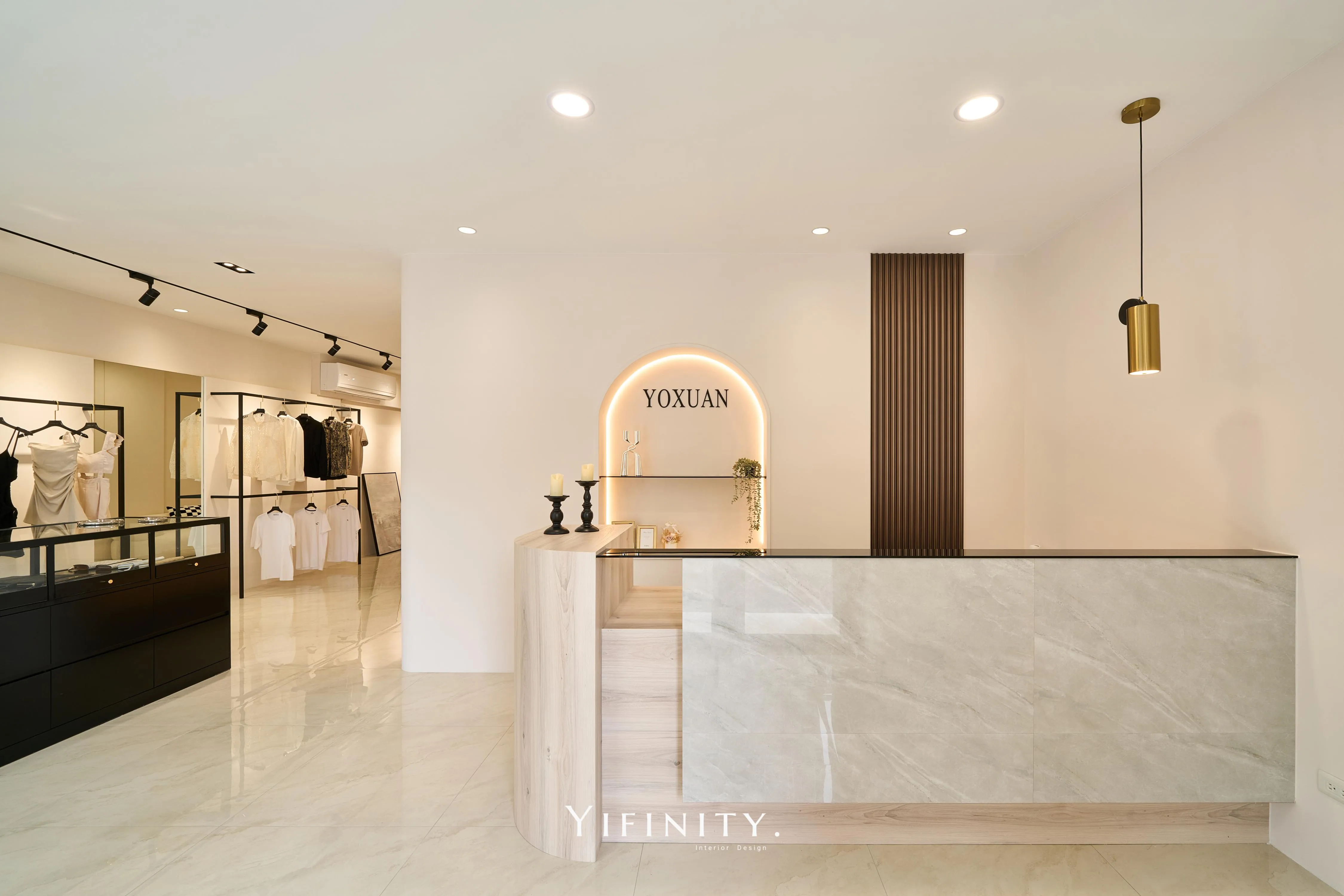 奶白,像一層柔光把街景收進室內。 大面玻璃讓日光走進來,弧形牆面與弧形轉角,把動線變得更溫柔、也更高級。 展示不再只是陳列,而是像專櫃一樣——有節奏、有留白、有被照顧的距離。 石紋地坪映出光感,深色強化玻璃檯面收束視覺;燈條像低調的珠光,讓每一件衣服都被好好看見。 在這裡,購物像走進一個乾淨、安靜、帶點小香氣質的日常儀式。