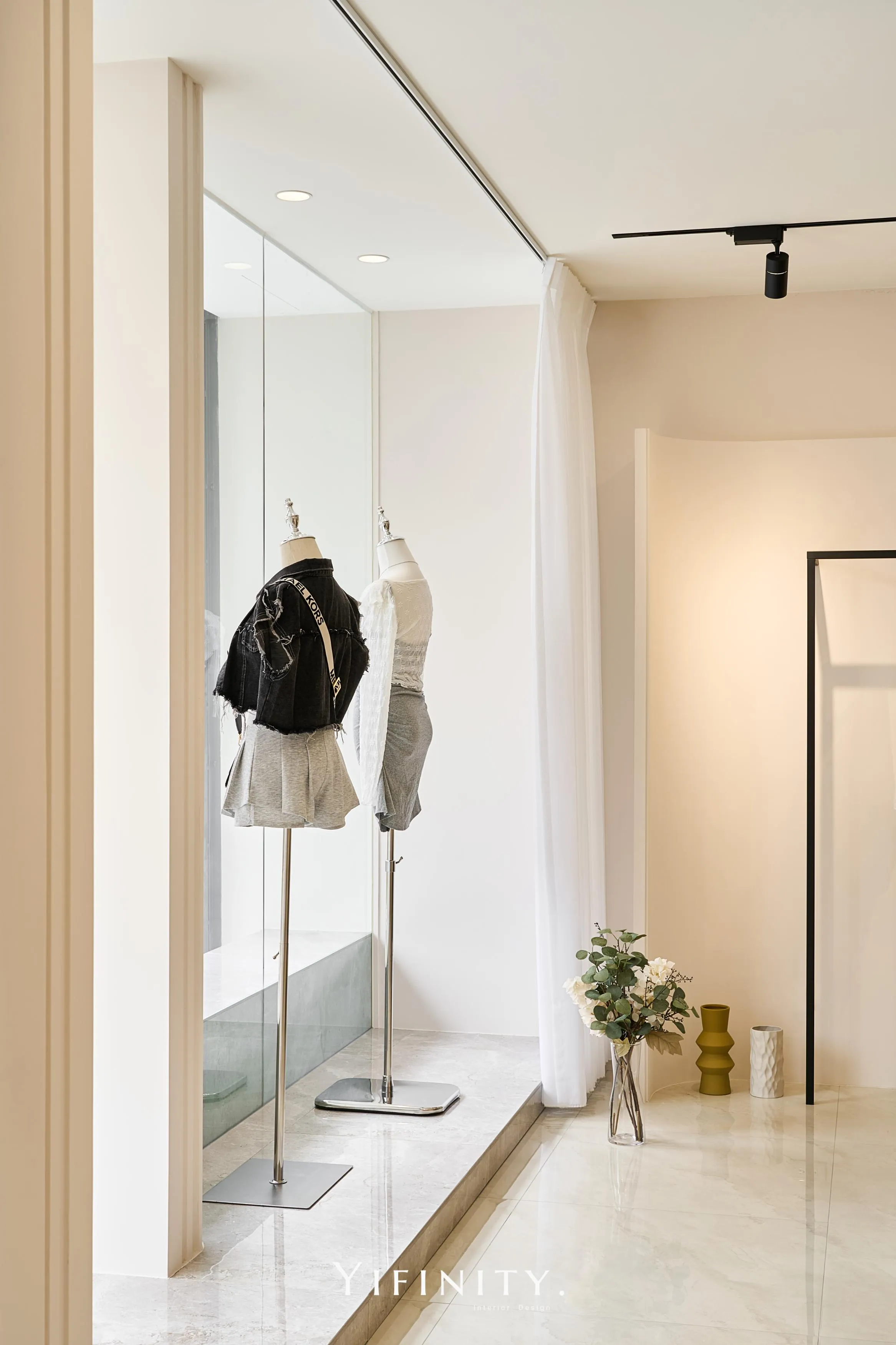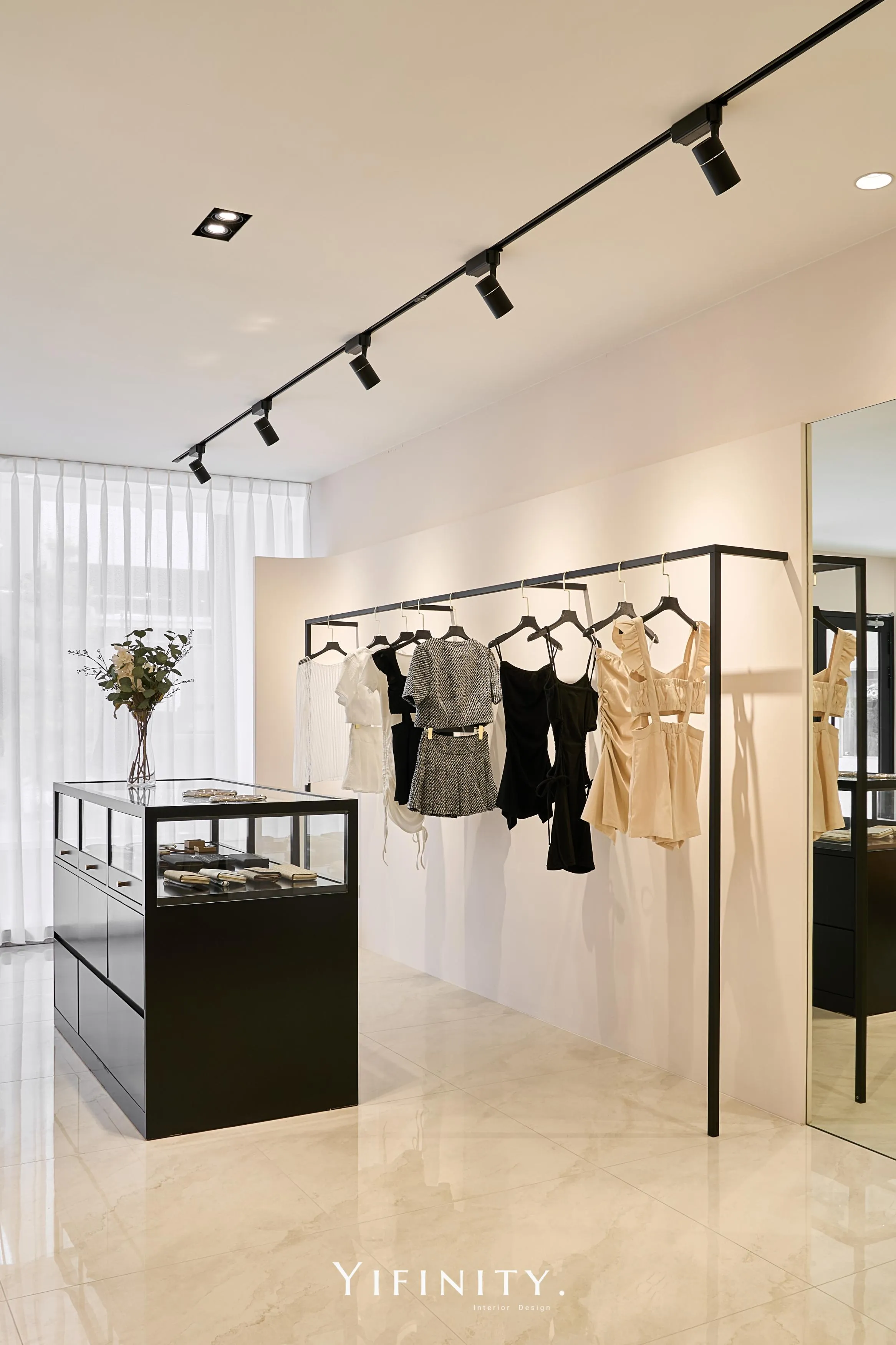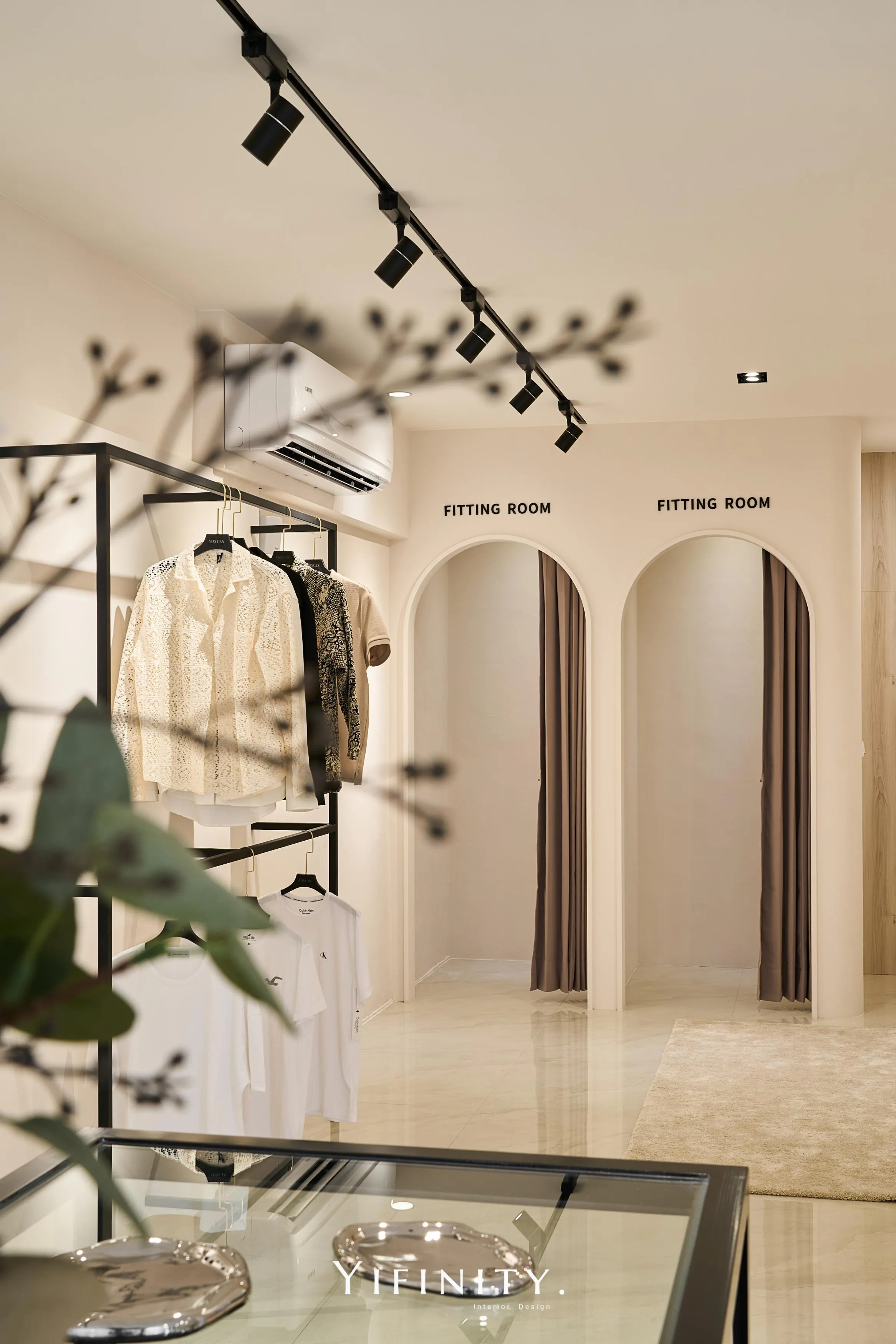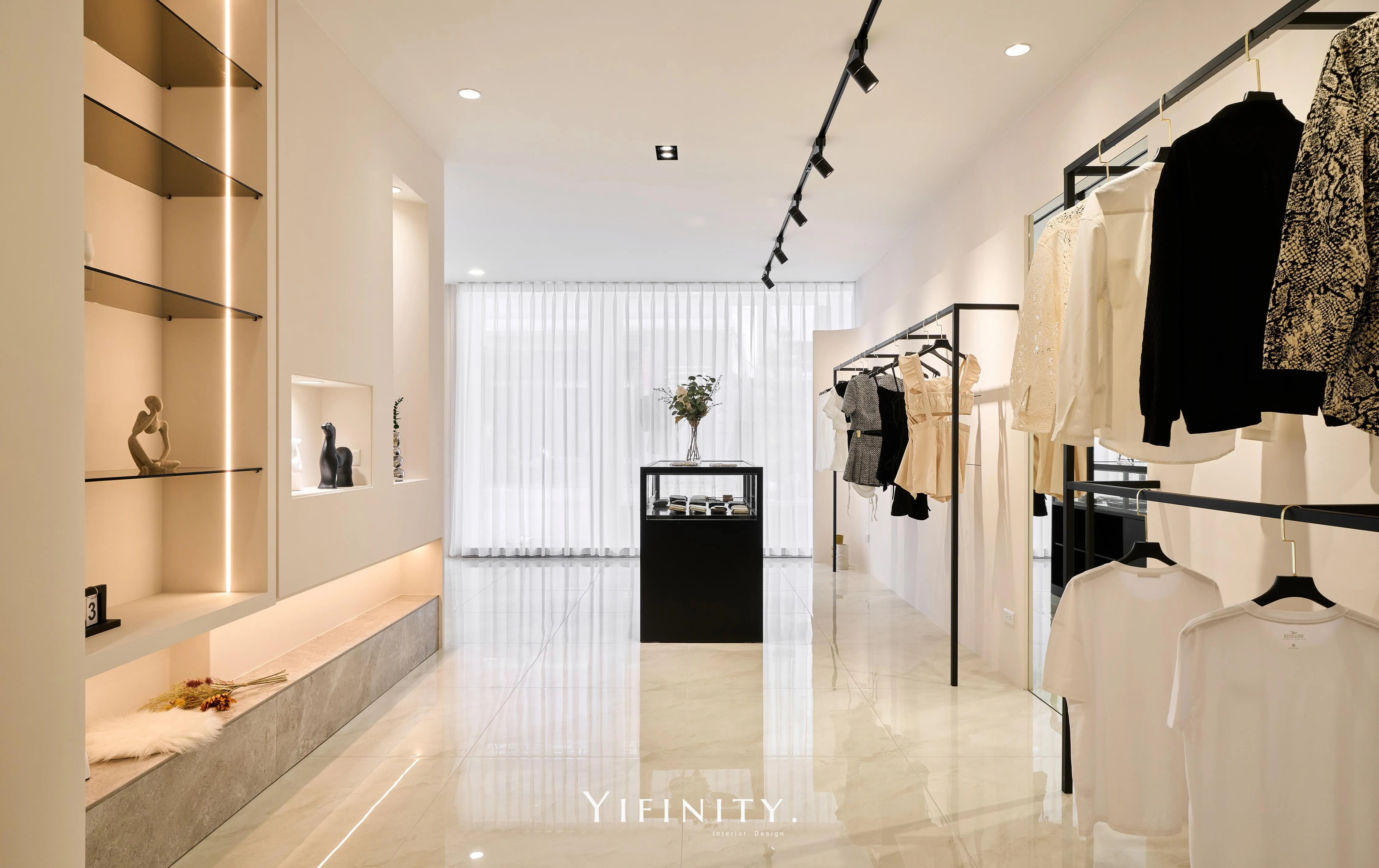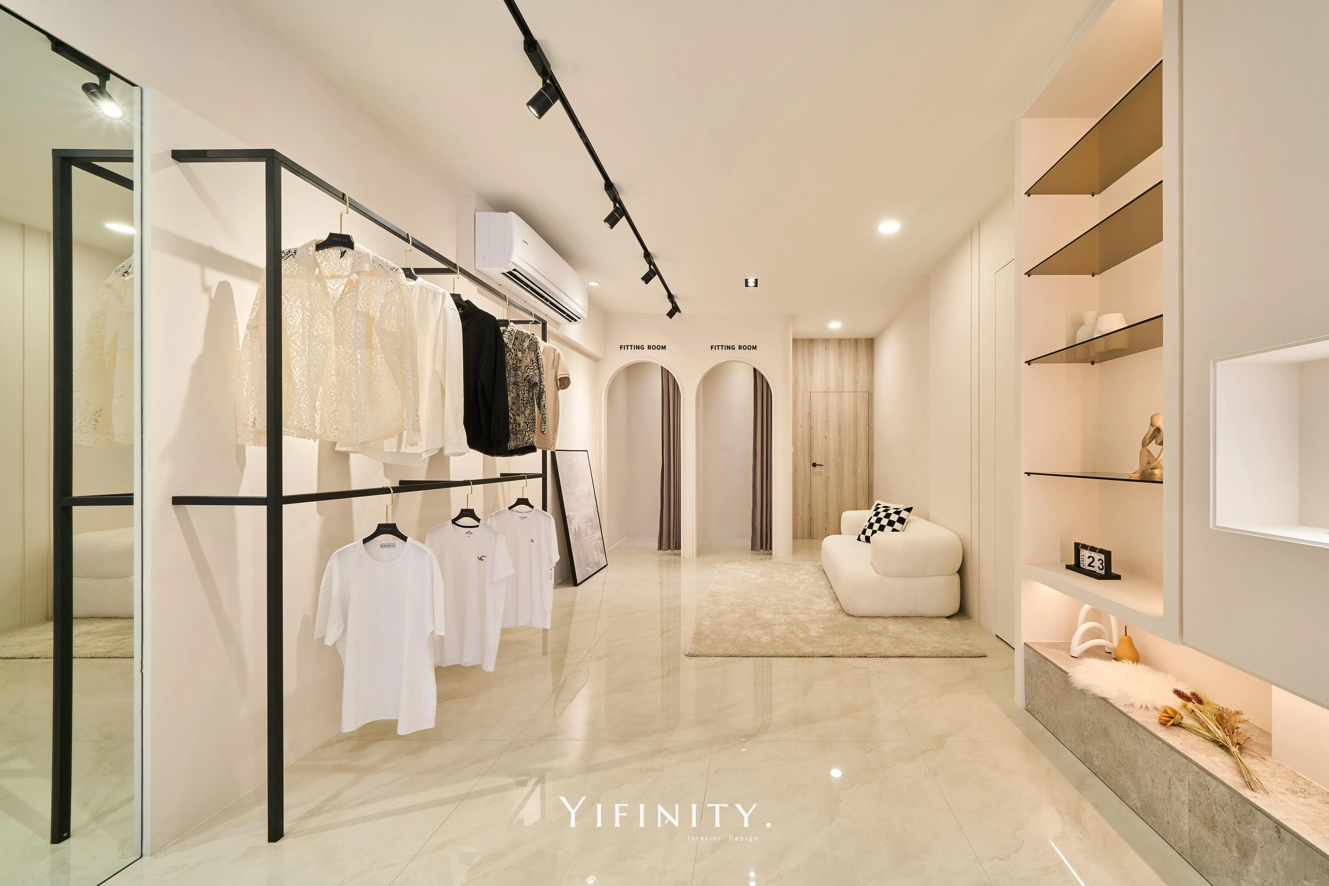 奶白,像一層柔光把街景收進室內。 大面玻璃讓日光走進來,弧形牆面與弧形轉角,把動線變得更溫柔、也更高級。 展示不再只是陳列,而是像專櫃一樣——有節奏、有留白、有被照顧的距離。 石紋地坪映出光感,深色強化玻璃檯面收束視覺;燈條像低調的珠光,讓每一件衣服都被好好看見。 在這裡,購物像走進一個乾淨、安靜、帶點小香氣質的日常儀式。