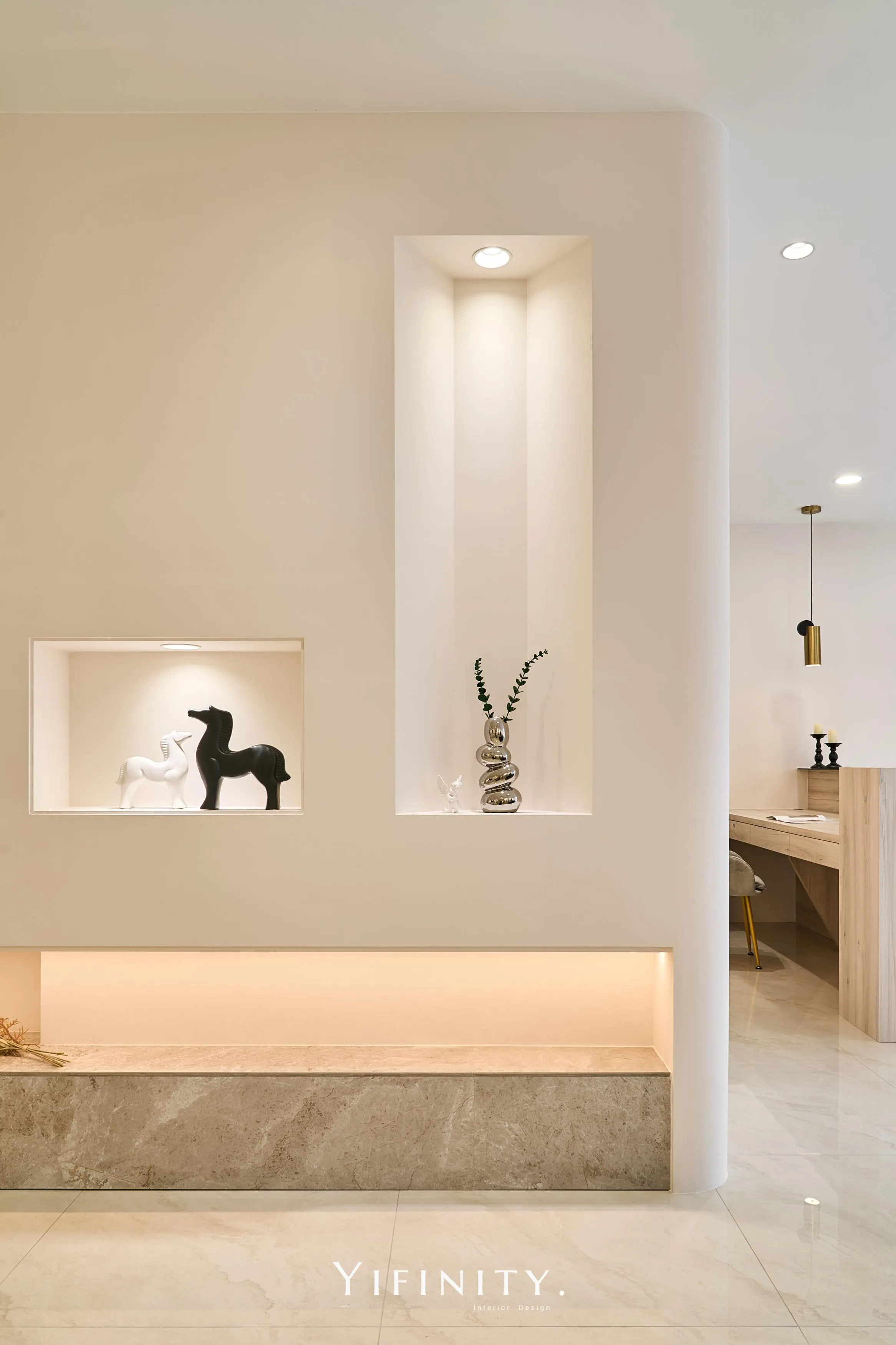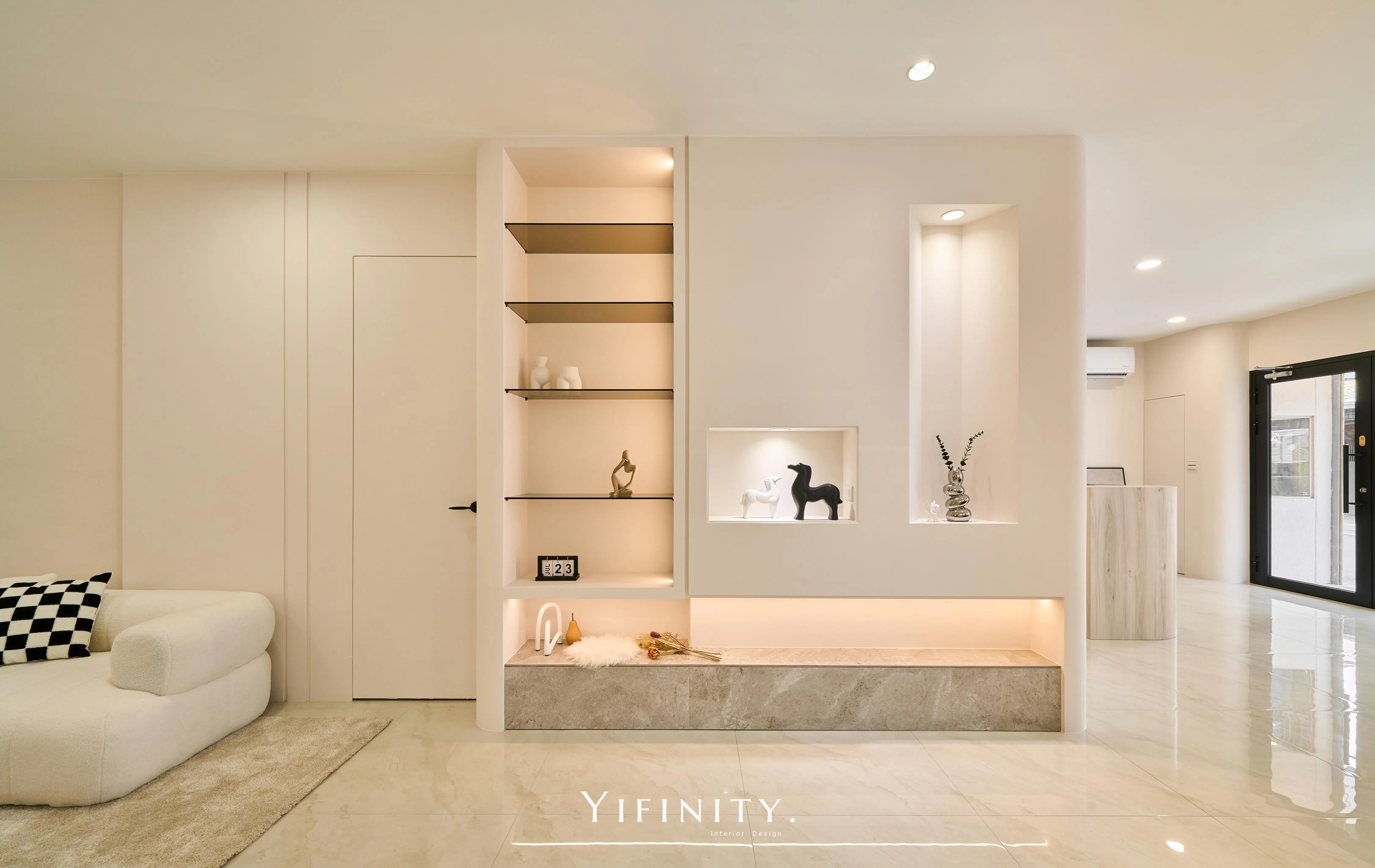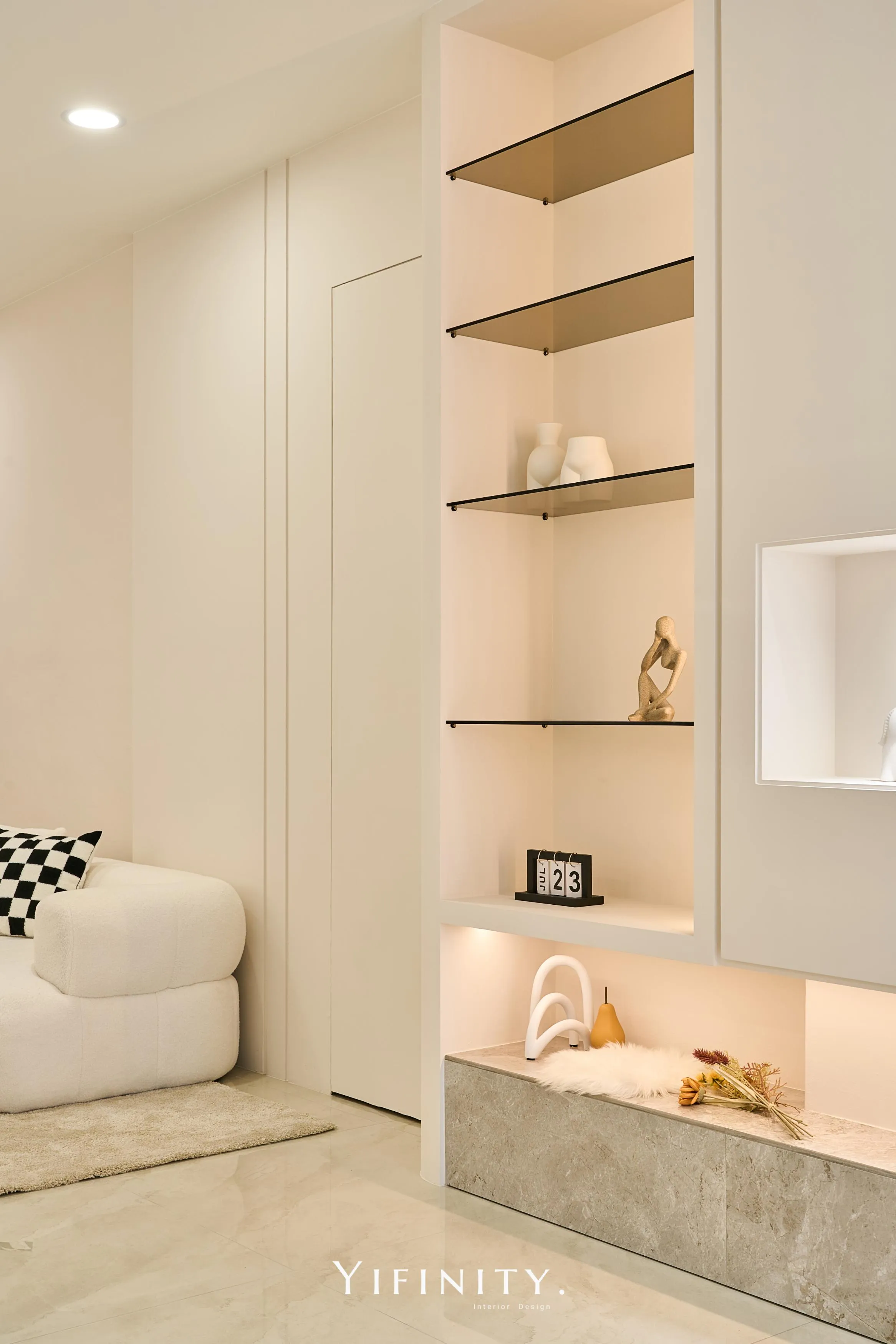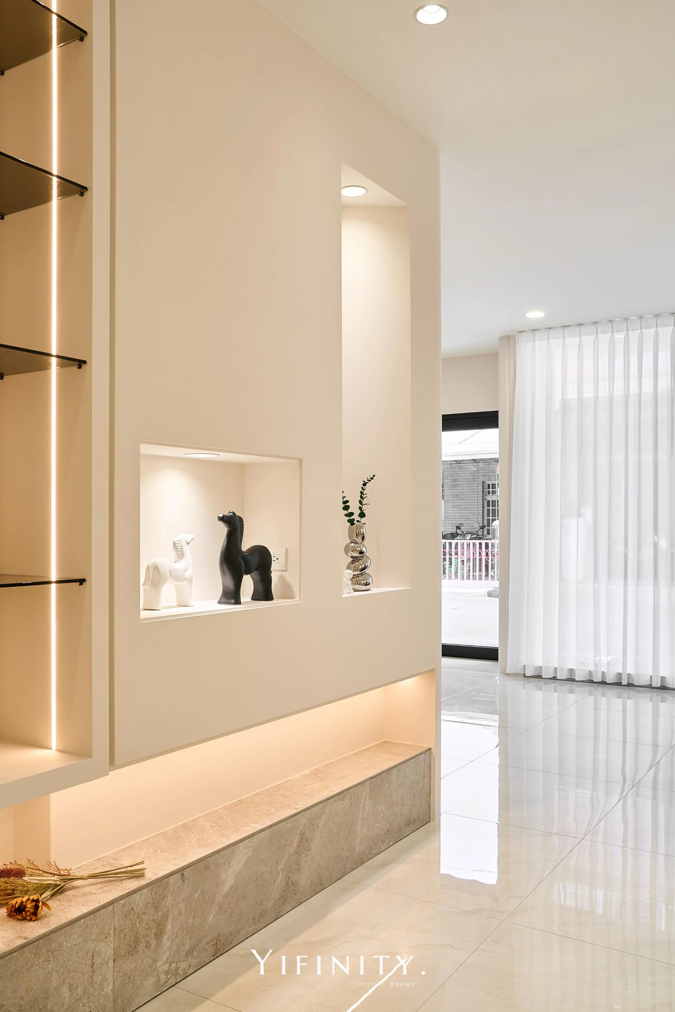 奶白,像一層柔光把街景收進室內。 大面玻璃讓日光走進來,弧形牆面與弧形轉角,把動線變得更溫柔、也更高級。 展示不再只是陳列,而是像專櫃一樣——有節奏、有留白、有被照顧的距離。 石紋地坪映出光感,深色強化玻璃檯面收束視覺;燈條像低調的珠光,讓每一件衣服都被好好看見。 在這裡,購物像走進一個乾淨、安靜、帶點小香氣質的日常儀式。