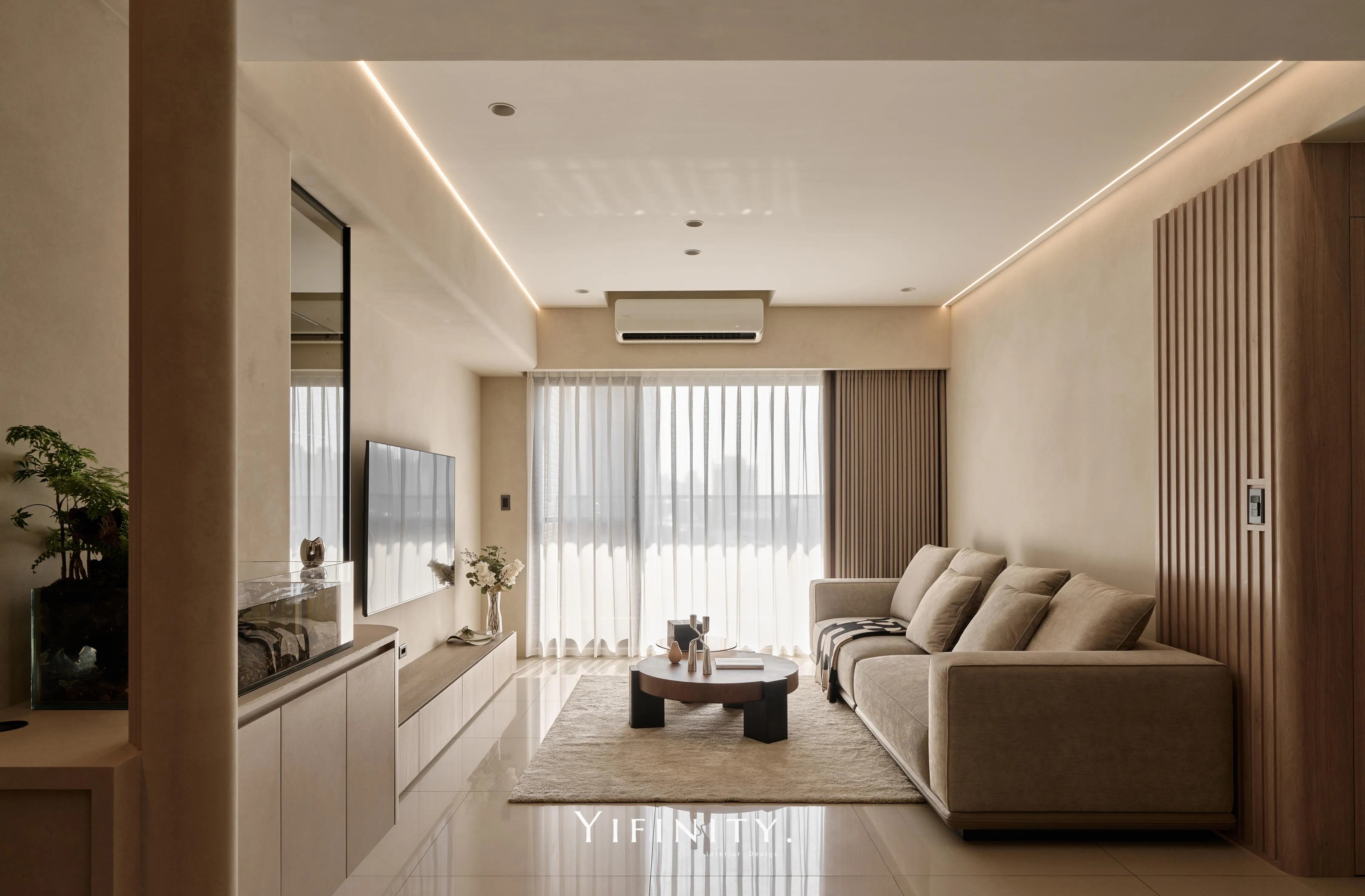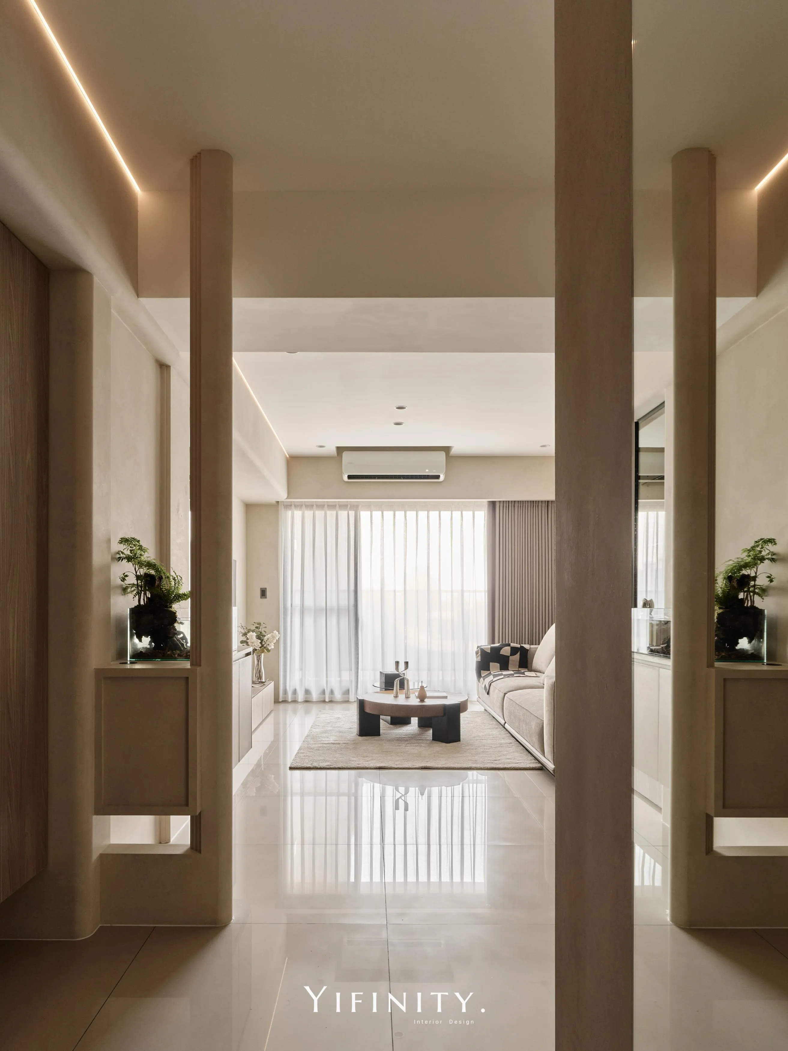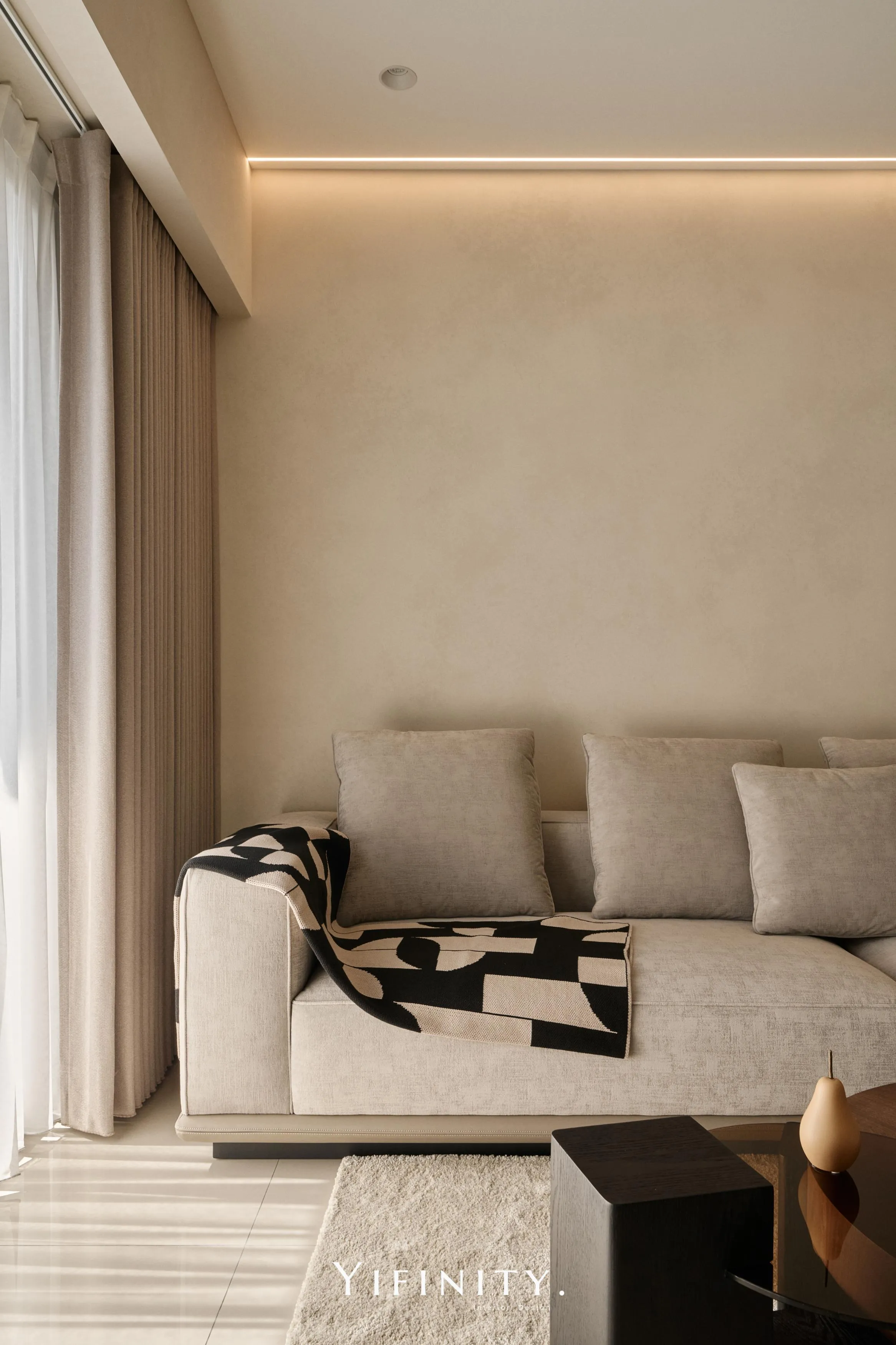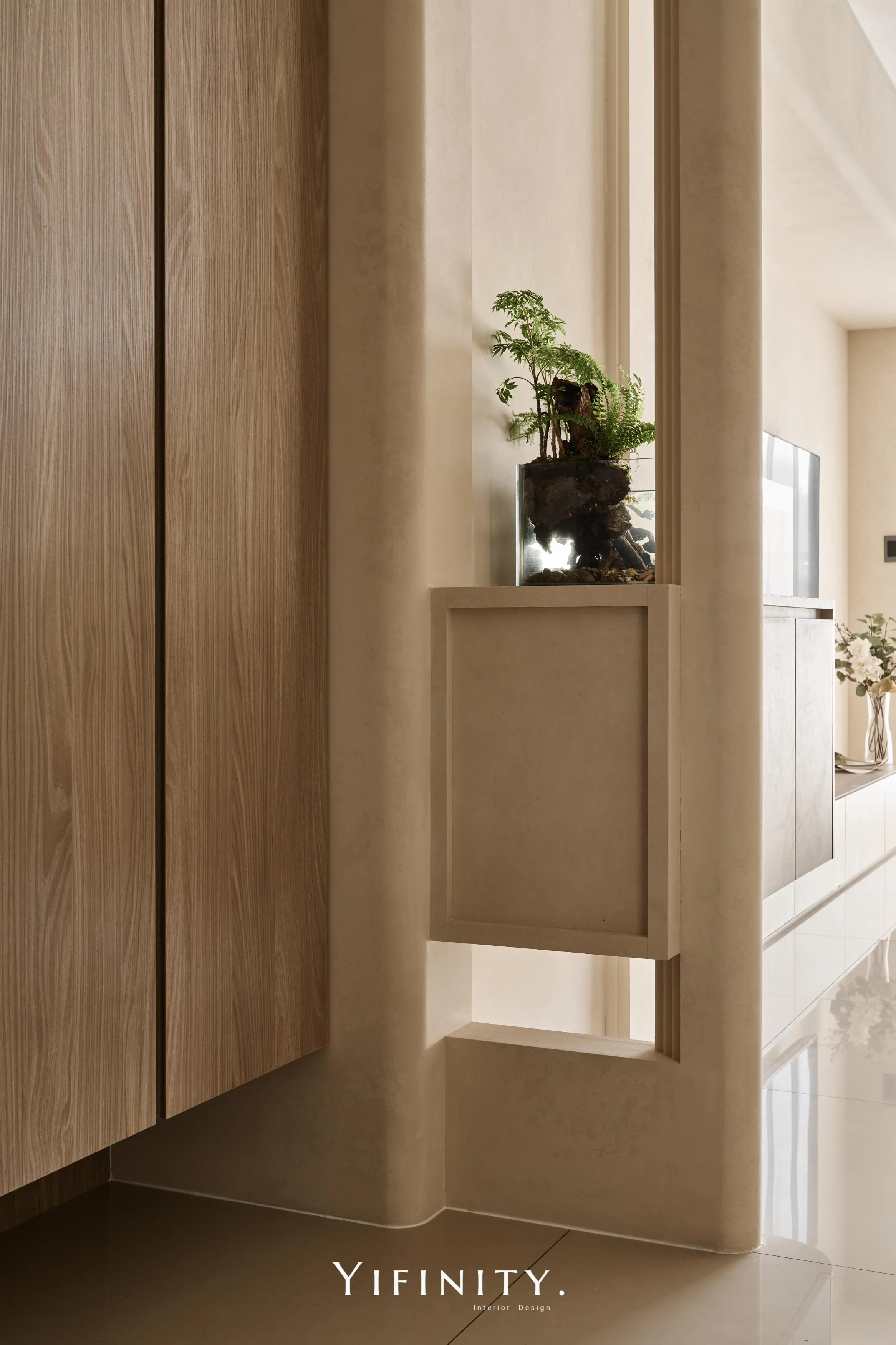 當大地色系漫過空間,家便有了如土壤般厚實且安定的力量。 捨棄了光滑的平整,牆面披上了帶有手感紋理的特殊塗料; 在日光的撫觸下,展現出樸質而細膩的表情。 圓潤的立柱靜立於動線樞紐,不僅界定了場域,更如同一道框景,將生活的畫面輕輕收攏。 溫潤的木格柵與天際線的柔光相互呼應,堆疊出豐富的層次。 在這片燕麥色的溫柔裡,沒有喧囂的視覺干擾,只有赤腳踩踏時的自在,與歲月靜好的悠長餘韻。