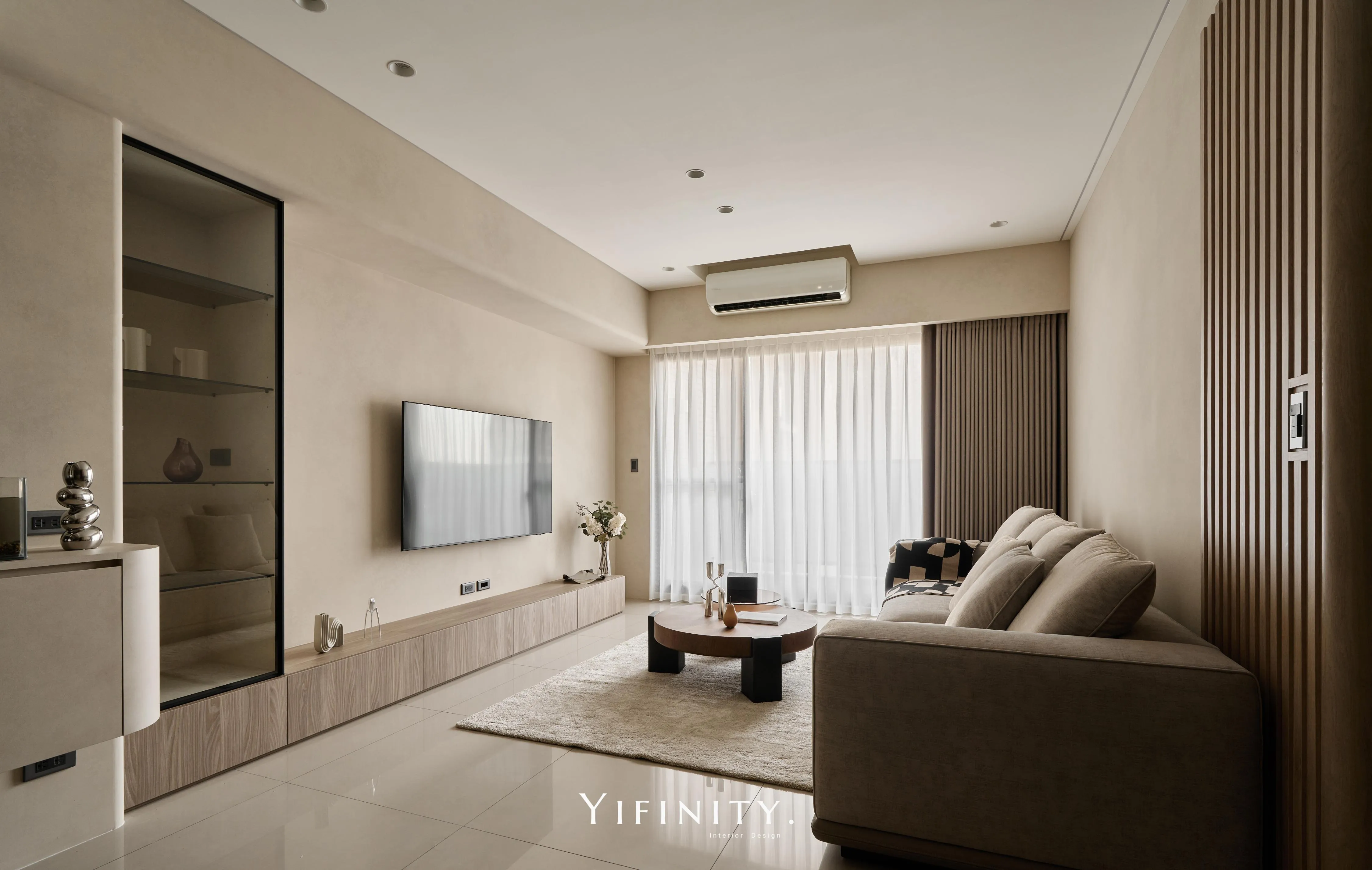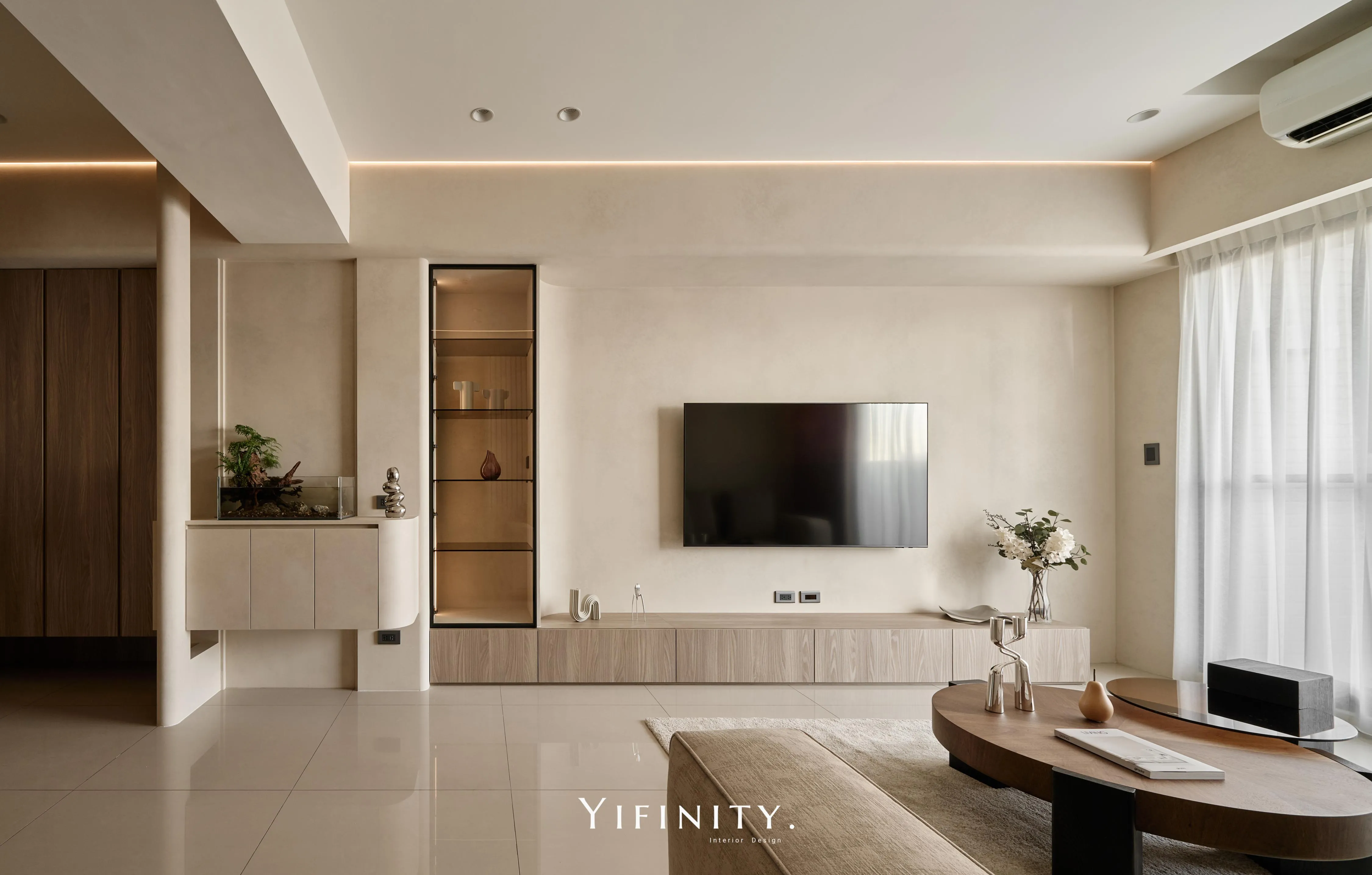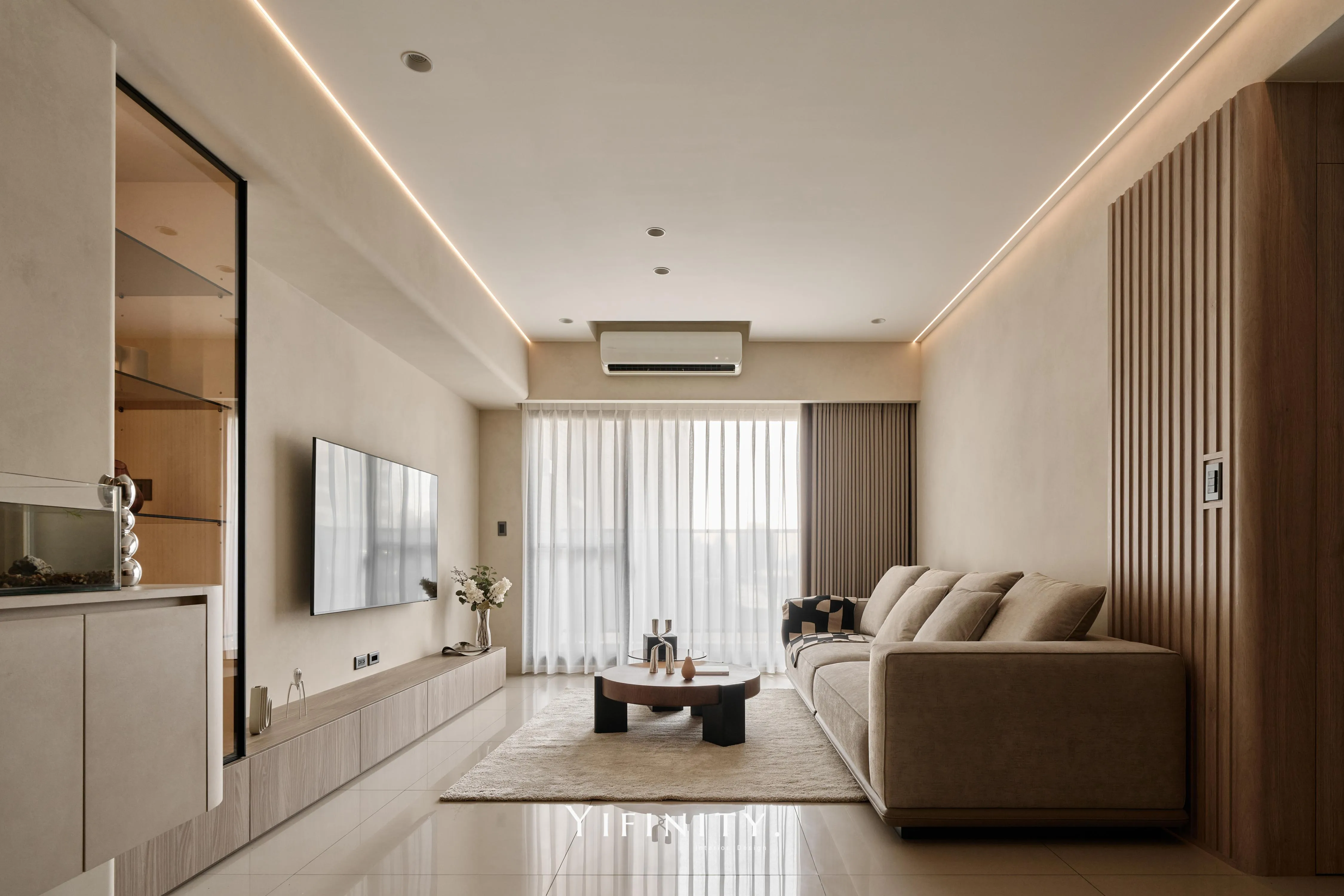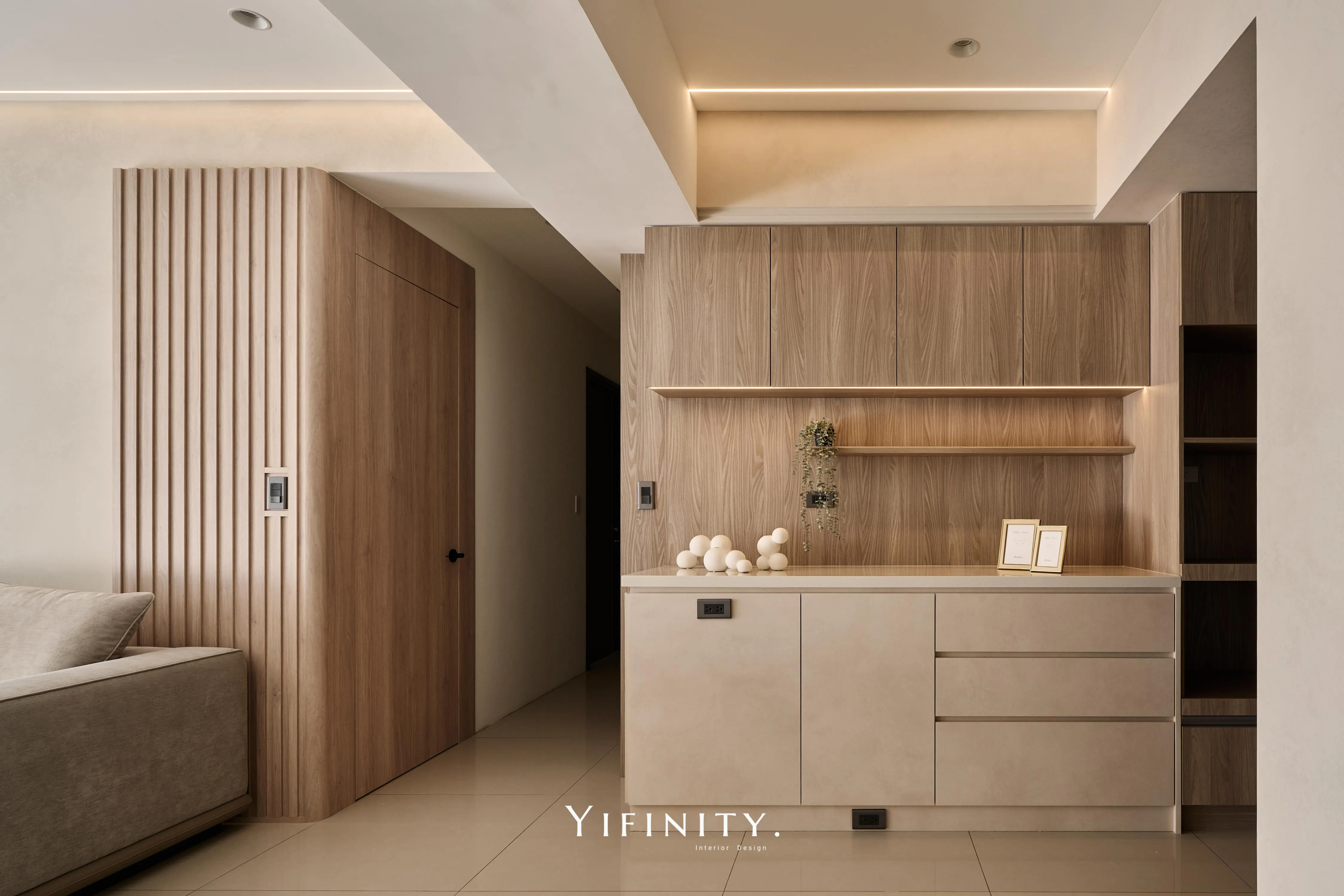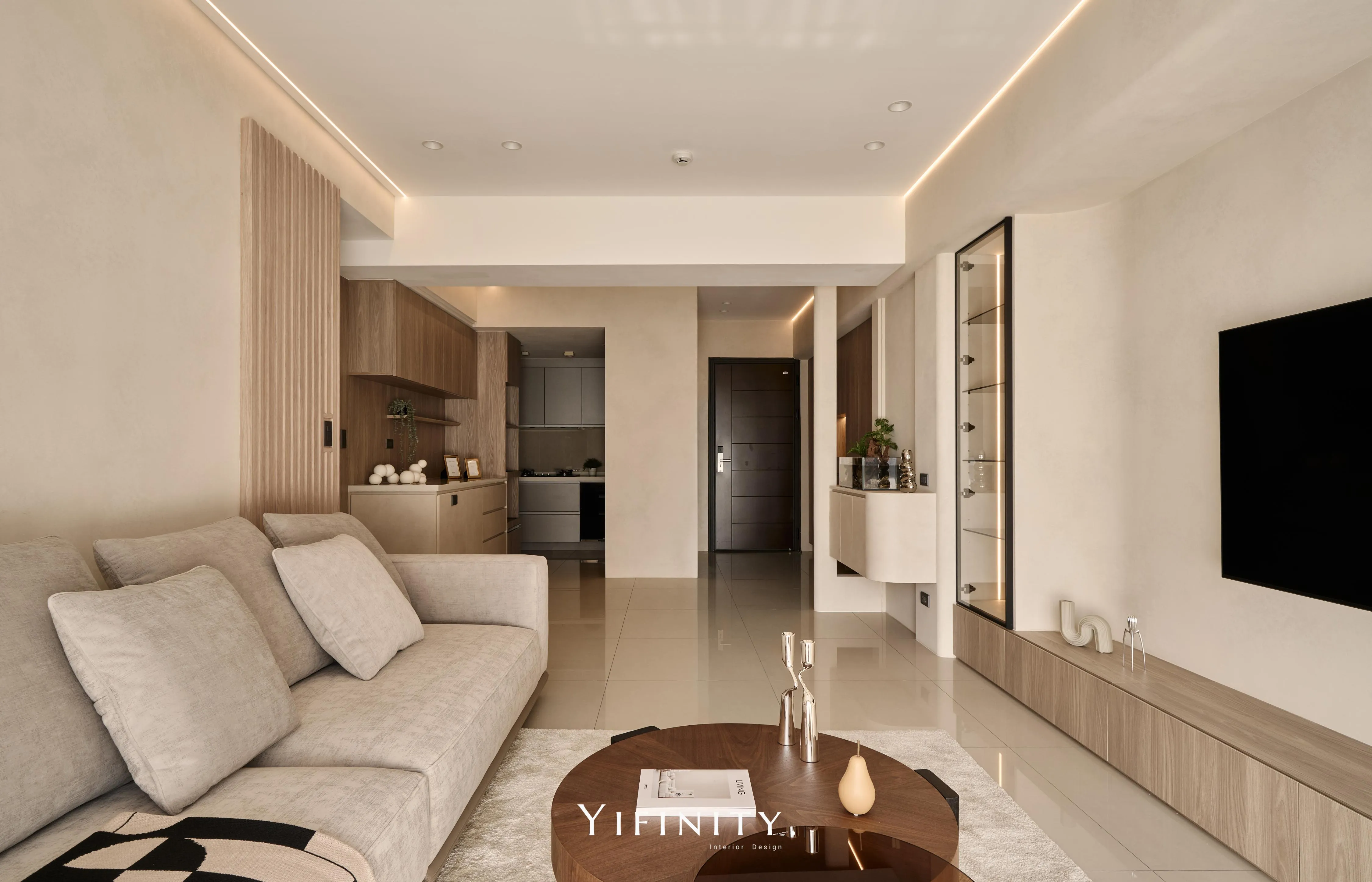 當大地色系漫過空間,家便有了如土壤般厚實且安定的力量。 捨棄了光滑的平整,牆面披上了帶有手感紋理的特殊塗料; 在日光的撫觸下,展現出樸質而細膩的表情。 圓潤的立柱靜立於動線樞紐,不僅界定了場域,更如同一道框景,將生活的畫面輕輕收攏。 溫潤的木格柵與天際線的柔光相互呼應,堆疊出豐富的層次。 在這片燕麥色的溫柔裡,沒有喧囂的視覺干擾,只有赤腳踩踏時的自在,與歲月靜好的悠長餘韻。