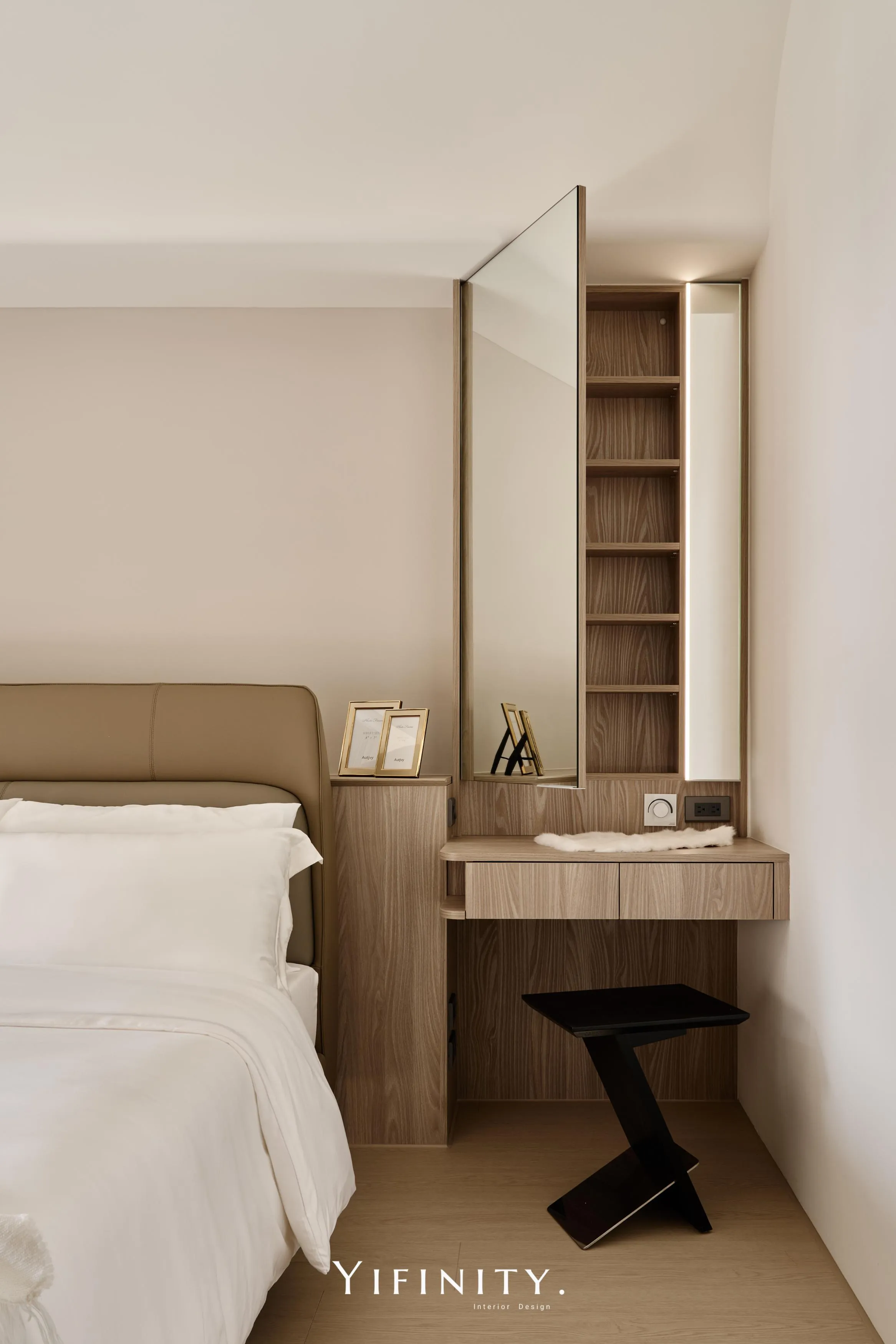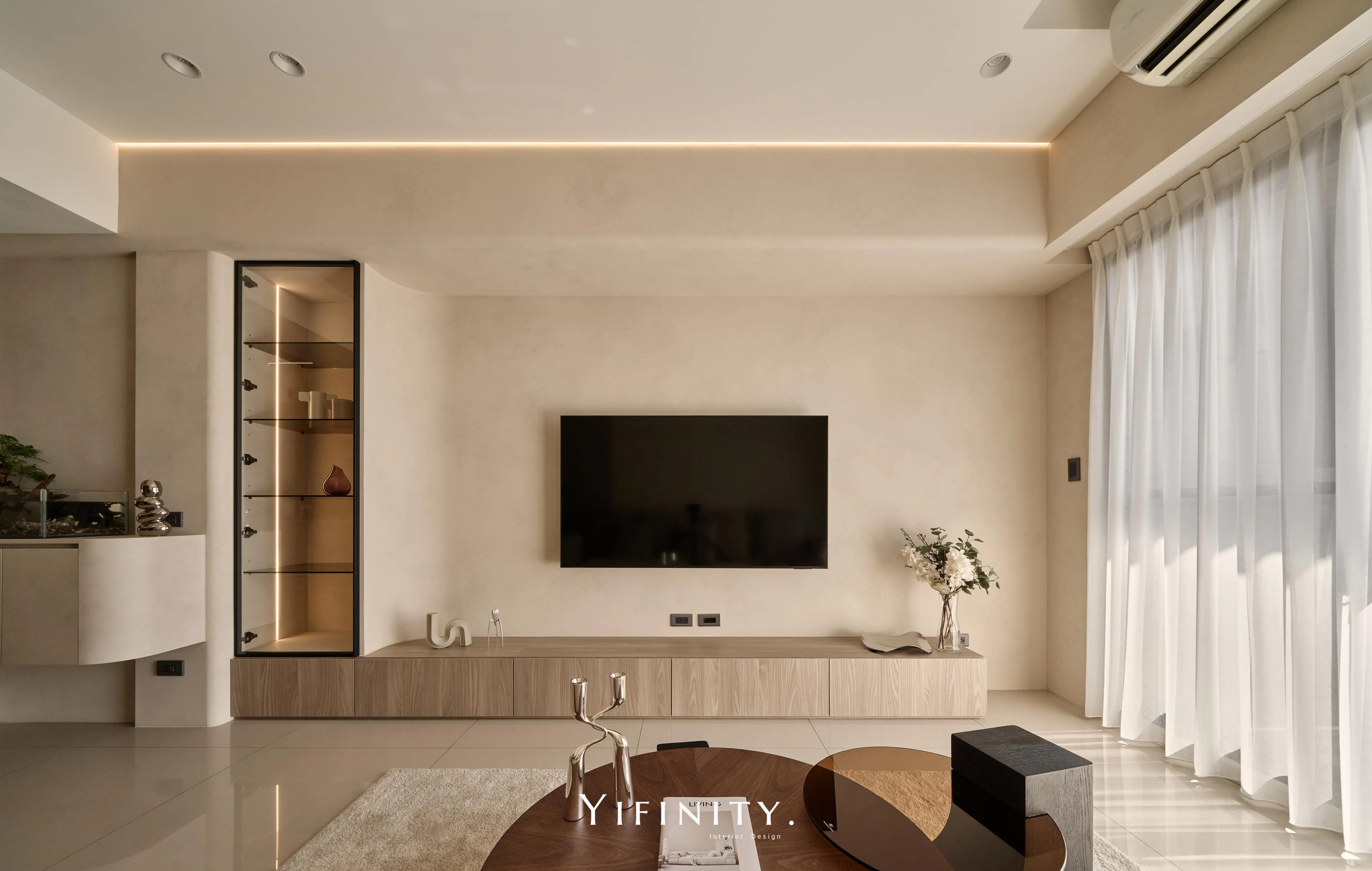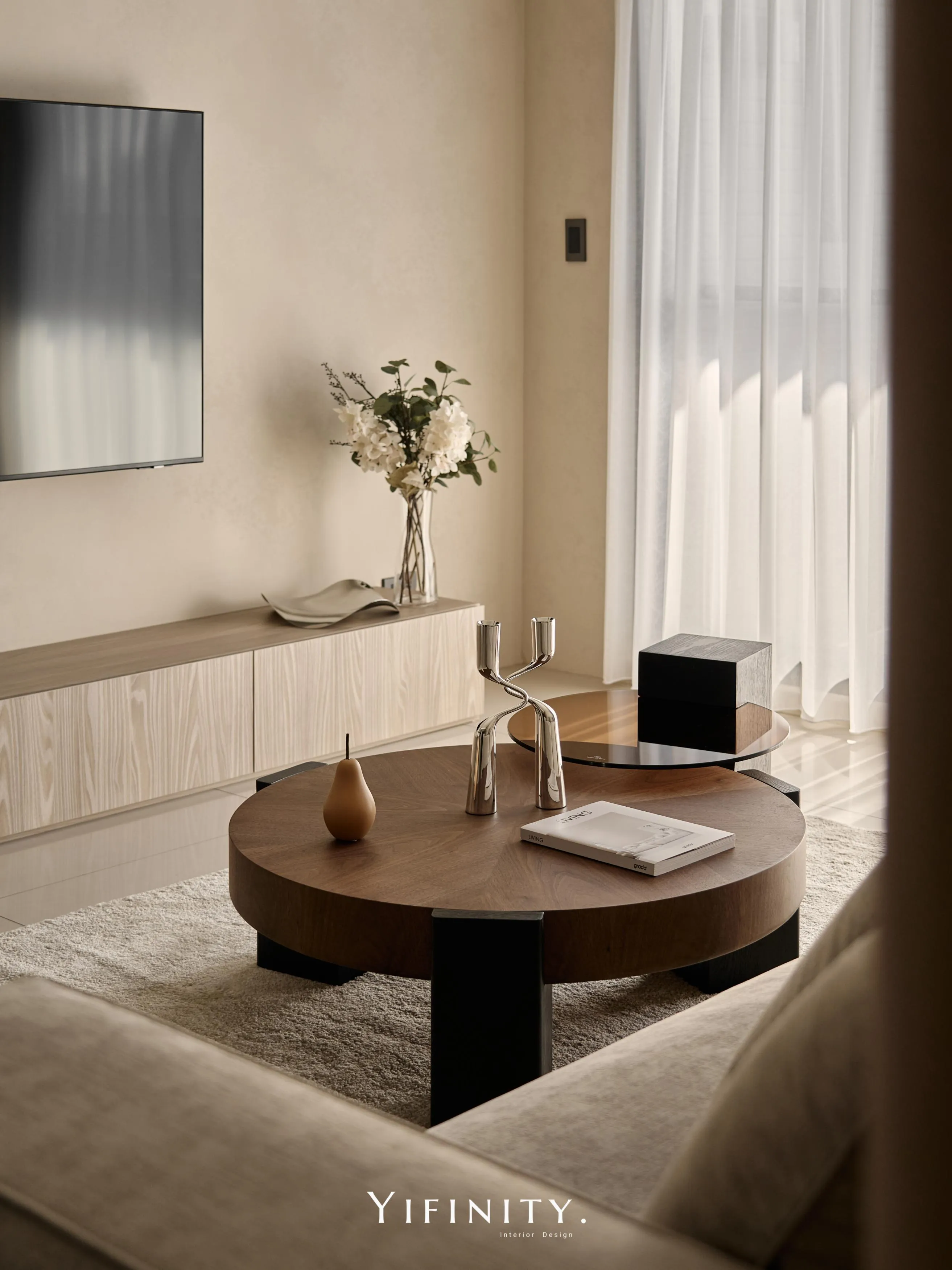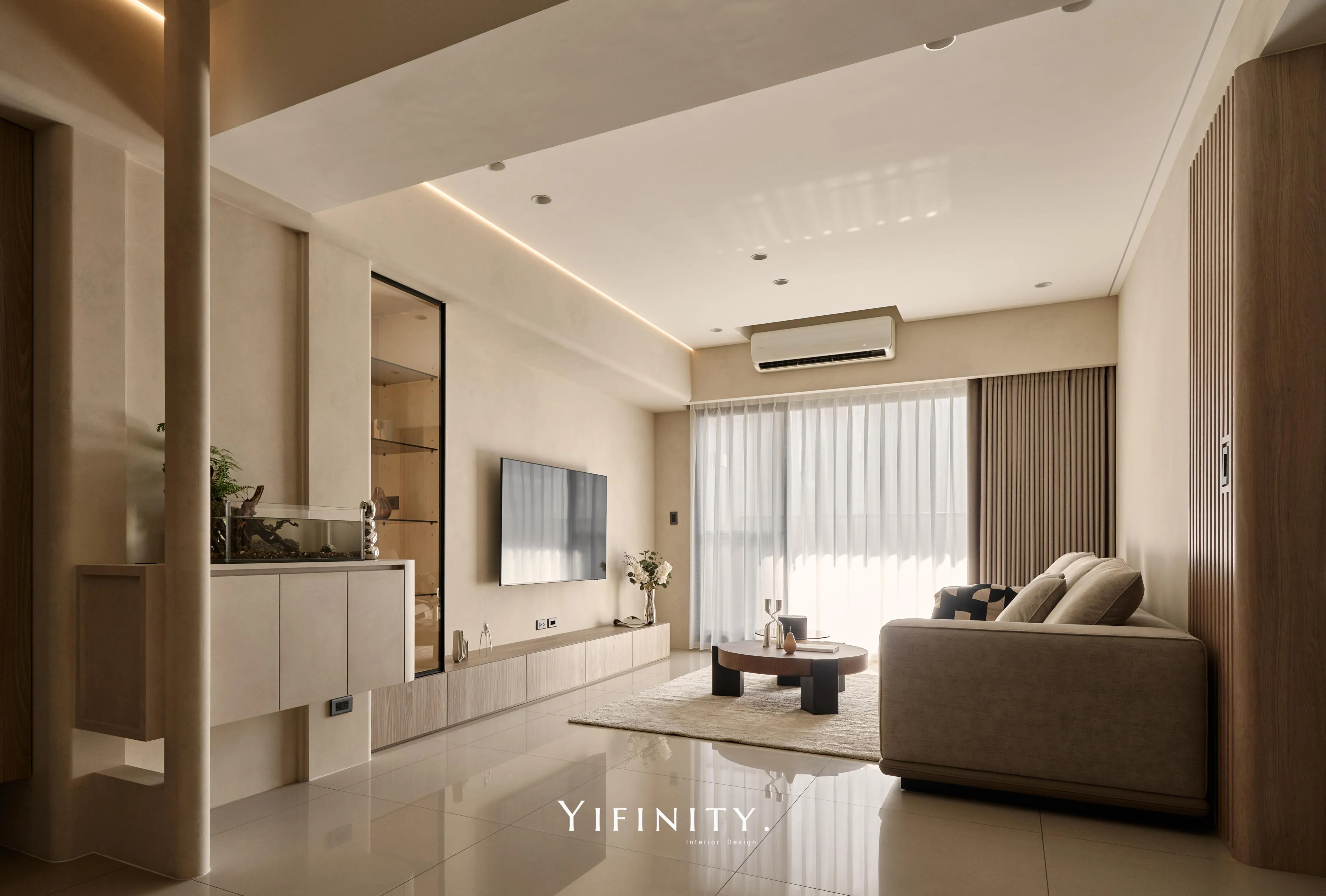 當大地色系漫過空間,家便有了如土壤般厚實且安定的力量。 捨棄了光滑的平整,牆面披上了帶有手感紋理的特殊塗料; 在日光的撫觸下,展現出樸質而細膩的表情。 圓潤的立柱靜立於動線樞紐,不僅界定了場域,更如同一道框景,將生活的畫面輕輕收攏。 溫潤的木格柵與天際線的柔光相互呼應,堆疊出豐富的層次。 在這片燕麥色的溫柔裡,沒有喧囂的視覺干擾,只有赤腳踩踏時的自在,與歲月靜好的悠長餘韻。