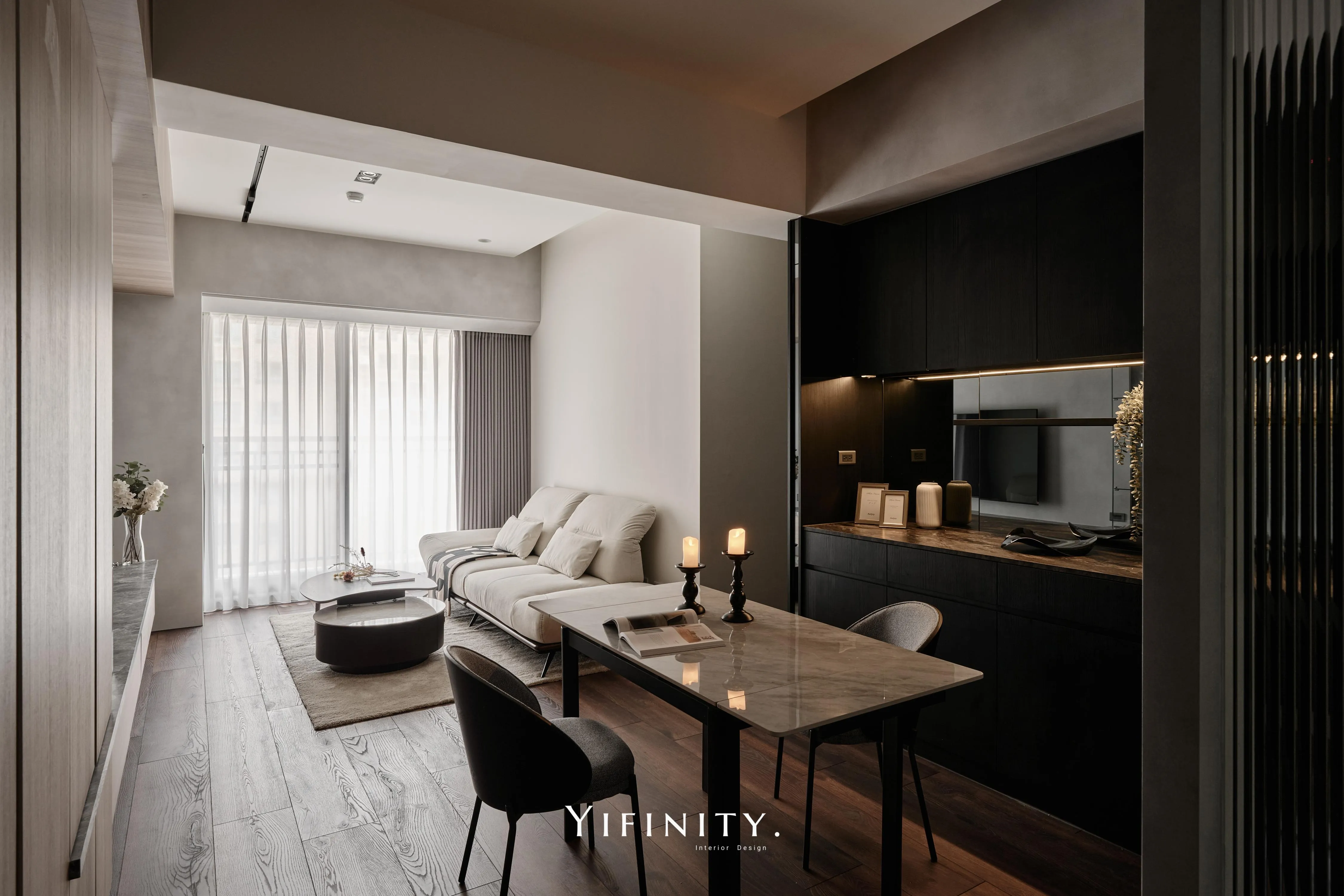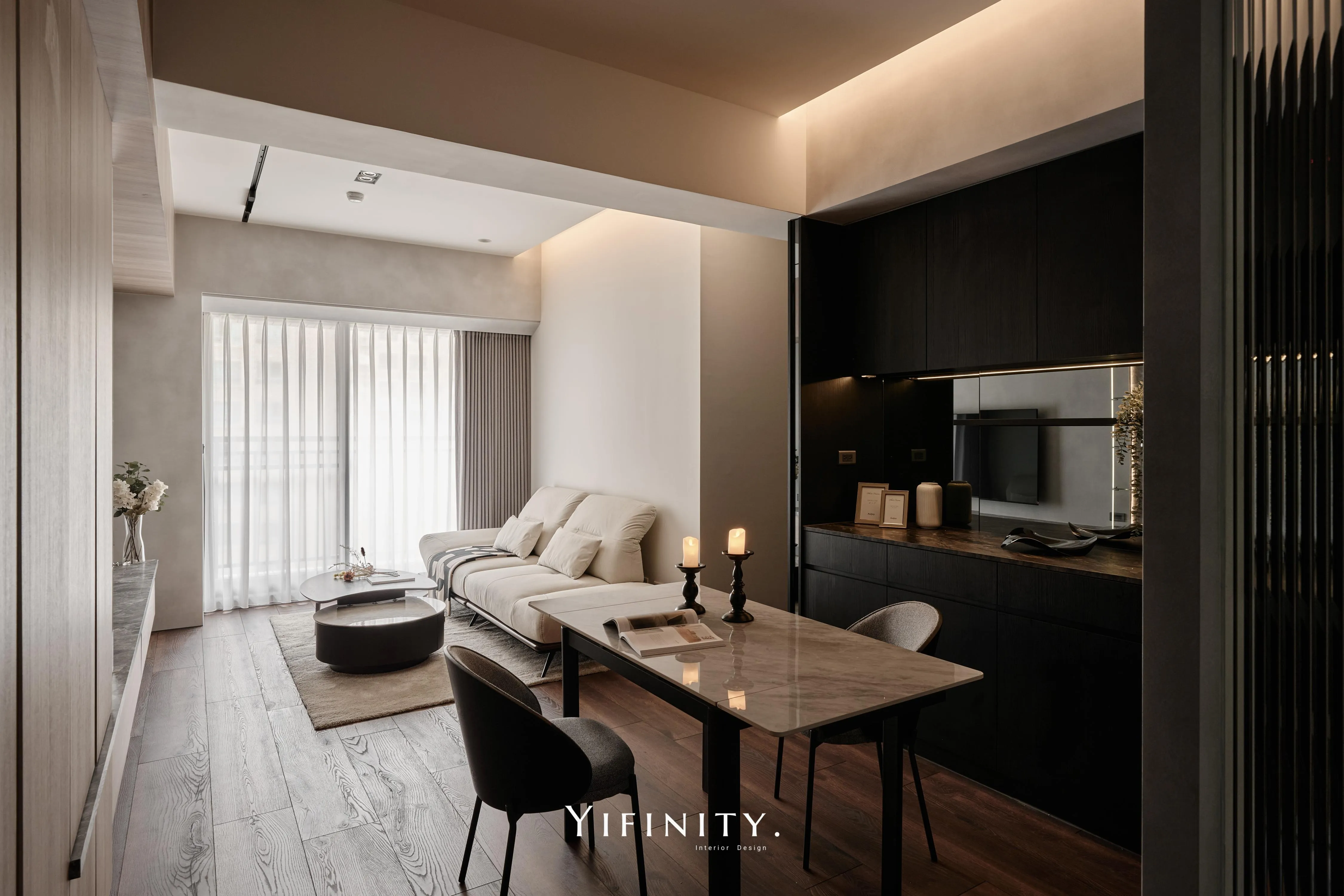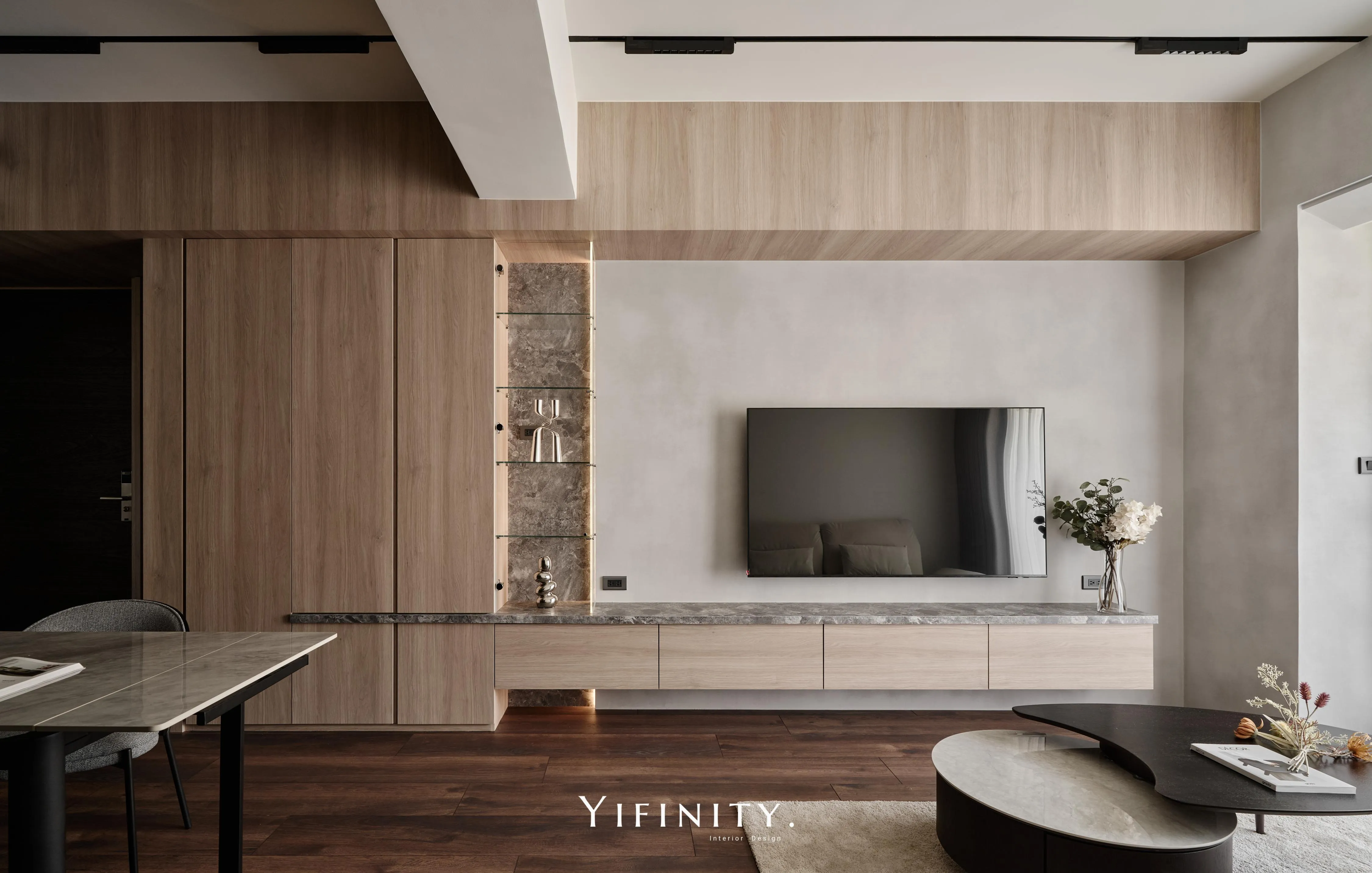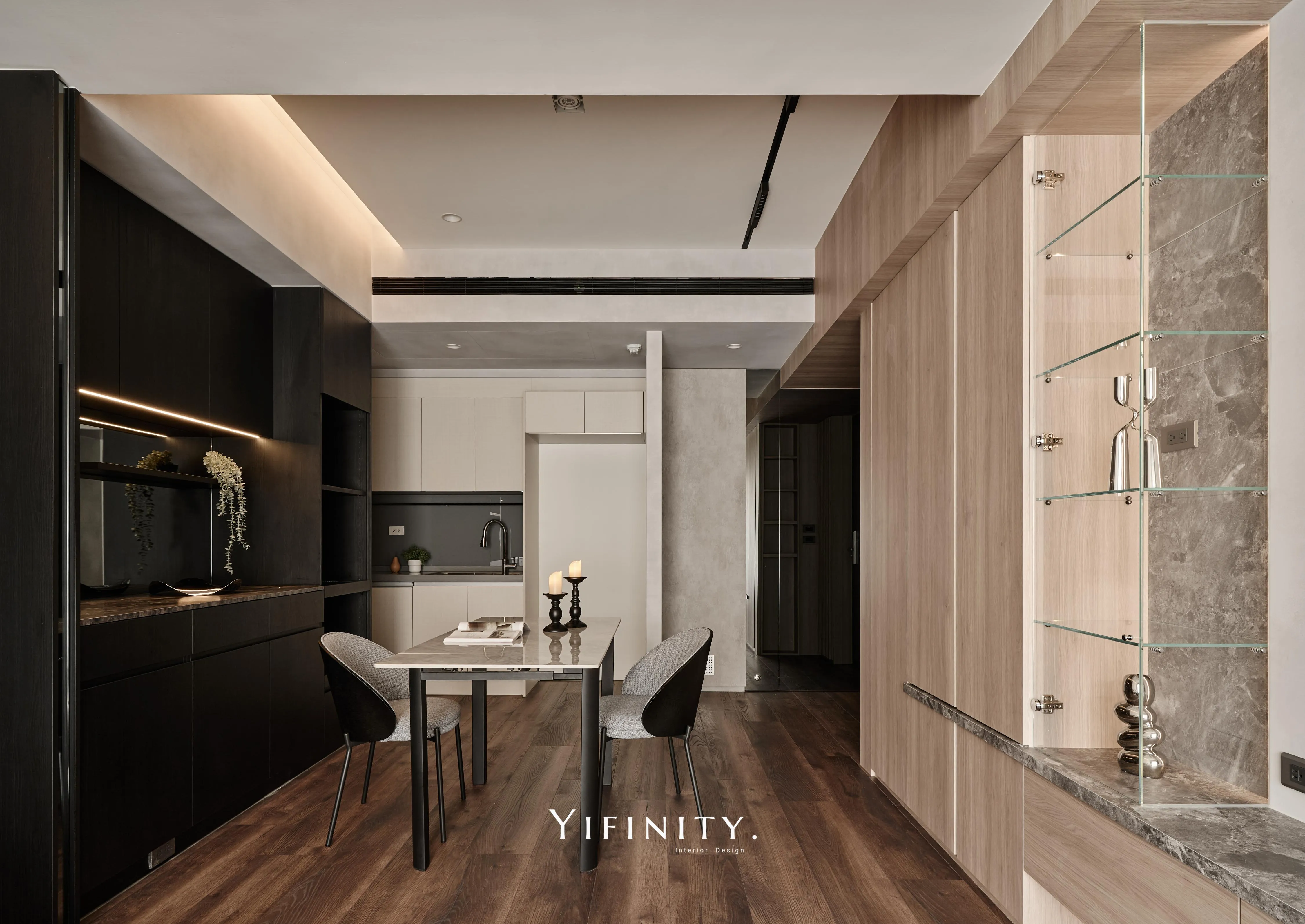 當日光漫遊於溫潤木色之間,空間的層次便在光影的推移中悄然綻放 不言說櫃體的沈重,僅以一道清透的玻璃介面,將粗獷石紋輕盈收攏 線性光源化作無形的指引,讓收藏品在虛實交錯間,宛如懸浮於藝廊般的靜謐展演 轉入用餐場域,氛圍隨之沈澱為一首深邃的夜曲 深醇的木色與冷冽灰鏡相互對話,鏡面幽微地映射著日常的流動,曖昧了空間的邊界 在沈穩的基底中,映照出一抹低調而迷人的微醺光景。