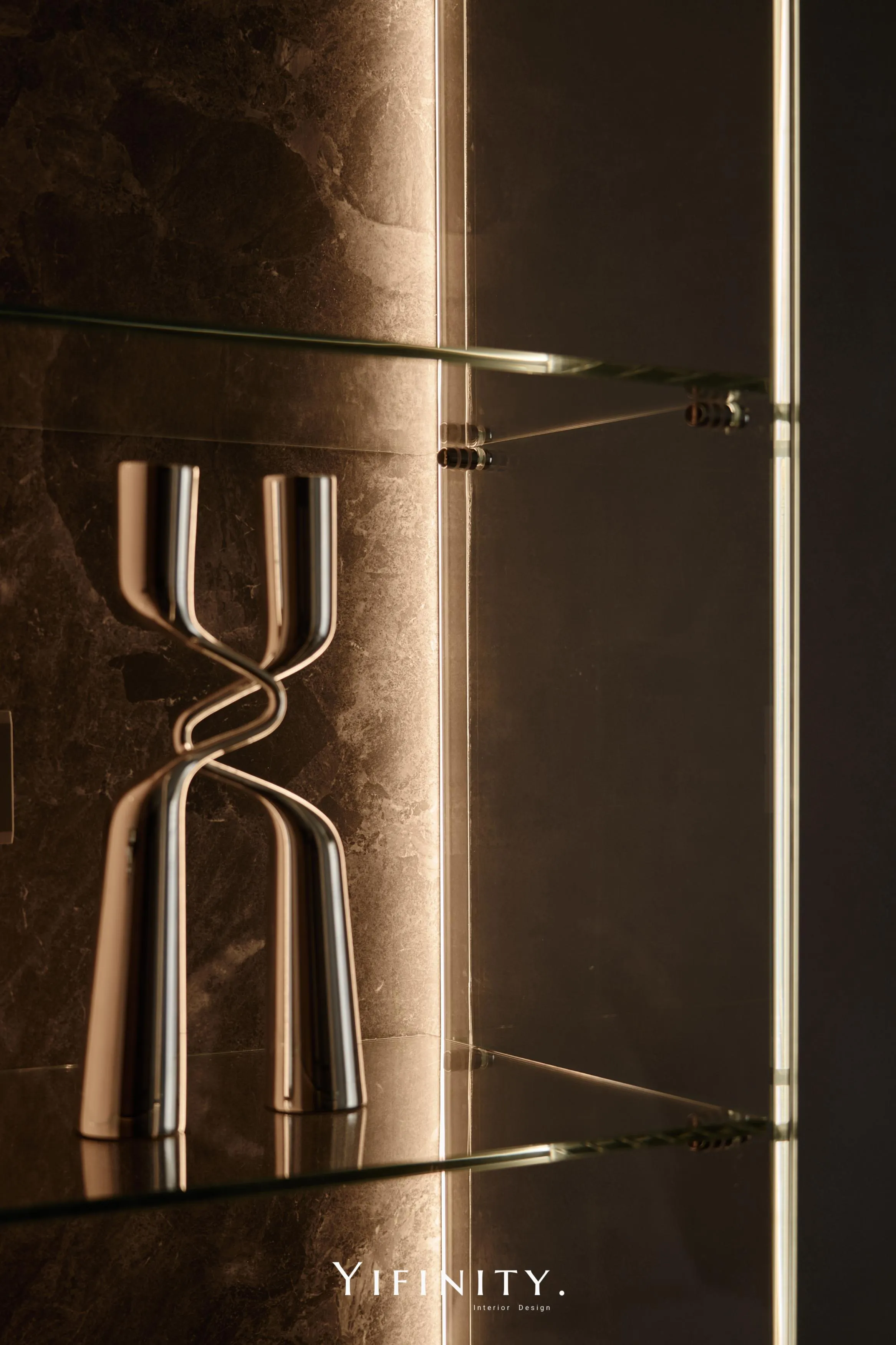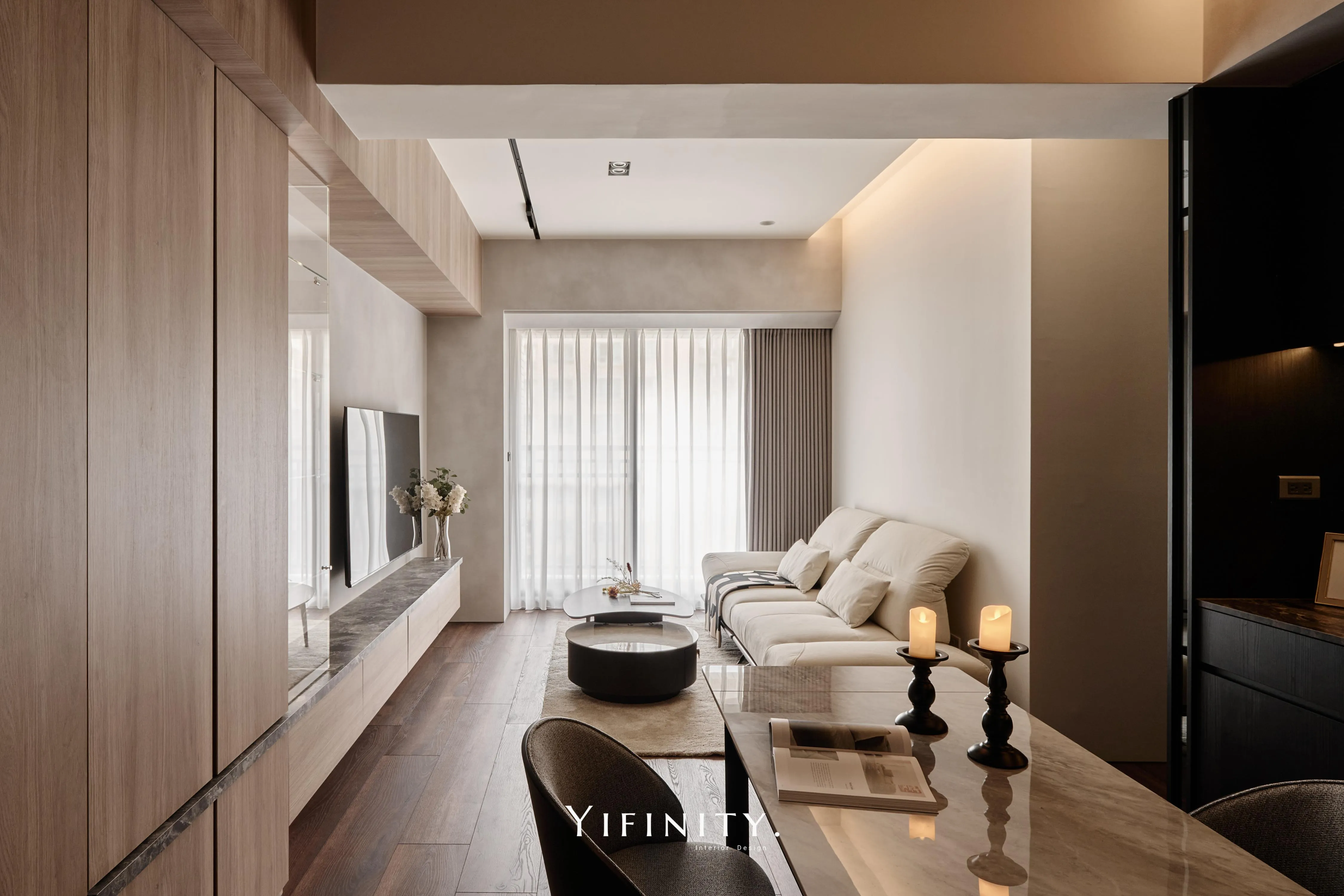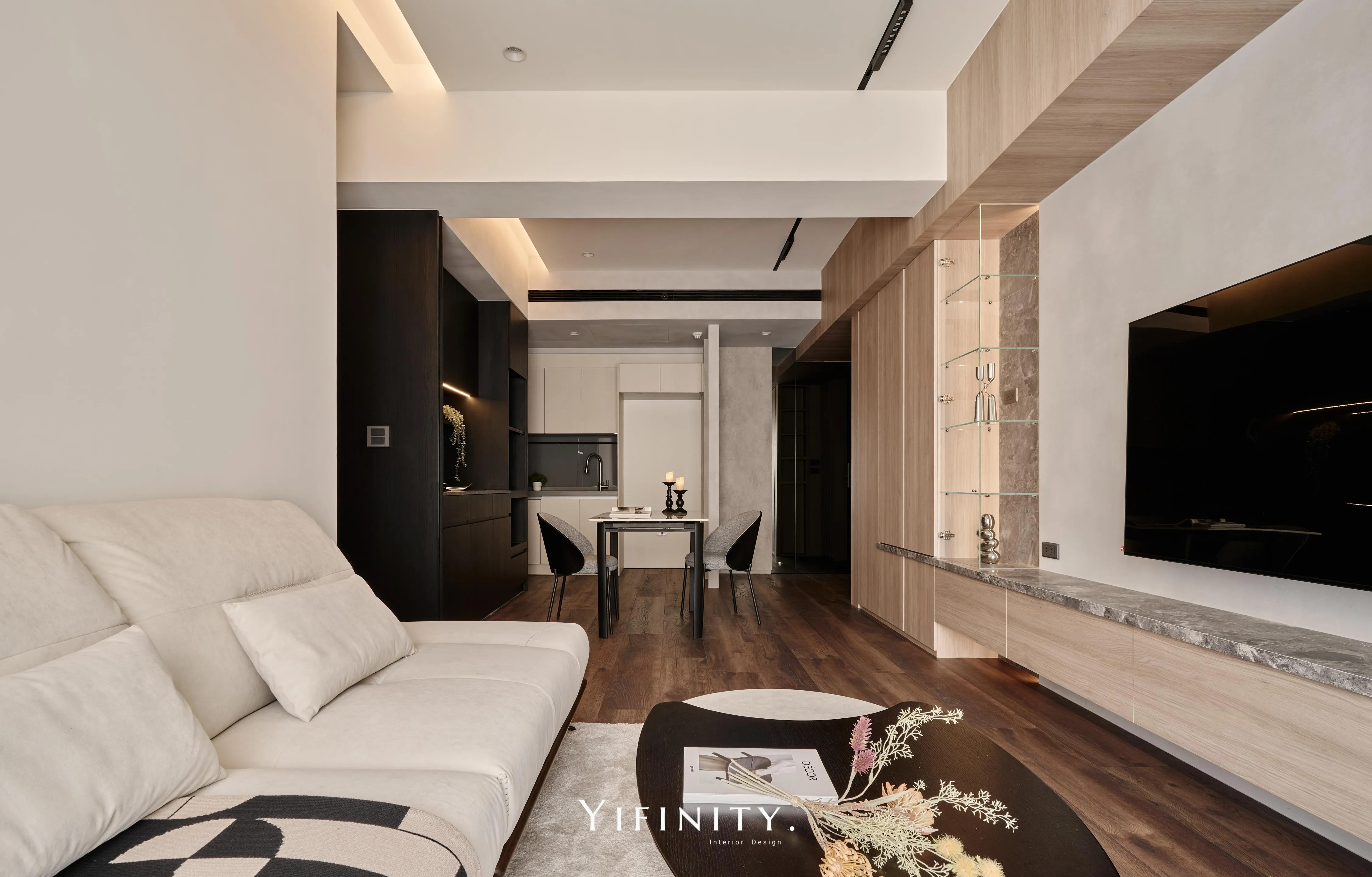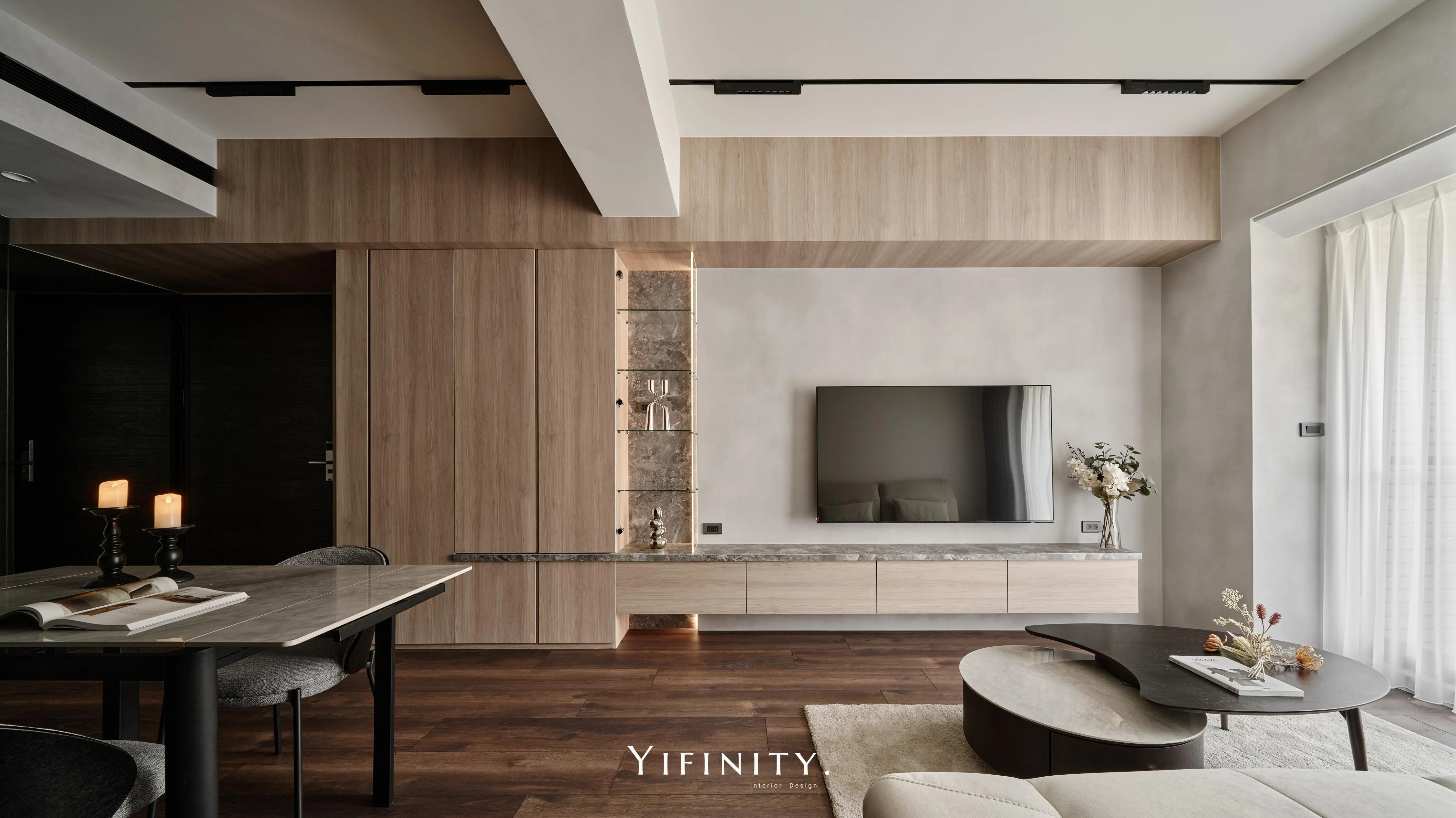 當日光漫遊於溫潤木色之間,空間的層次便在光影的推移中悄然綻放 不言說櫃體的沈重,僅以一道清透的玻璃介面,將粗獷石紋輕盈收攏 線性光源化作無形的指引,讓收藏品在虛實交錯間,宛如懸浮於藝廊般的靜謐展演 轉入用餐場域,氛圍隨之沈澱為一首深邃的夜曲 深醇的木色與冷冽灰鏡相互對話,鏡面幽微地映射著日常的流動,曖昧了空間的邊界 在沈穩的基底中,映照出一抹低調而迷人的微醺光景。