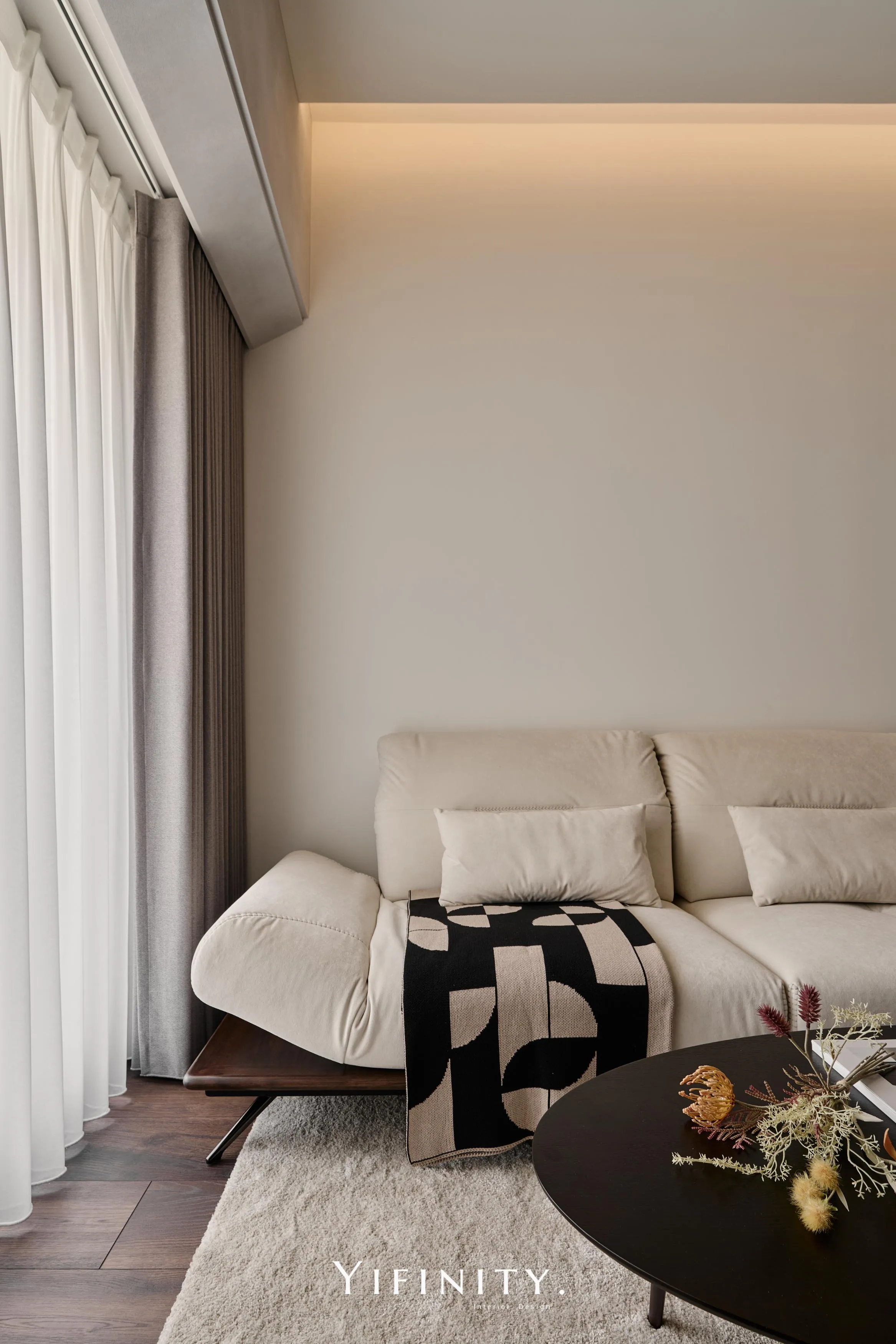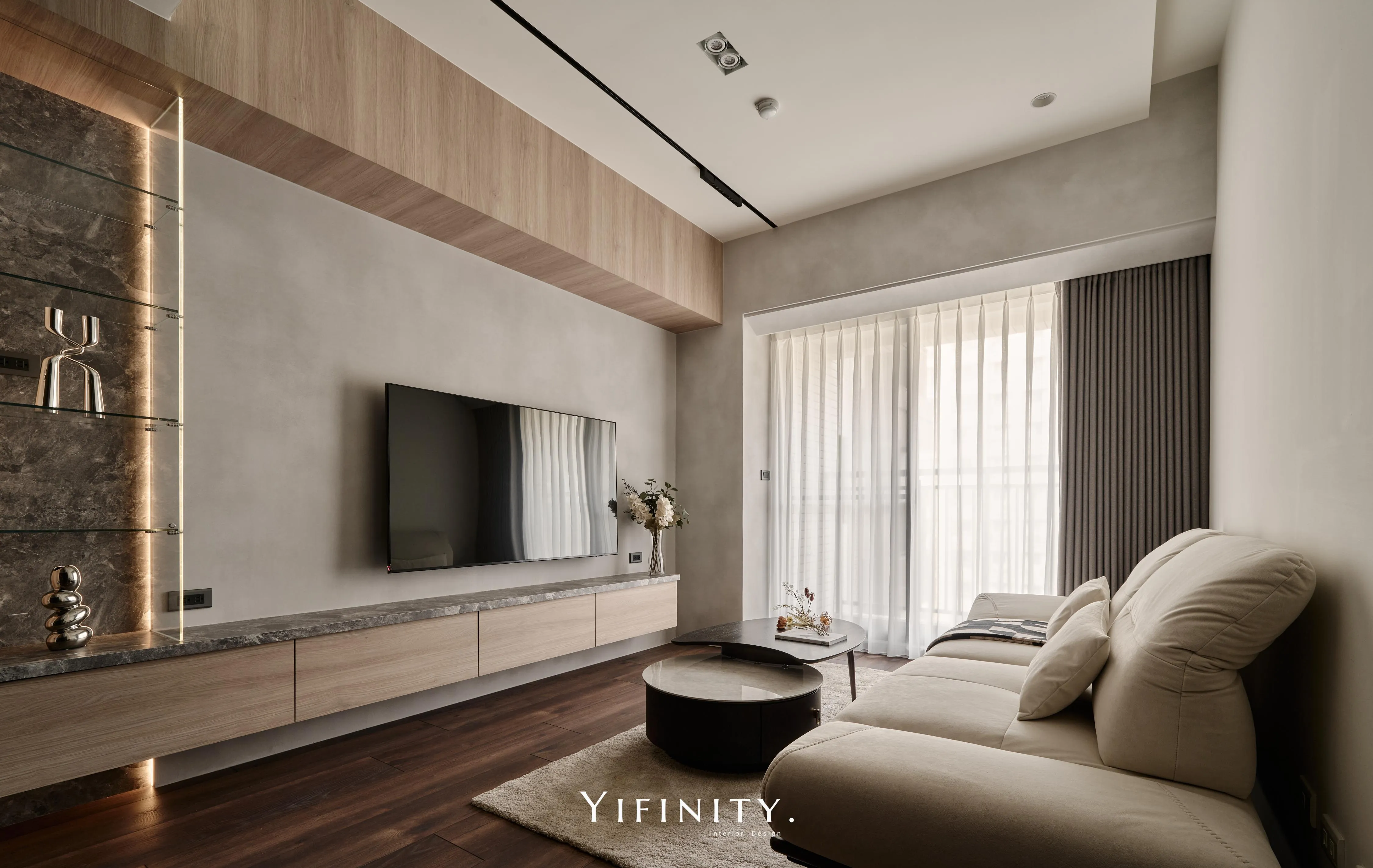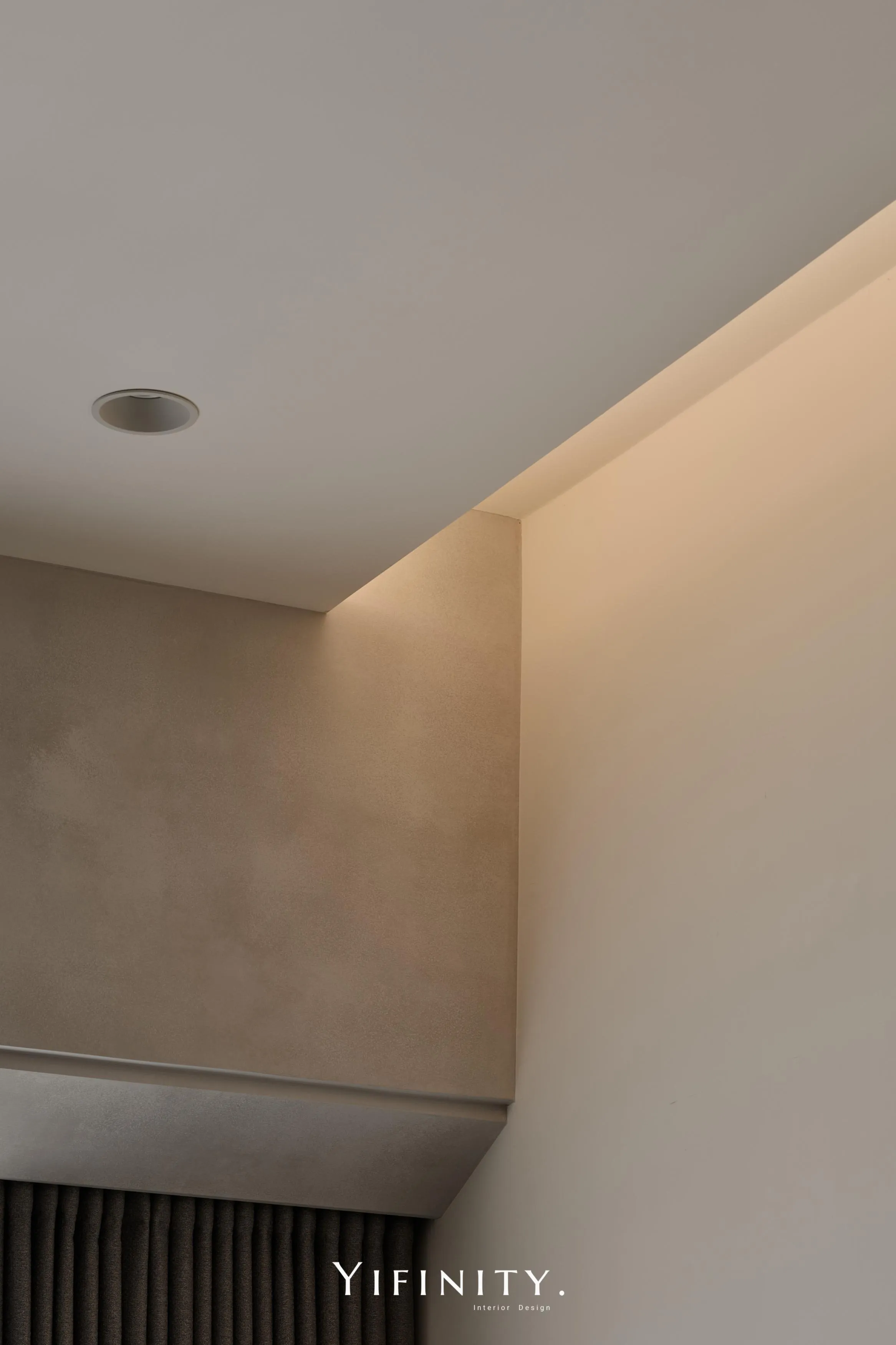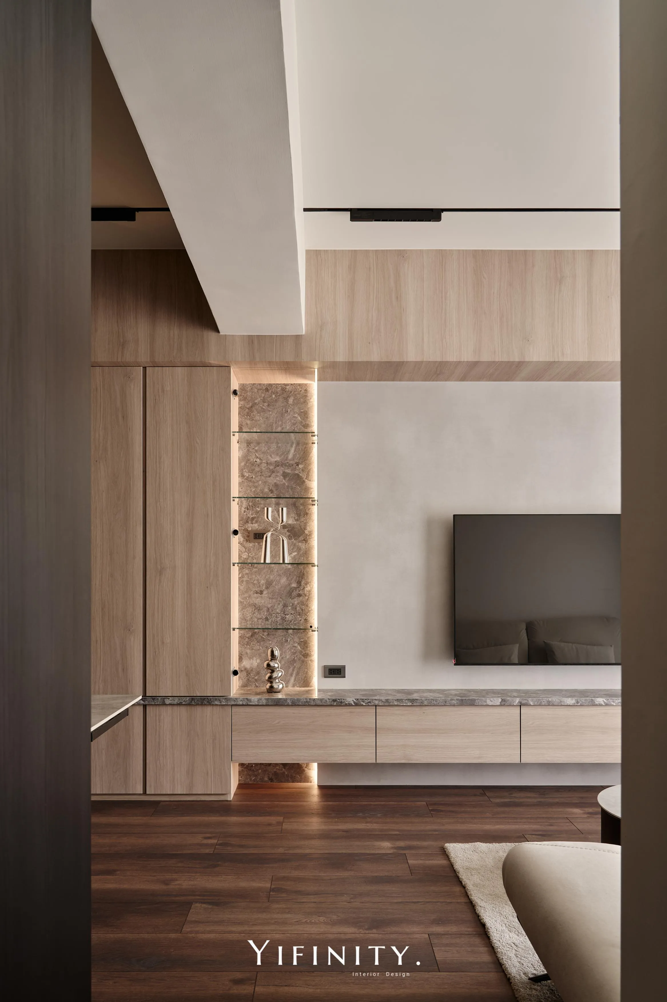 當日光漫遊於溫潤木色之間,空間的層次便在光影的推移中悄然綻放 不言說櫃體的沈重,僅以一道清透的玻璃介面,將粗獷石紋輕盈收攏 線性光源化作無形的指引,讓收藏品在虛實交錯間,宛如懸浮於藝廊般的靜謐展演 轉入用餐場域,氛圍隨之沈澱為一首深邃的夜曲 深醇的木色與冷冽灰鏡相互對話,鏡面幽微地映射著日常的流動,曖昧了空間的邊界 在沈穩的基底中,映照出一抹低調而迷人的微醺光景。