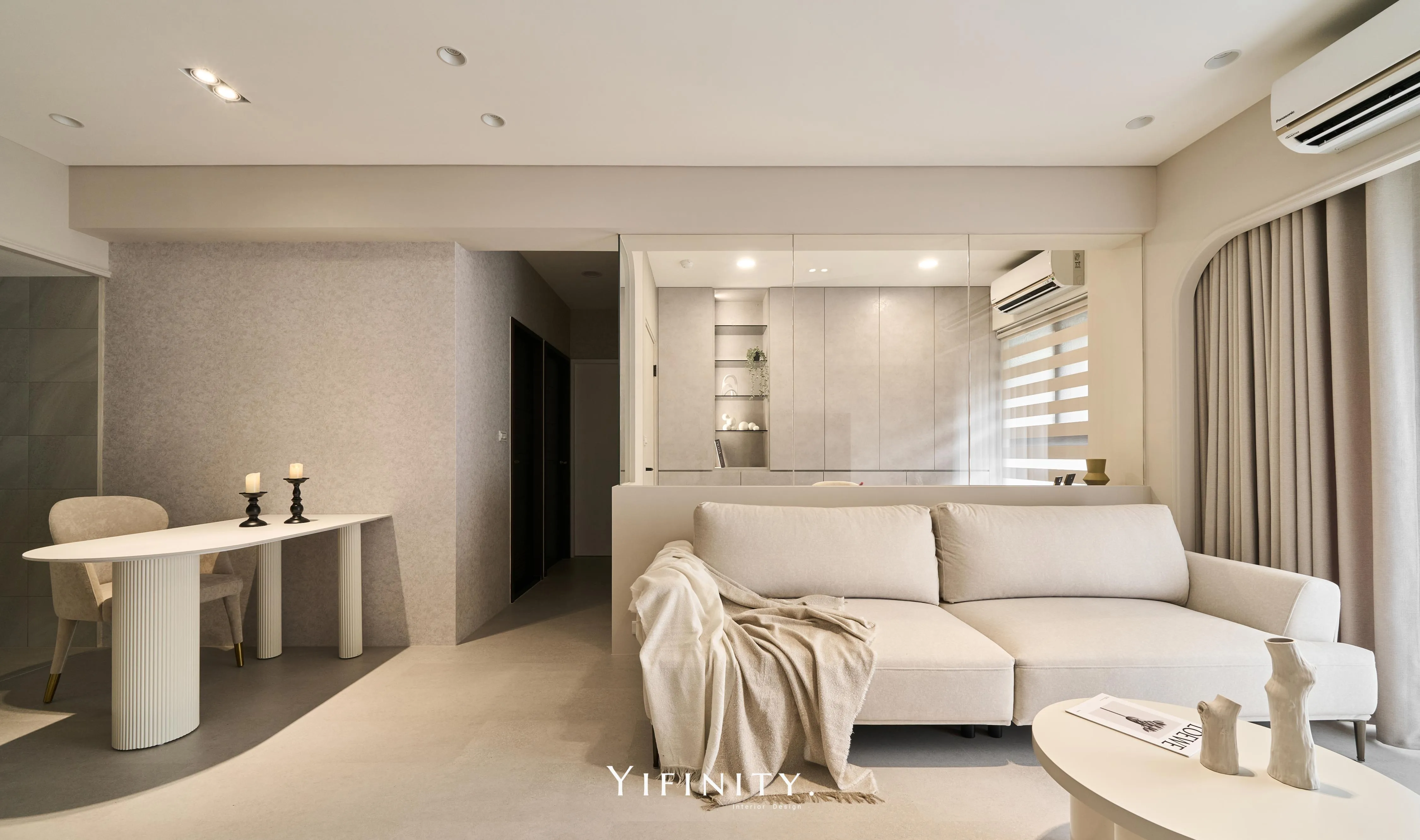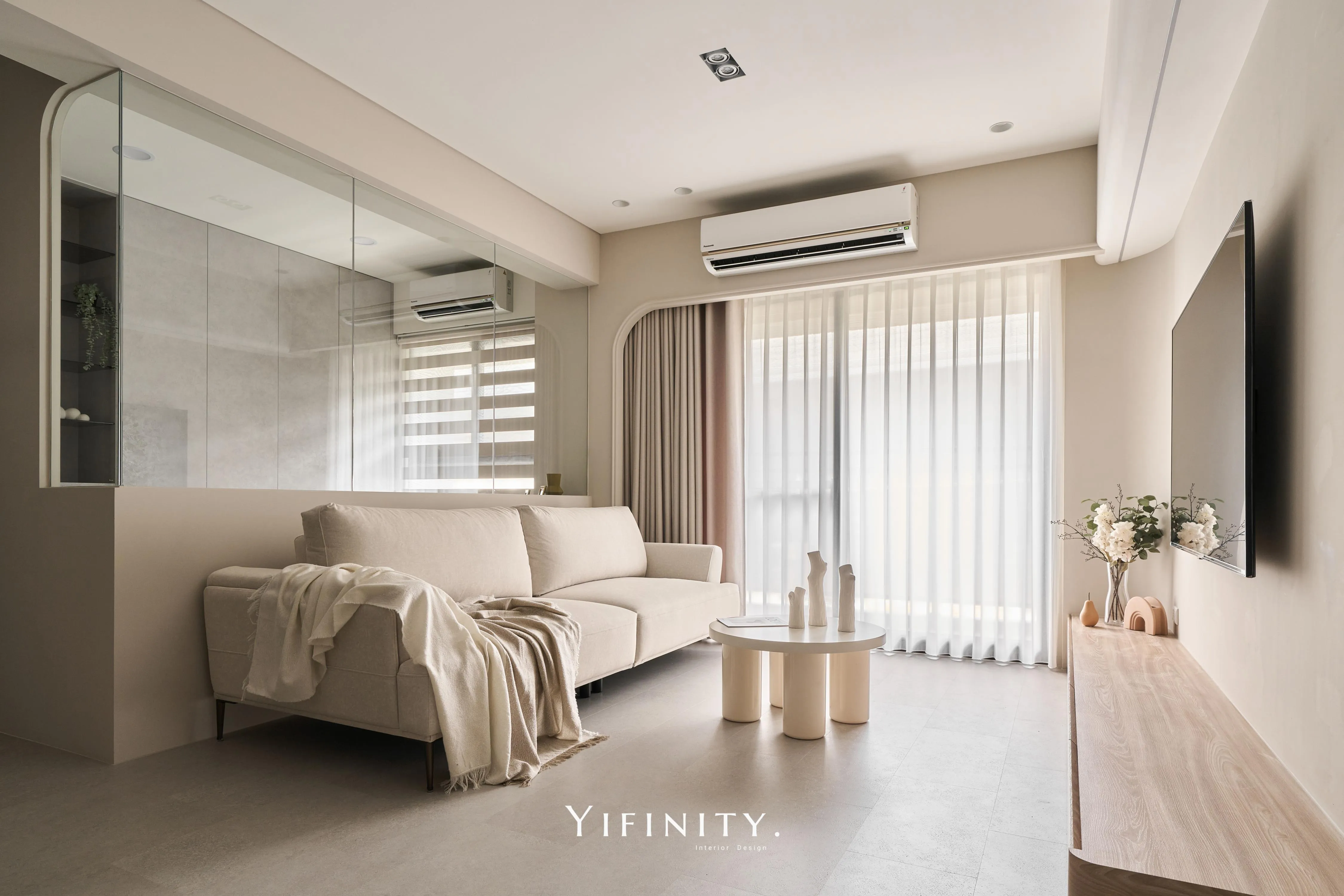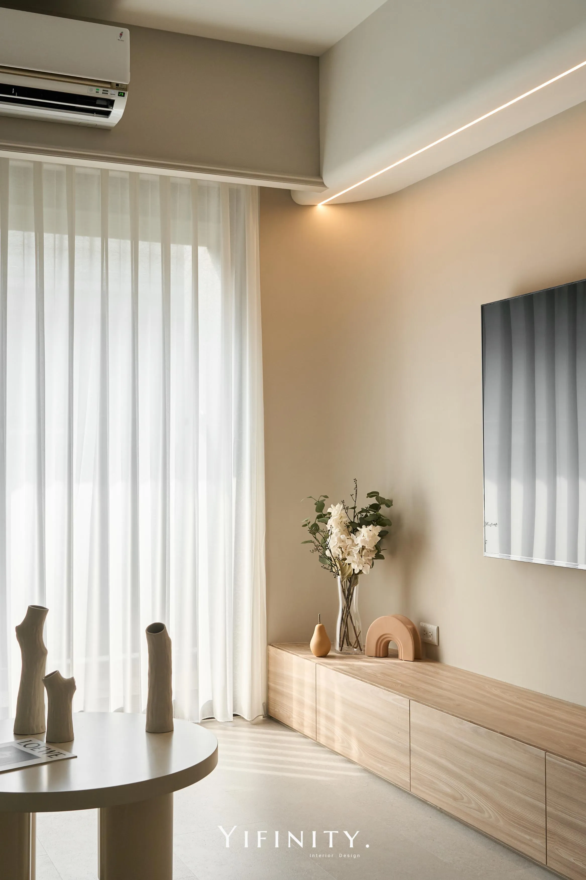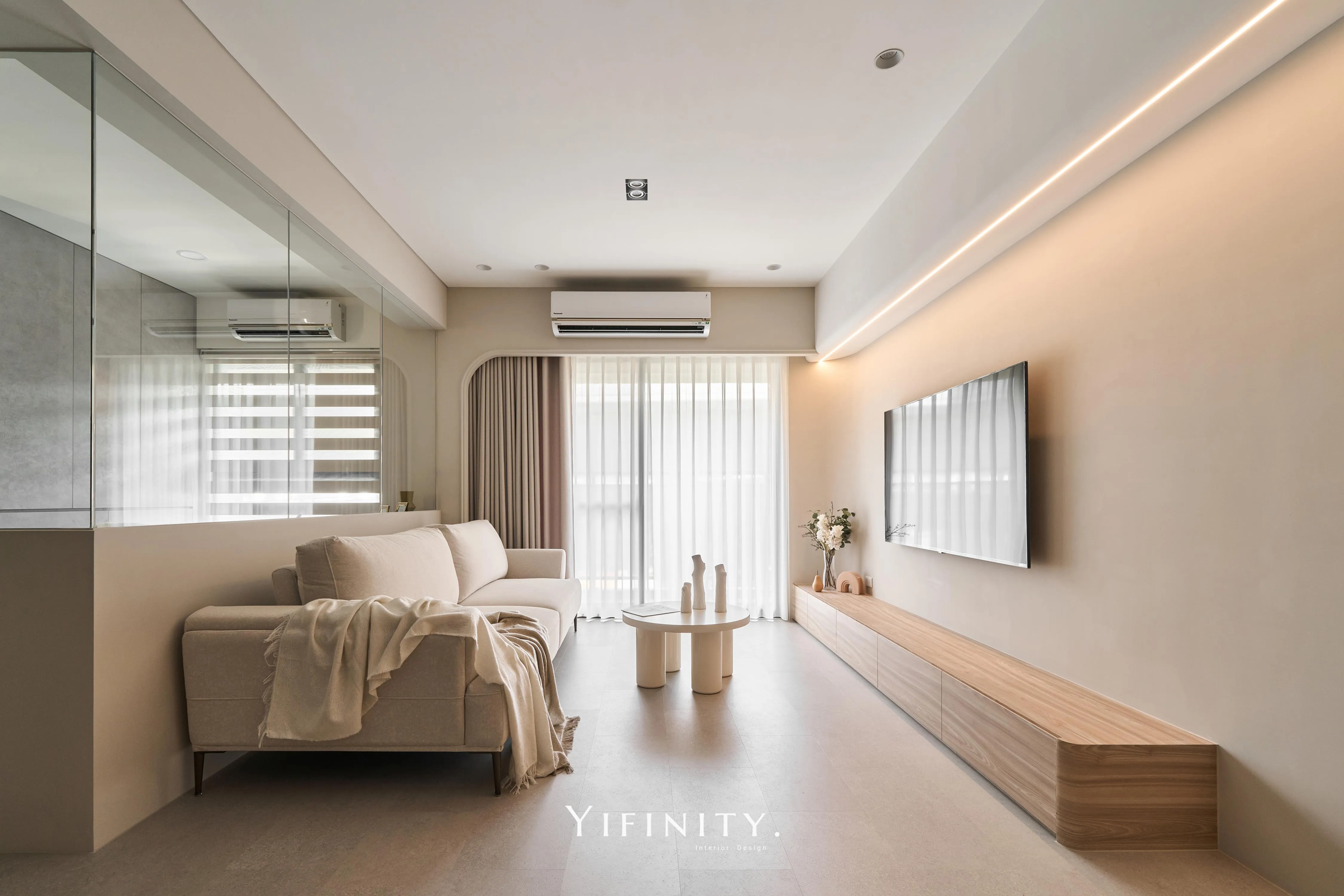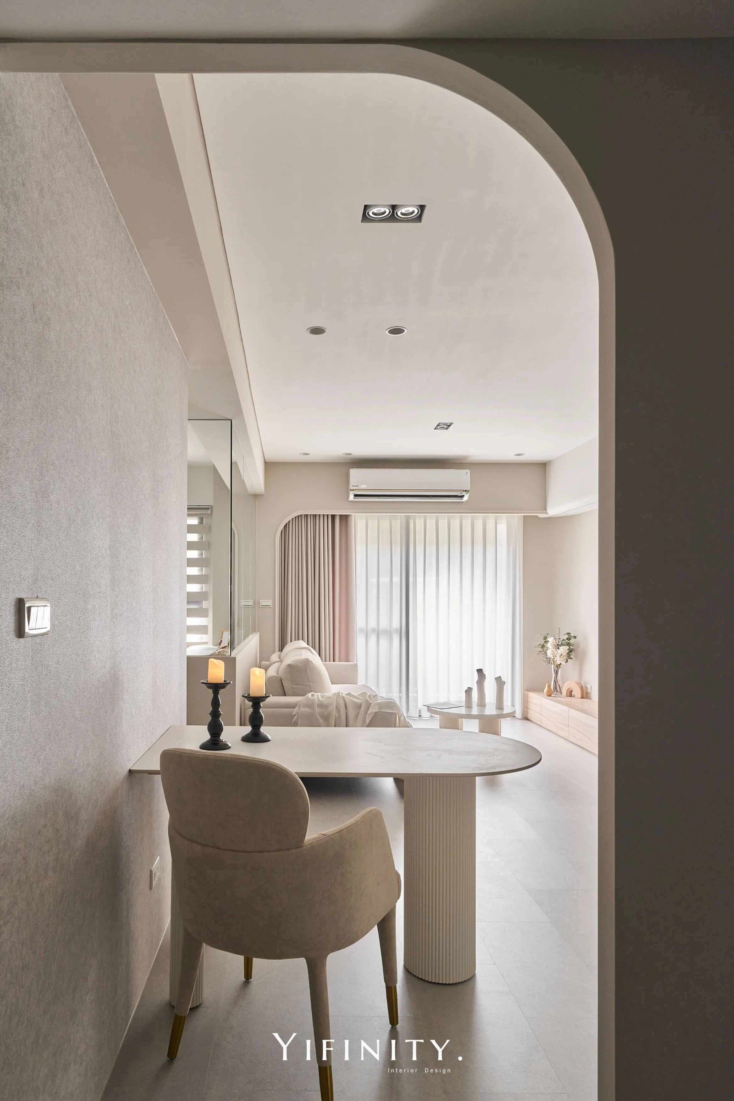 若家有顏色,那應該是一杯溫熱奶茶的色澤。 以弧線語彙修飾天花板邊界,撫平了日常的毛躁。 客廳與書房之間,通透的玻璃取代實牆,創造出最不打擾的陪伴; 讓視線得以延伸,光線亦能自由漫遊。 無論身處沙發一隅或書房午後,家人間的眼神總能在此溫柔交會。