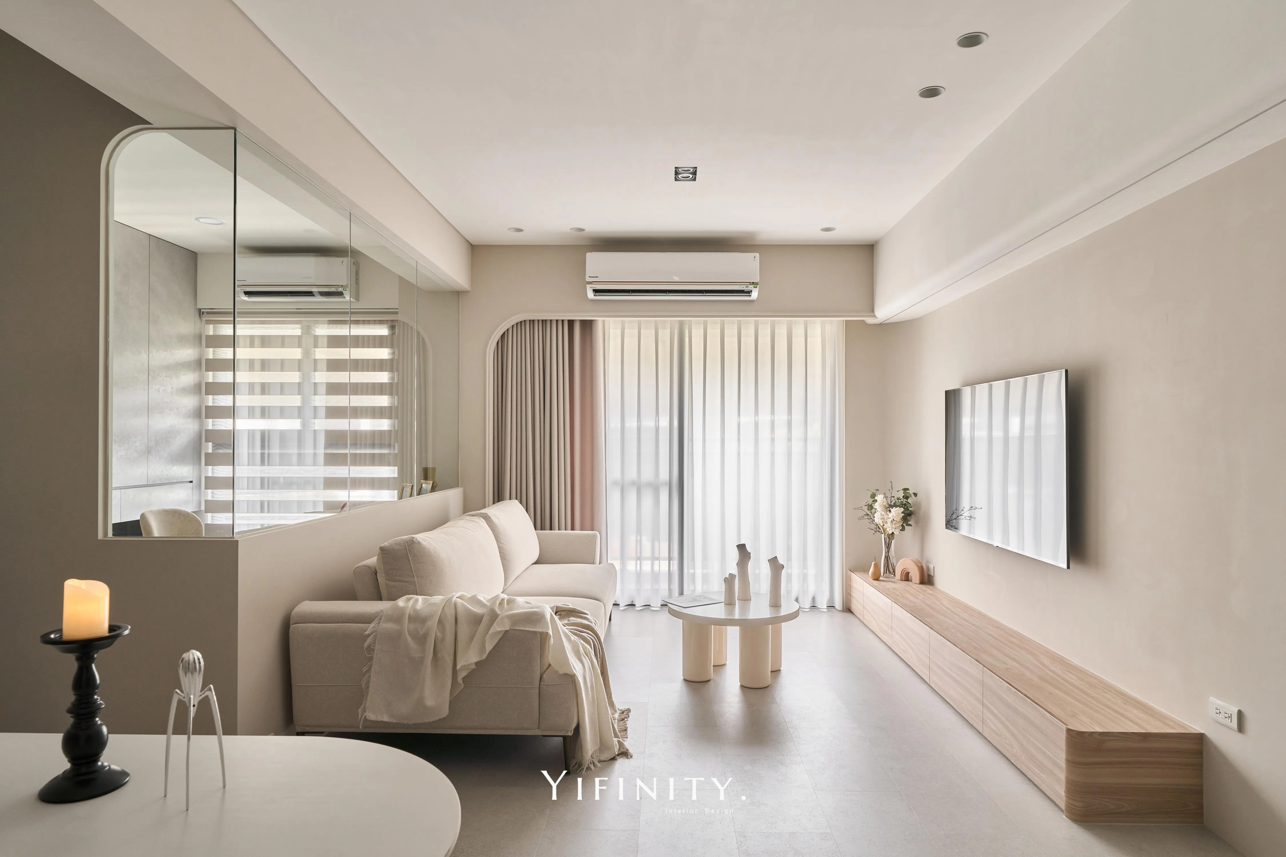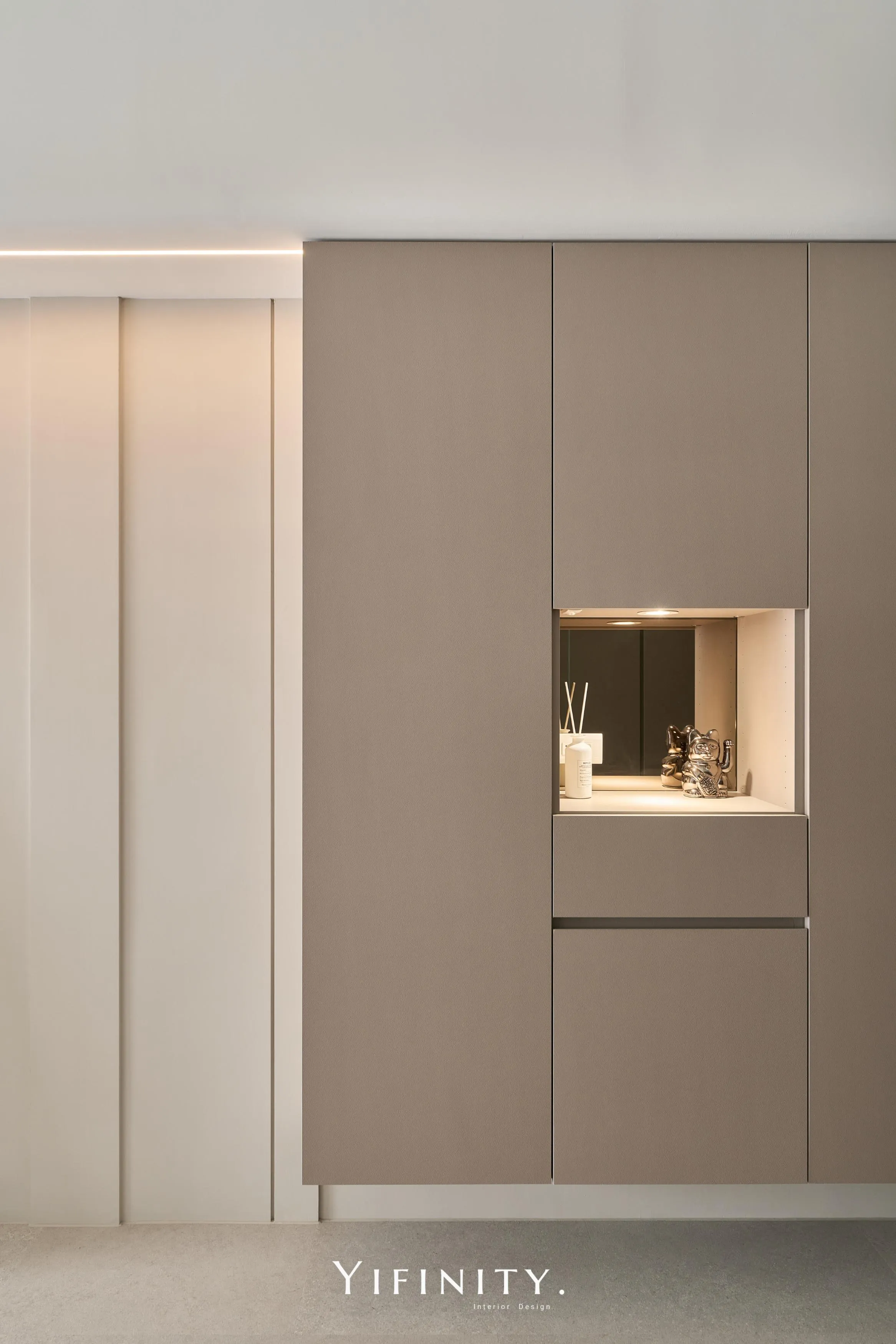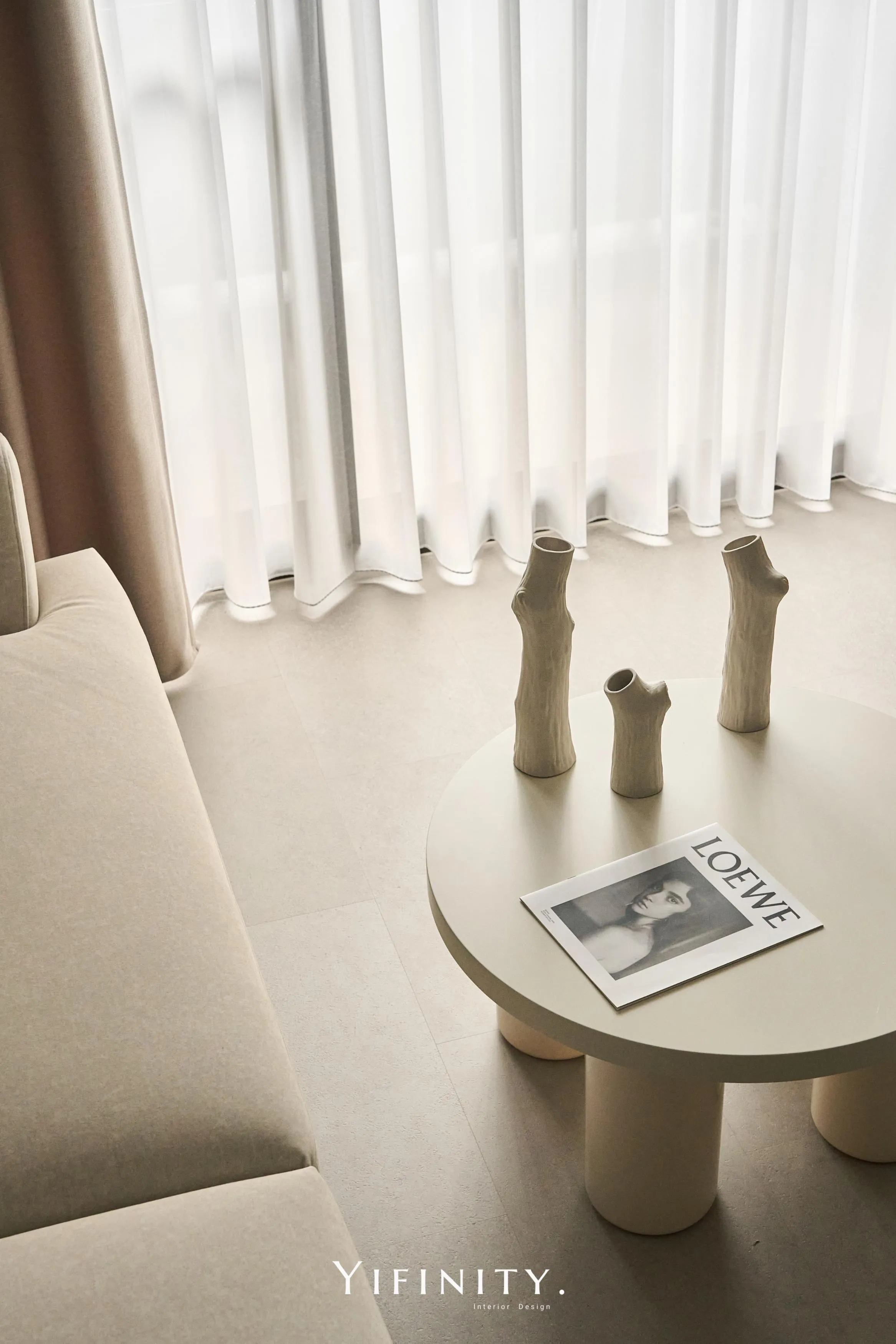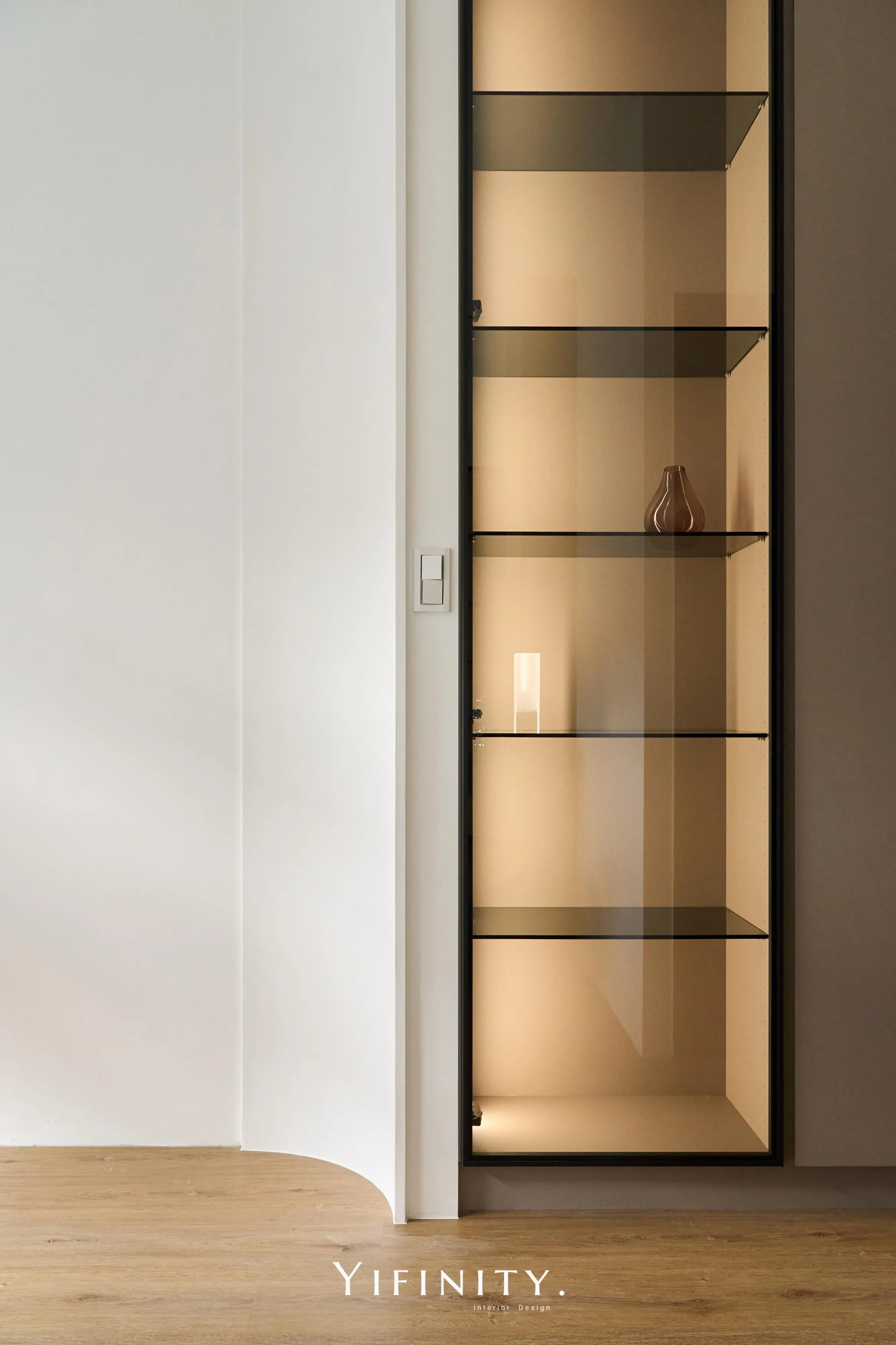若家有顏色,那應該是一杯溫熱奶茶的色澤。 以弧線語彙修飾天花板邊界,撫平了日常的毛躁。 客廳與書房之間,通透的玻璃取代實牆,創造出最不打擾的陪伴; 讓視線得以延伸,光線亦能自由漫遊。 無論身處沙發一隅或書房午後,家人間的眼神總能在此溫柔交會。