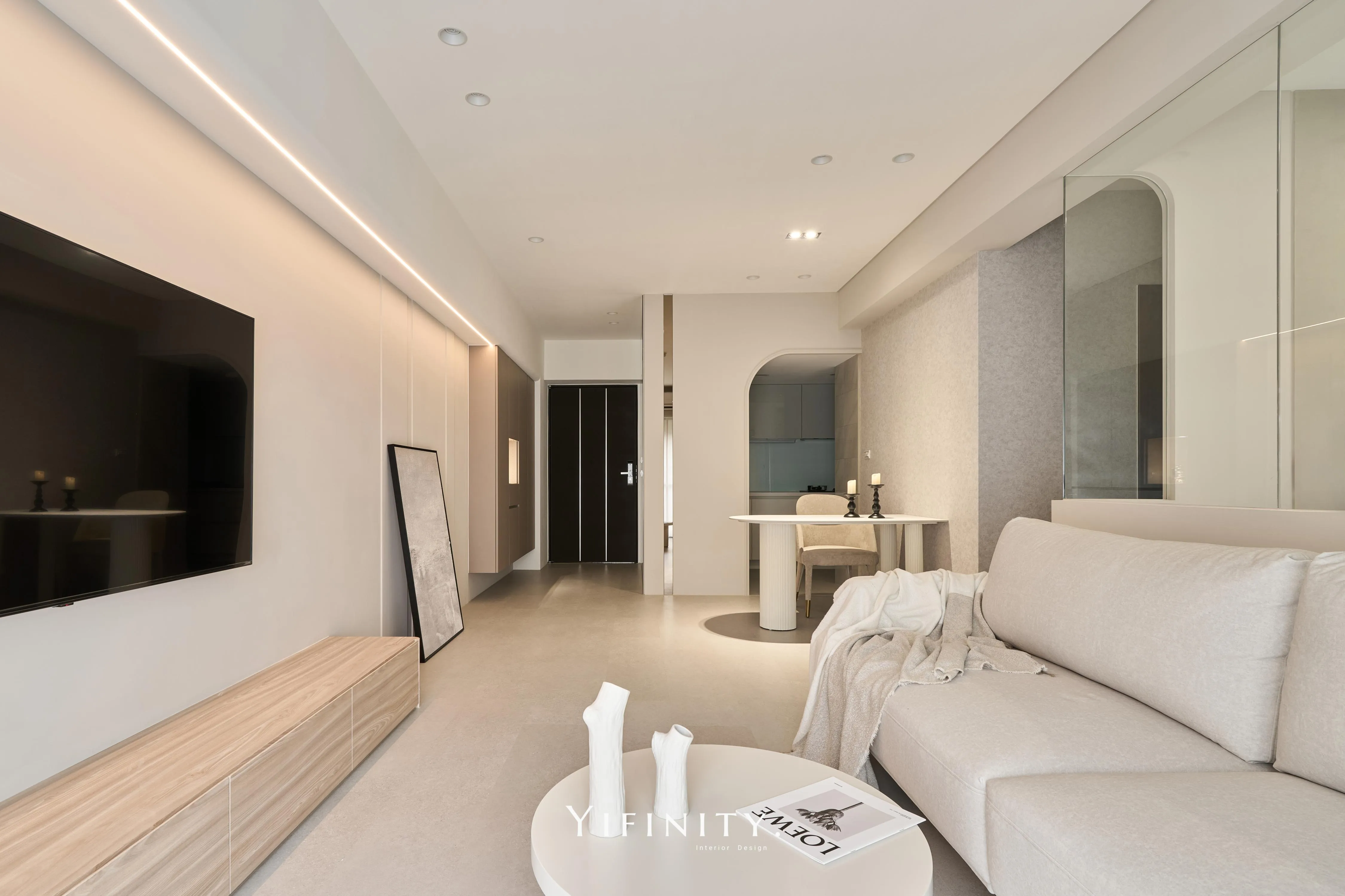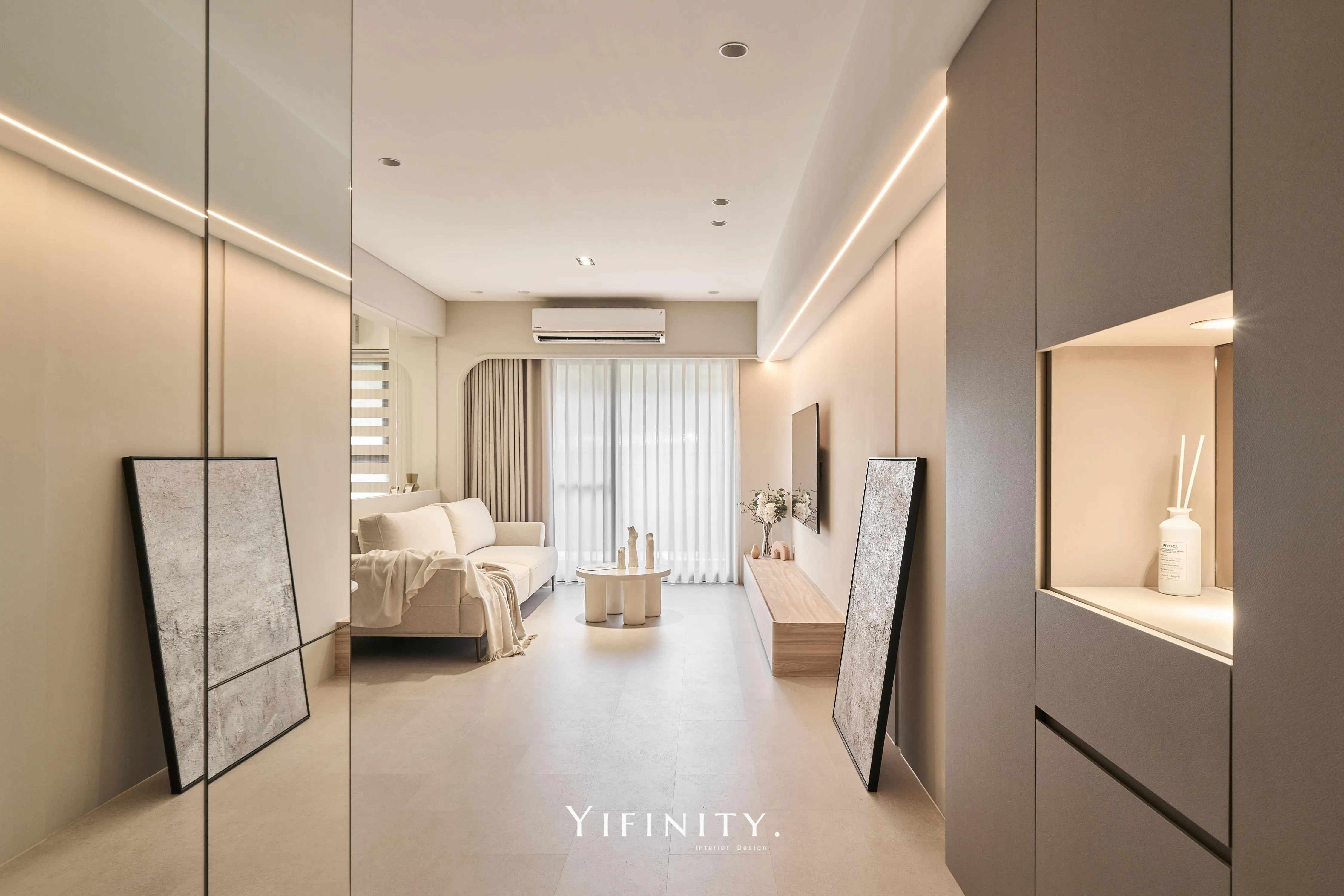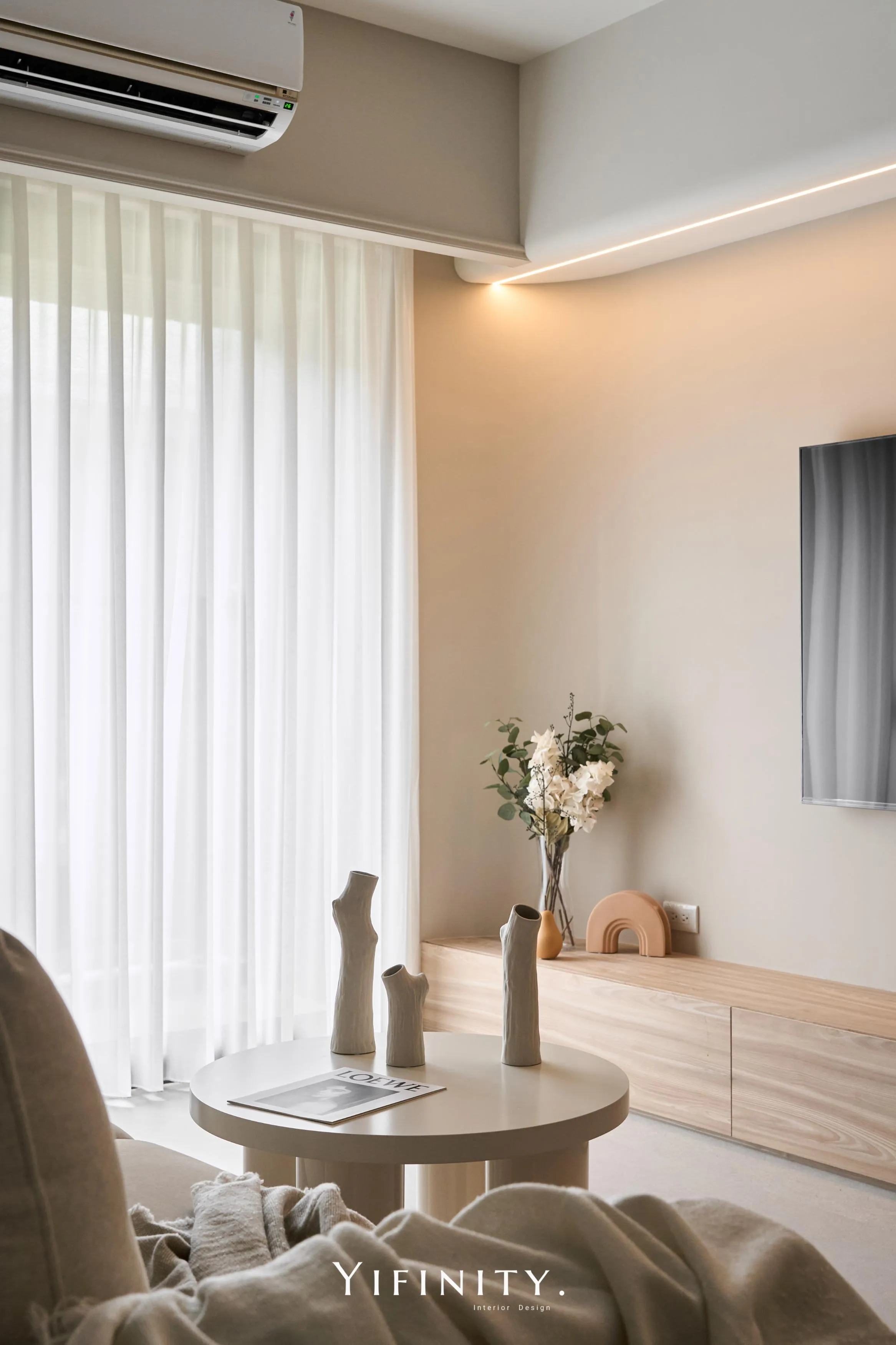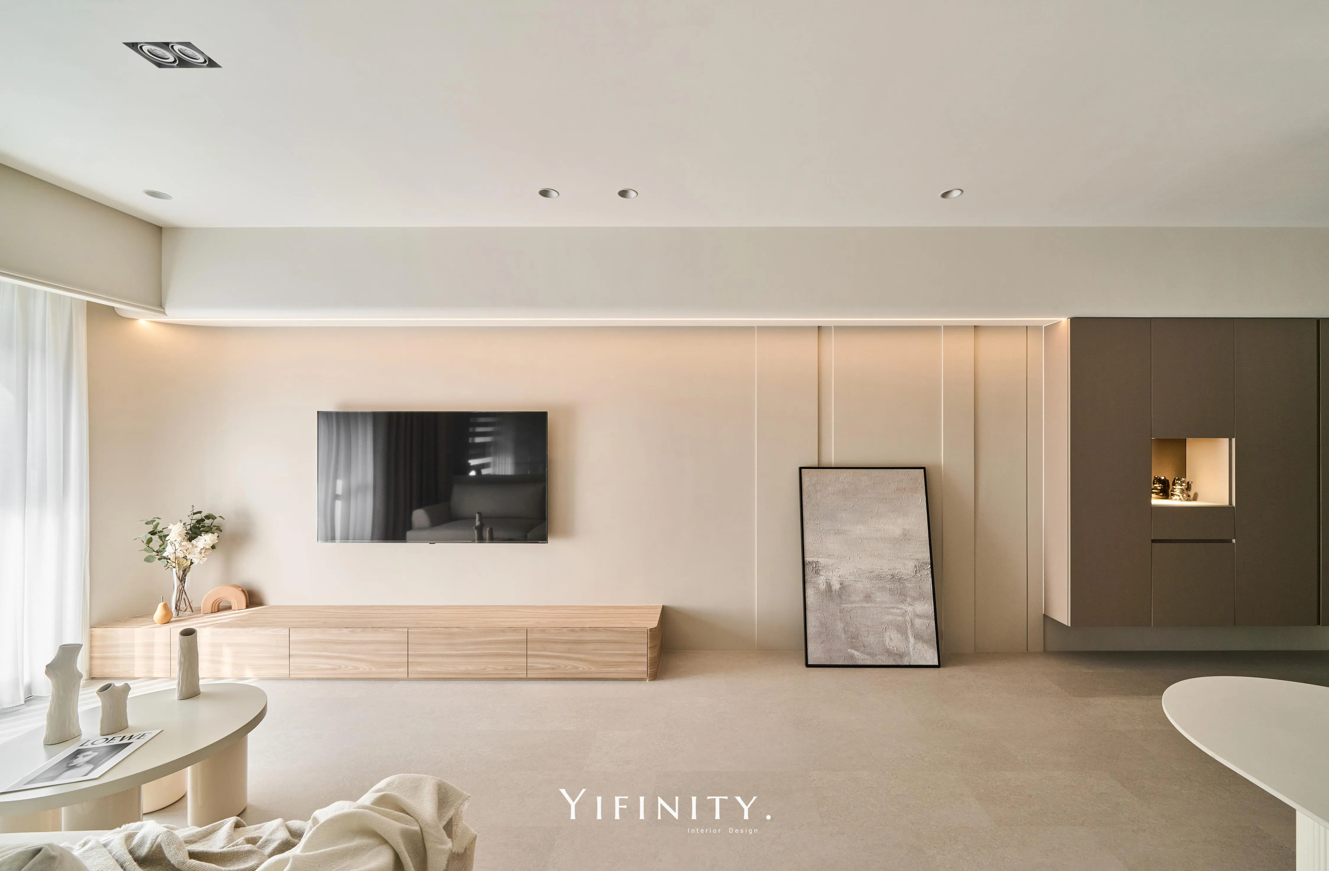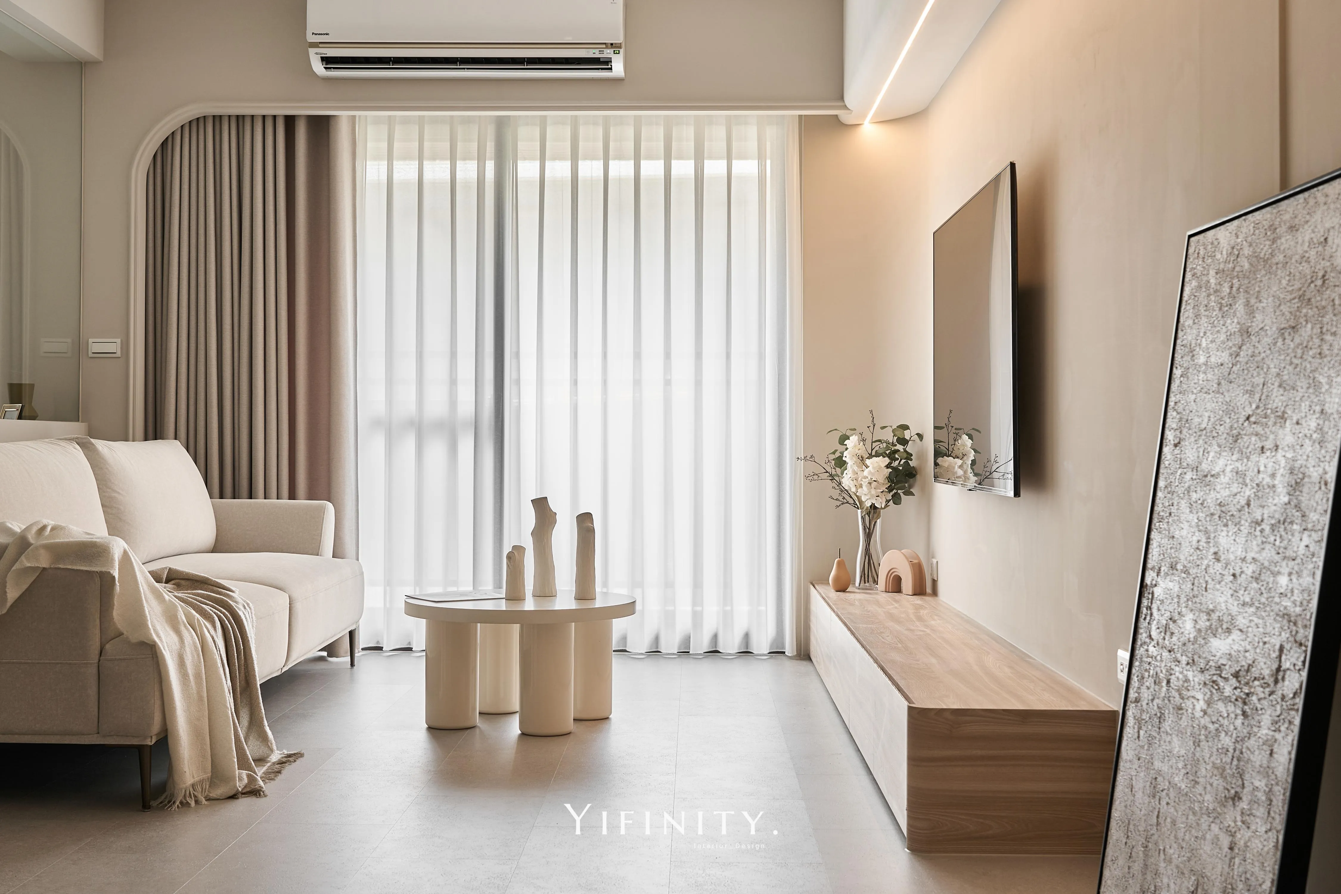 若家有顏色,那應該是一杯溫熱奶茶的色澤。 以弧線語彙修飾天花板邊界,撫平了日常的毛躁。 客廳與書房之間,通透的玻璃取代實牆,創造出最不打擾的陪伴; 讓視線得以延伸,光線亦能自由漫遊。 無論身處沙發一隅或書房午後,家人間的眼神總能在此溫柔交會。