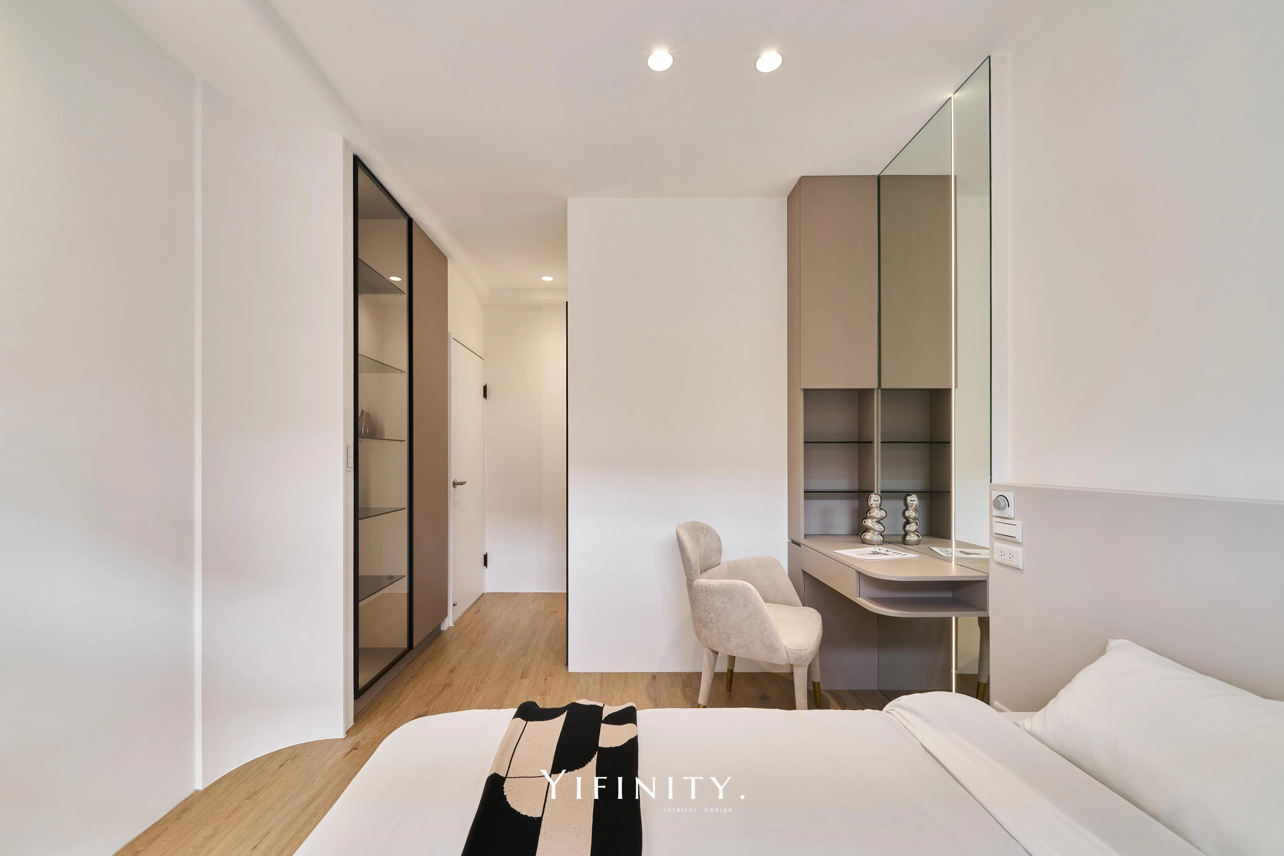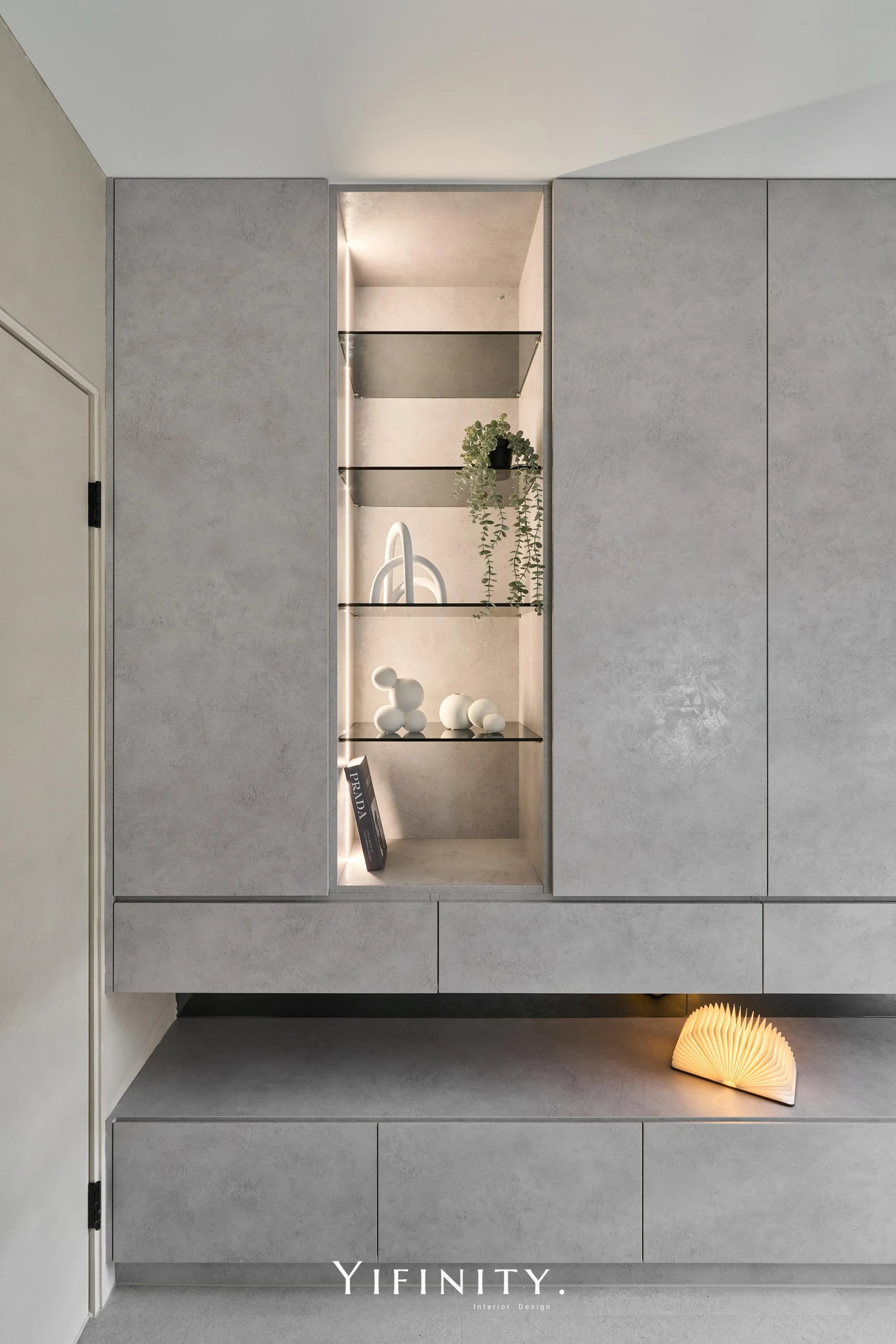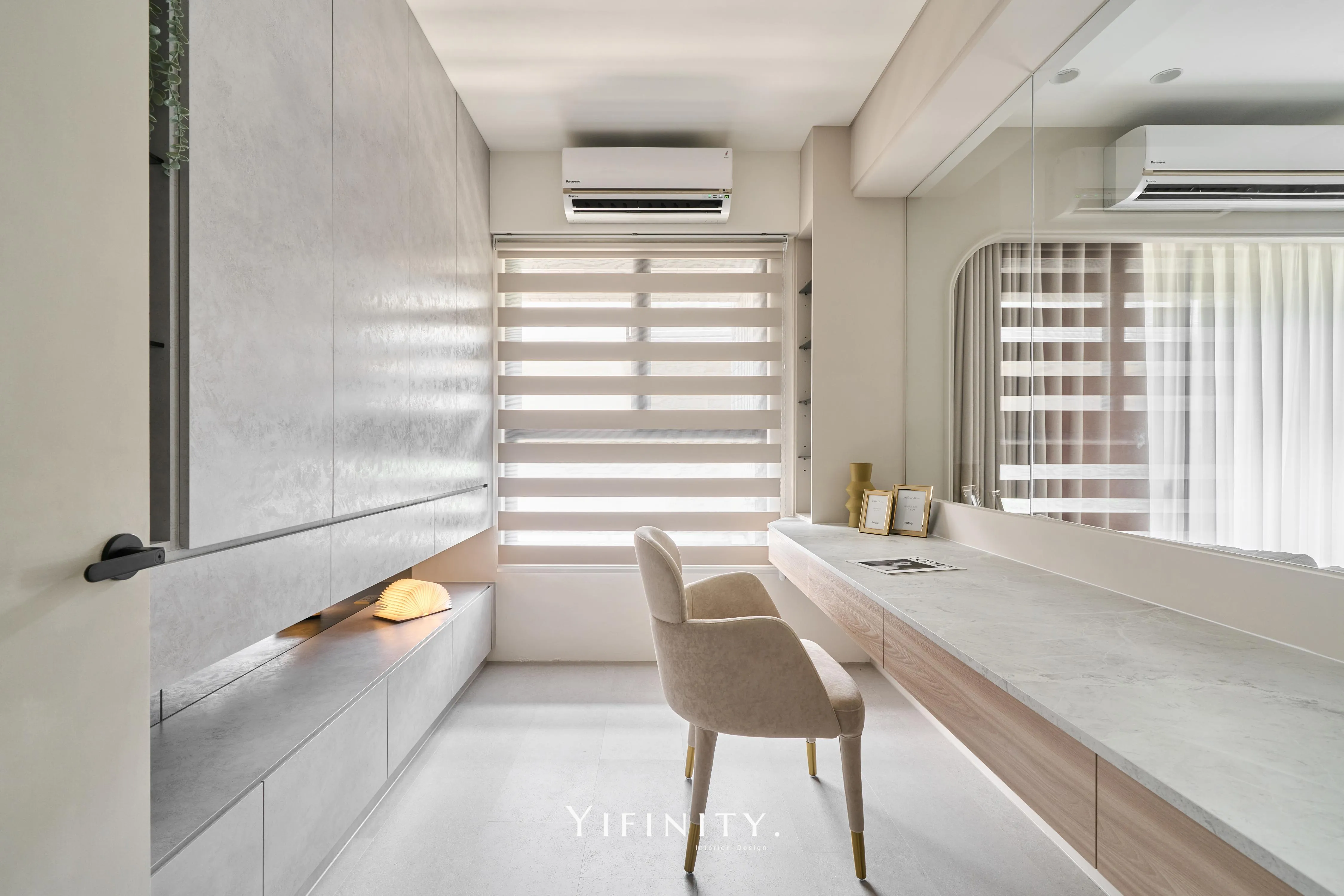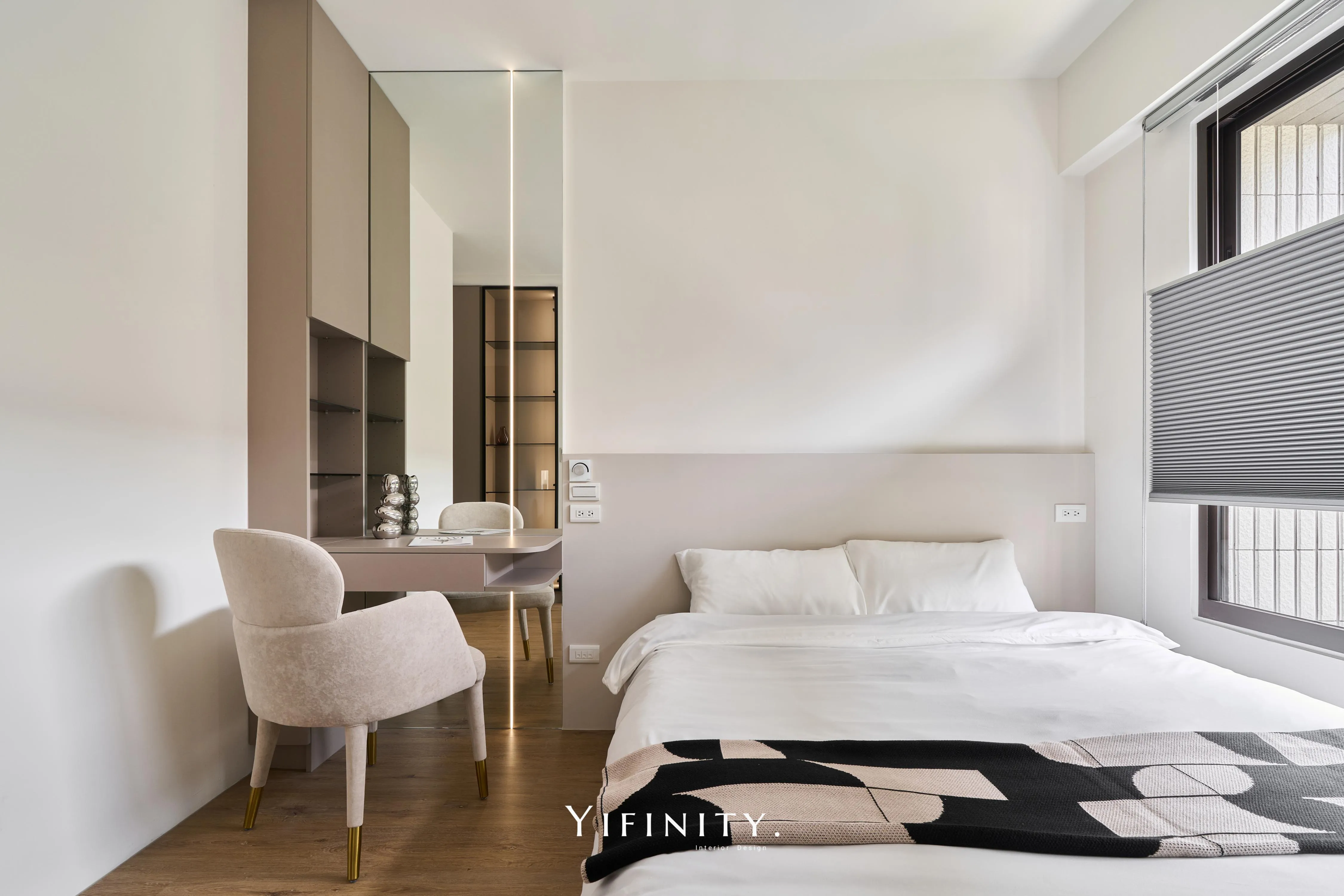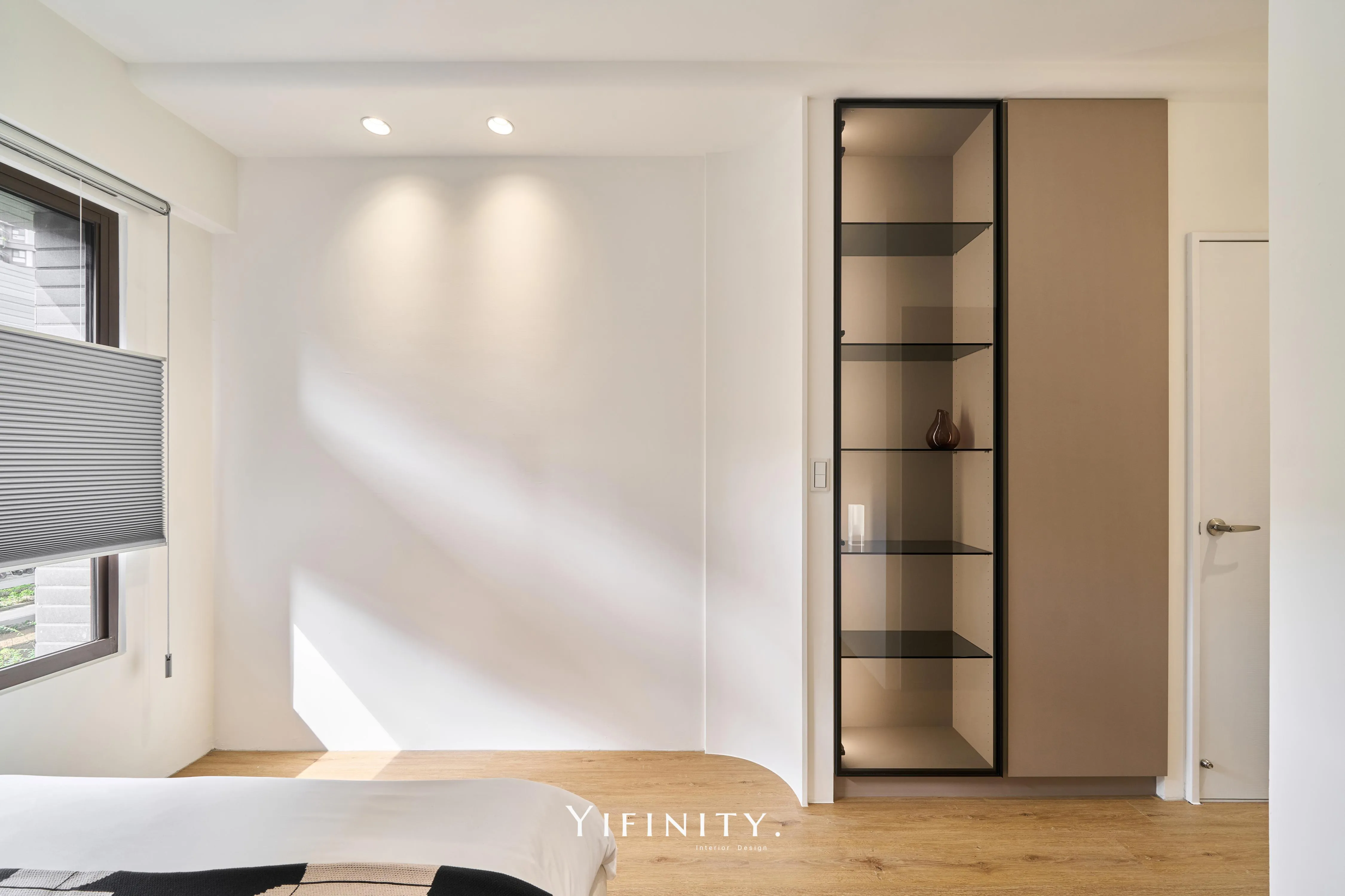 若家有顏色,那應該是一杯溫熱奶茶的色澤。 以弧線語彙修飾天花板邊界,撫平了日常的毛躁。 客廳與書房之間,通透的玻璃取代實牆,創造出最不打擾的陪伴; 讓視線得以延伸,光線亦能自由漫遊。 無論身處沙發一隅或書房午後,家人間的眼神總能在此溫柔交會。