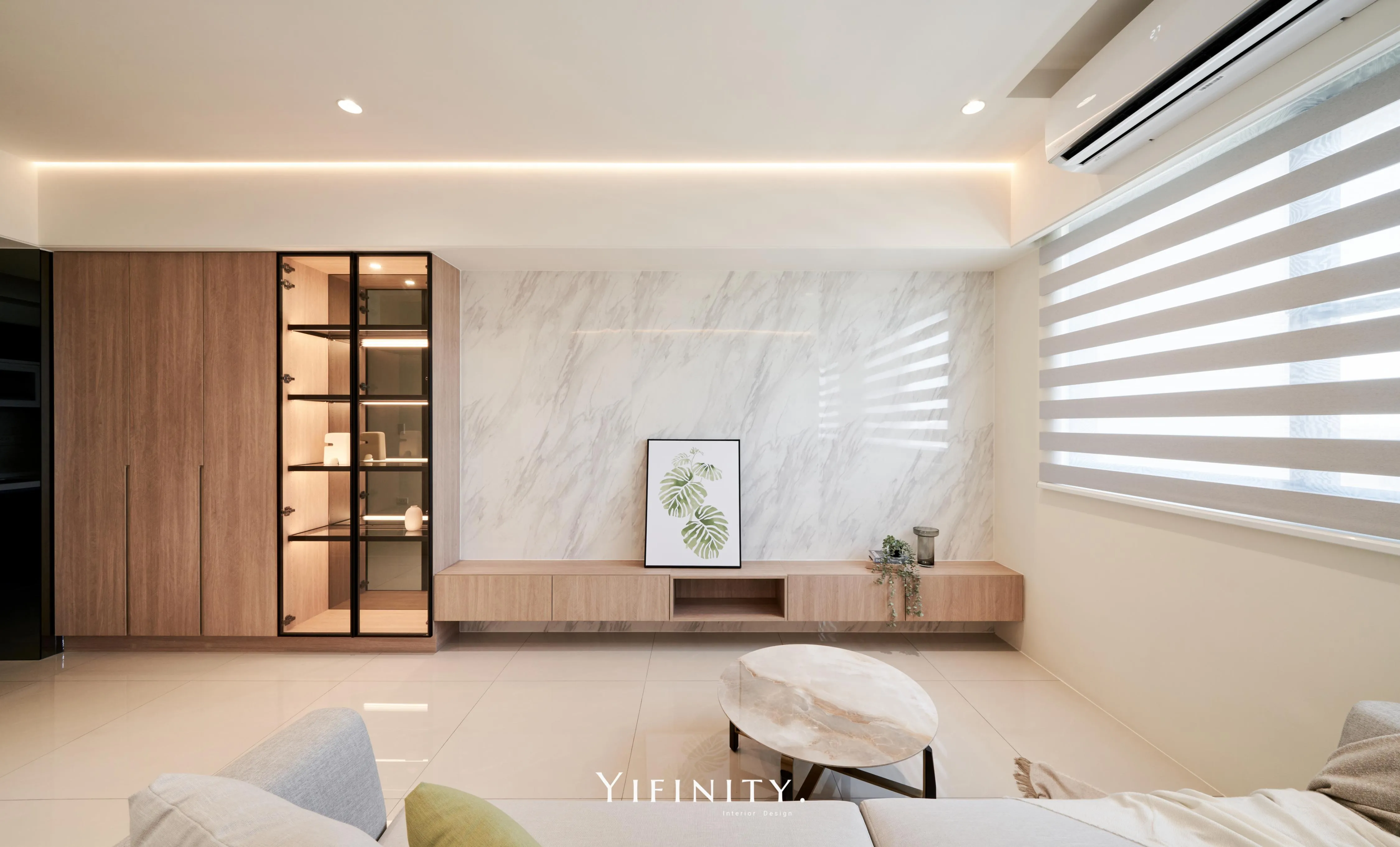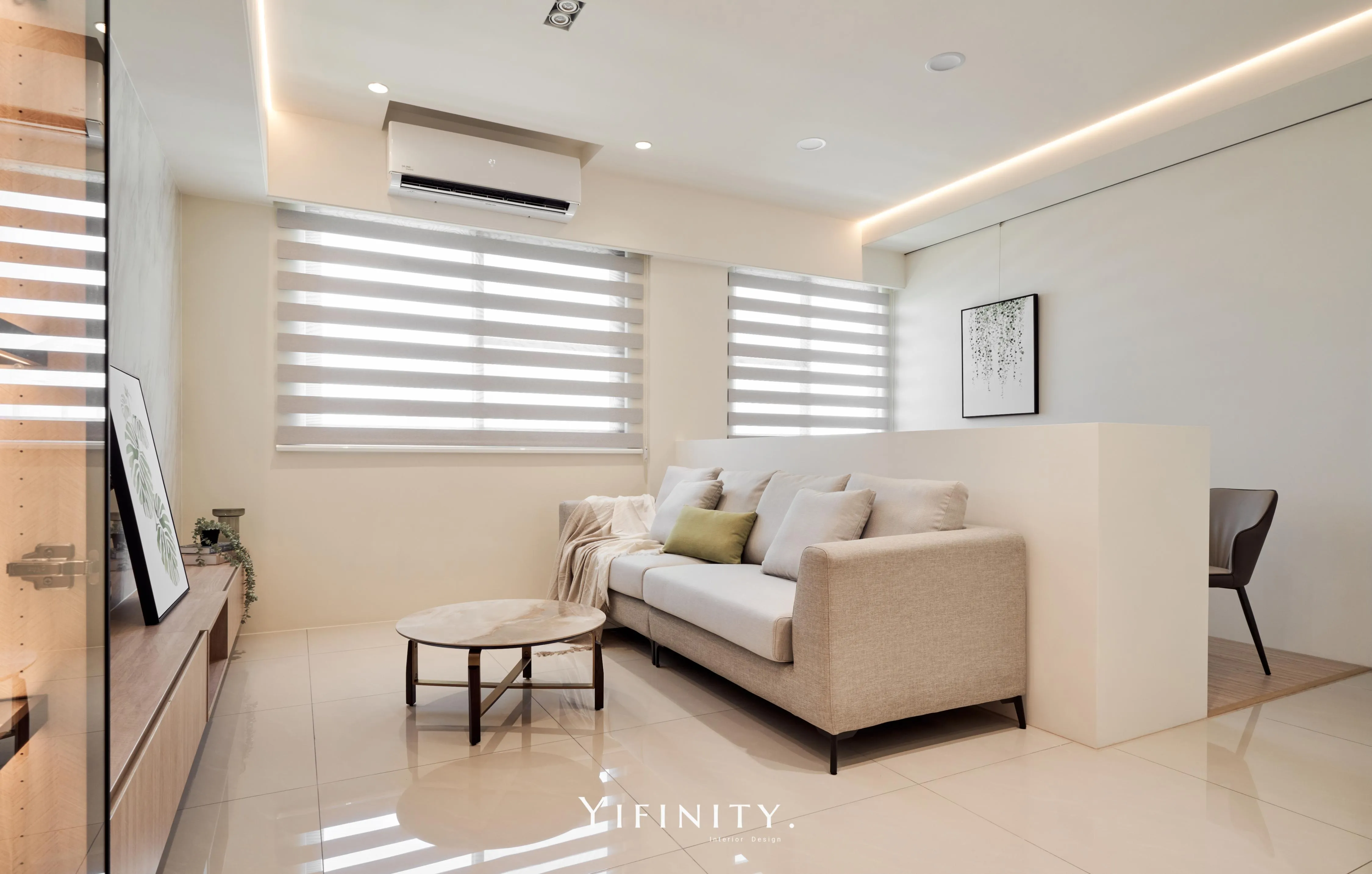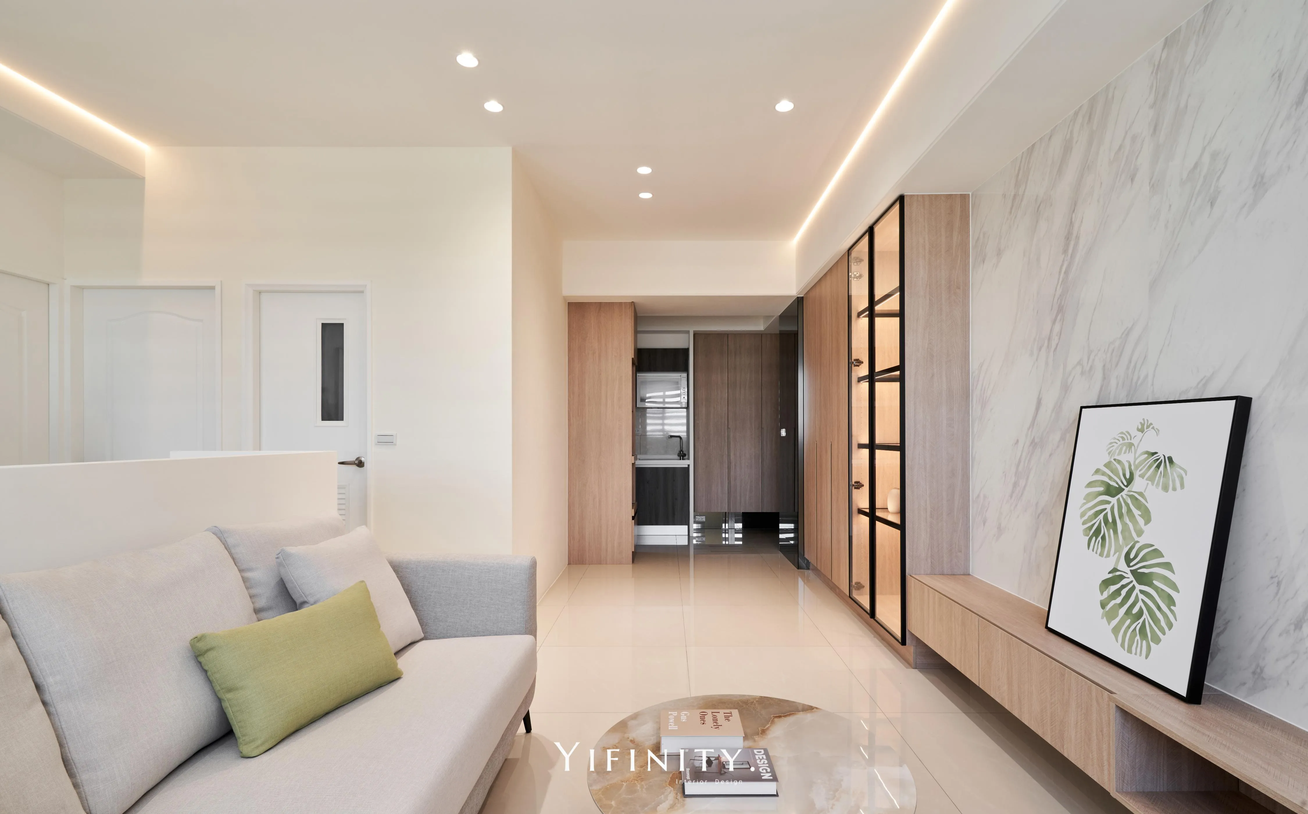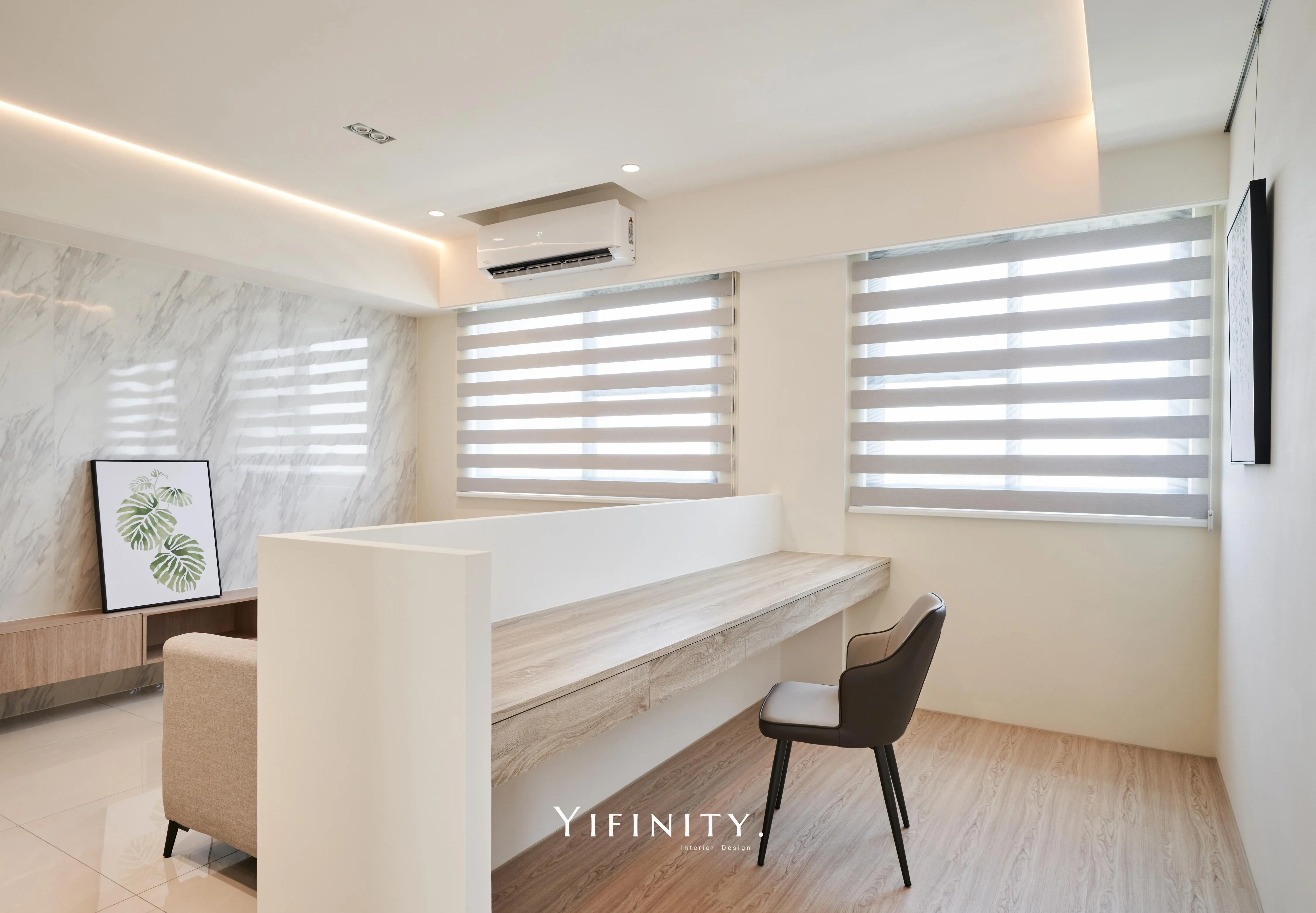 我們用「留白」拉開空間的尺度,用「光帶」把情緒收好。 石紋主牆定下畫面重心,木作長櫃把收納一次整理到位;天花線性光藏進收邊,讓亮度均勻、不刺眼。 再用半高牆把客廳與書桌區輕輕分開——通透感還在,機能也完整了。 想要的不是很滿,而是剛剛好。 清爽、耐看、好整理,住進去每天都會更輕鬆。