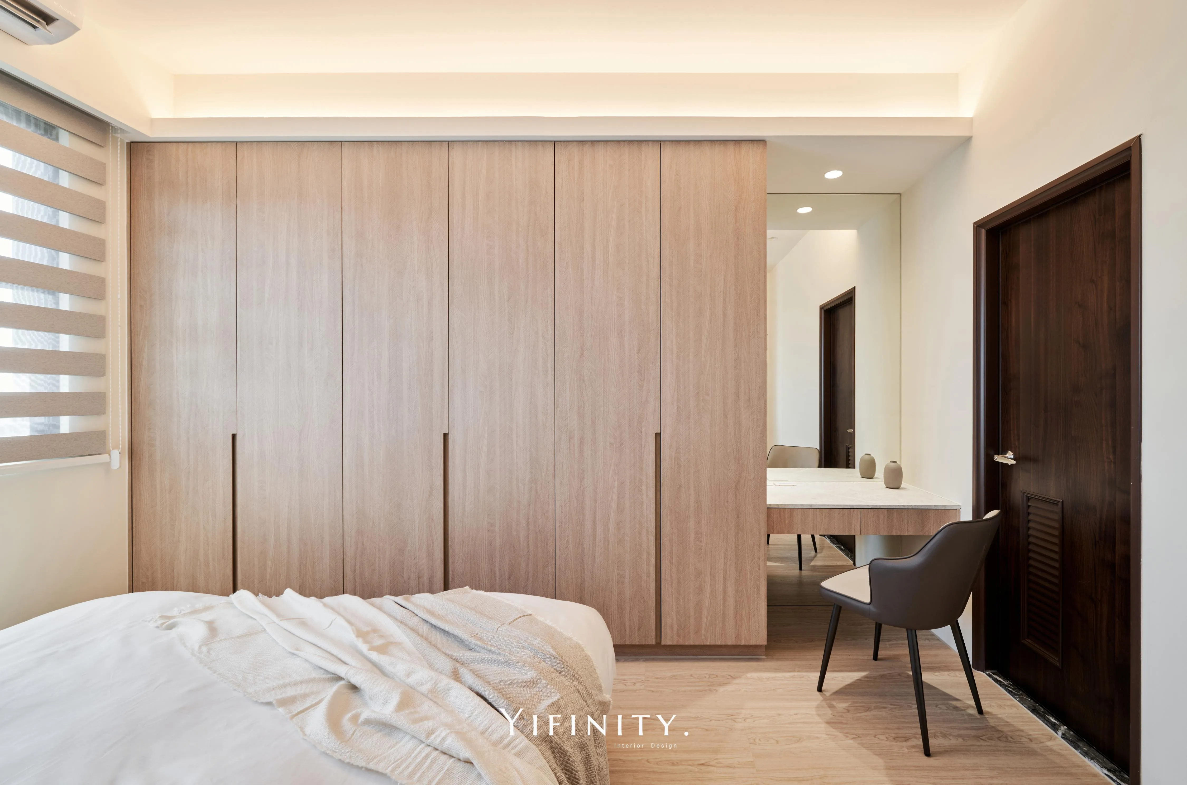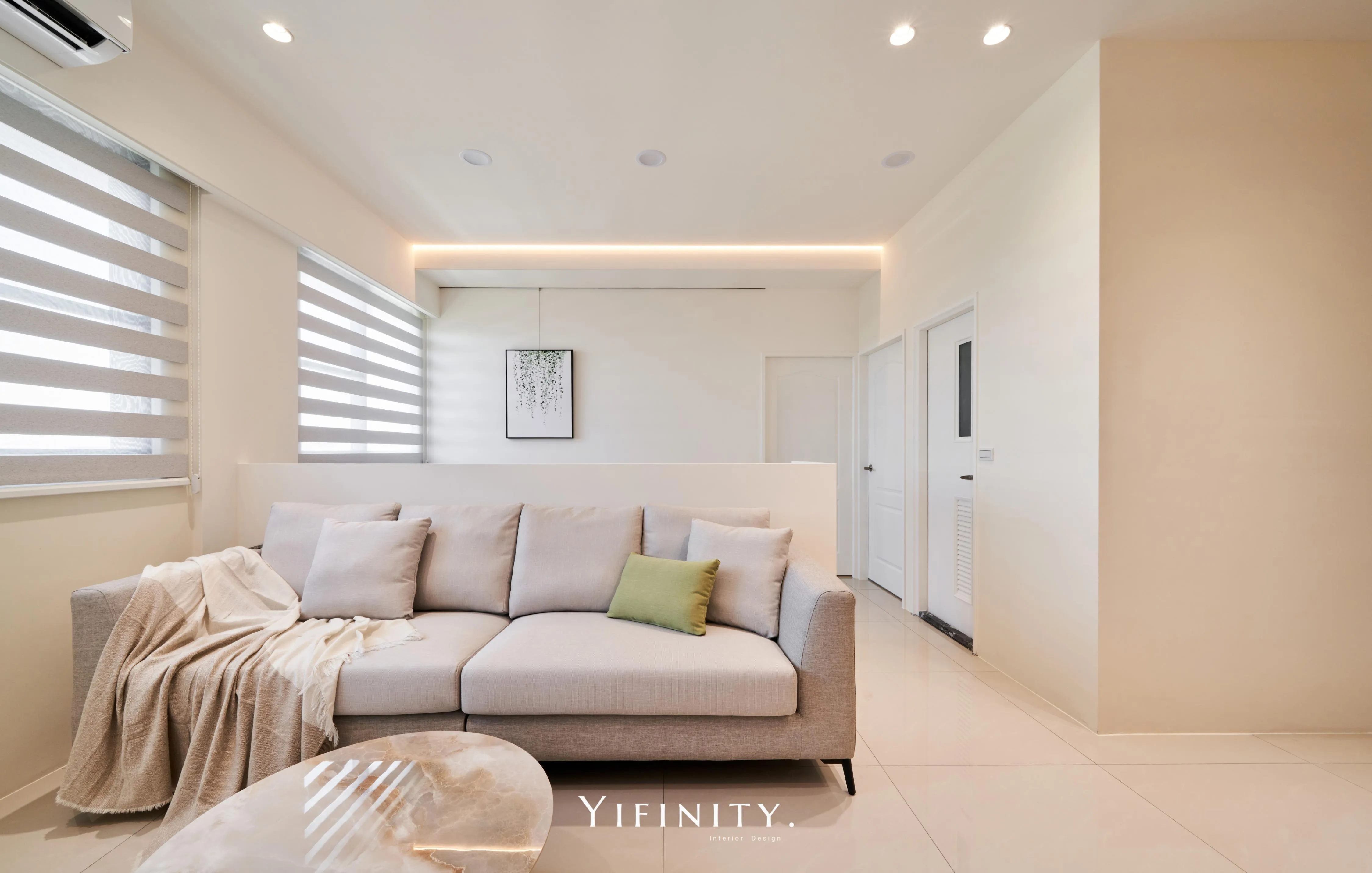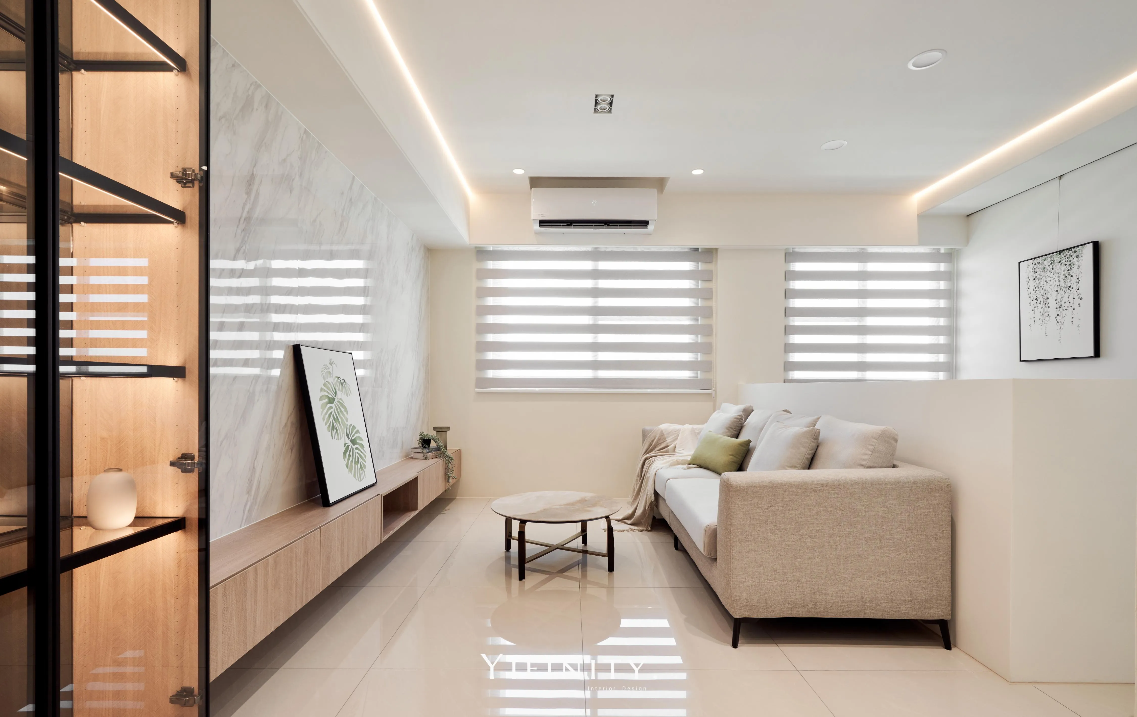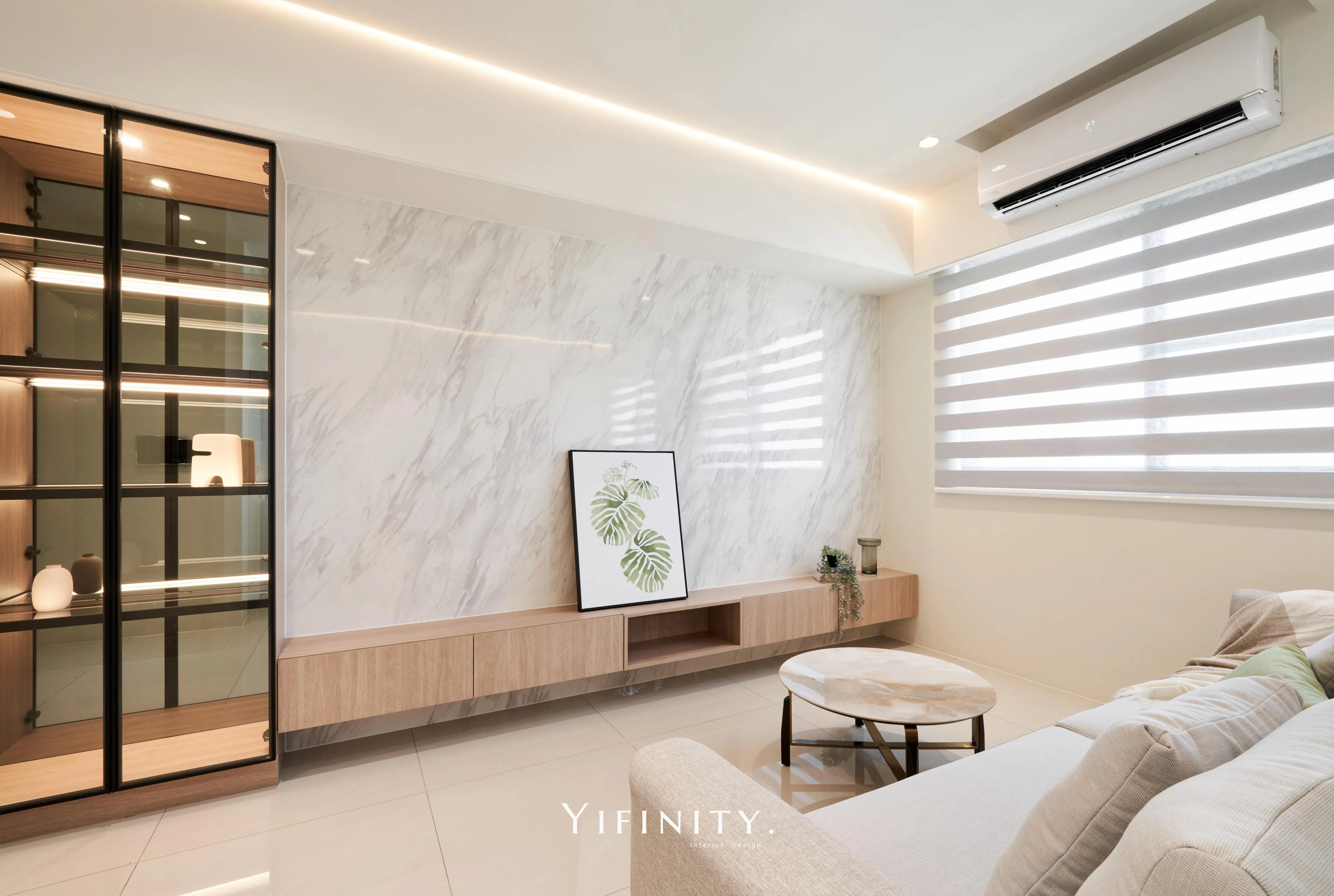 我們用「留白」拉開空間的尺度,用「光帶」把情緒收好。 石紋主牆定下畫面重心,木作長櫃把收納一次整理到位;天花線性光藏進收邊,讓亮度均勻、不刺眼。 再用半高牆把客廳與書桌區輕輕分開——通透感還在,機能也完整了。 想要的不是很滿,而是剛剛好。 清爽、耐看、好整理,住進去每天都會更輕鬆。